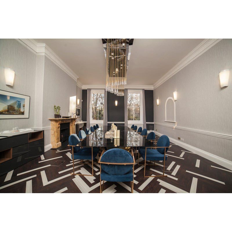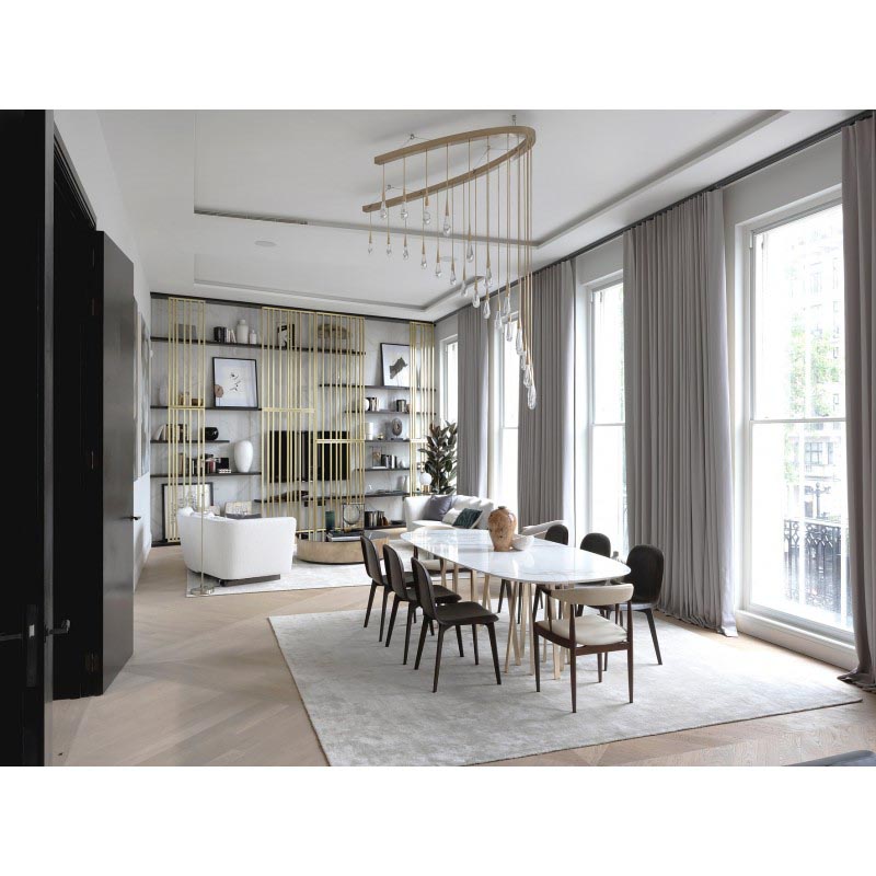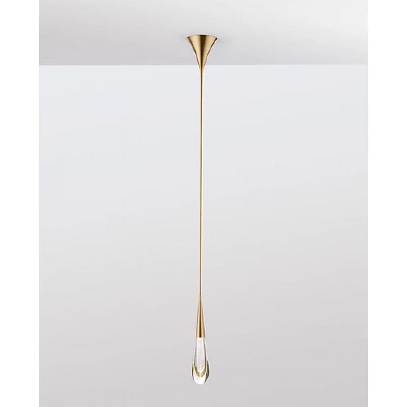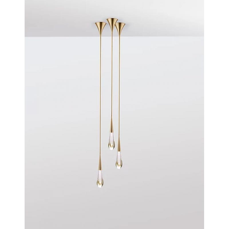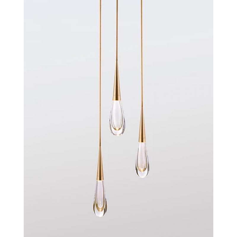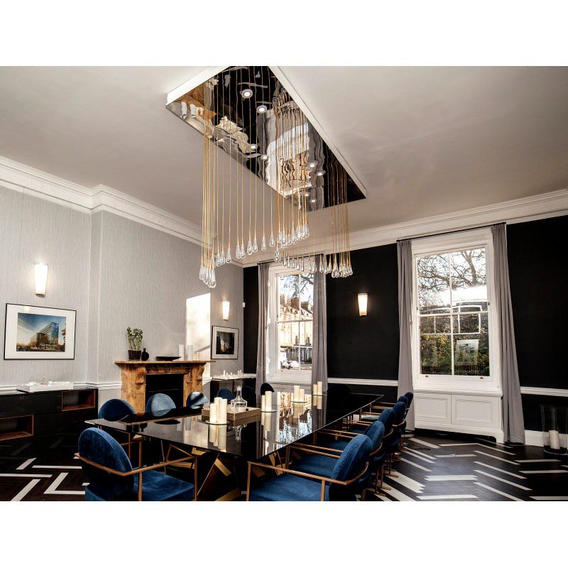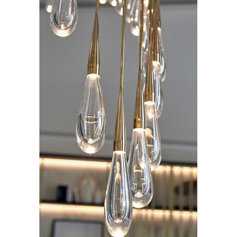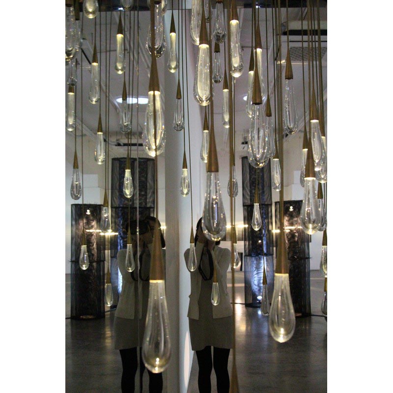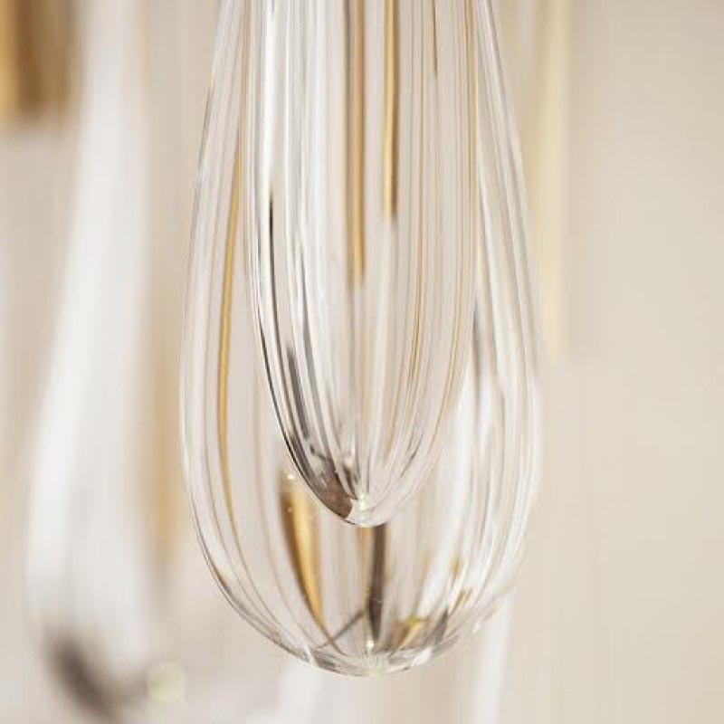 The light installation is a teardrop-shaped chandelier with deliciously unique lights that celebrate the fascinating nature of raindrops, where no drop is the same as the next. Each drop is hand-blown by artisans and intricately engineered to house the lighting strategy for the chandelier. When you see a light sculpture designed to increase the visual appeal of a room and define its luminous character, you stop on your way to admire it. It’s the case of the Raindrop chandelier known as “The Pour”, a modern light sculpture meant to illuminate and beautify its chosen location to create an architectural relationship with space. The drop itself is constructed of two parts: the brass screw cap, which houses the light, and the hand-blown crystal reflecting the light to create puddles on the floor below. To replicate the nature of raindrops, no two drops are blown identical. The name “The Pour” derives from the distinctive shape that the chandelier forms: an exaggeration of the dramatic motion of water pouring out of a carafe. Designed by forming a grid mimicking how puddles ripple outward in concentric circles, each teardrop is hung to brass pipes of varying lengths. Placed strategically on the grid, the teardrops lock into the mirrored base that fits seamlessly between the two existing columns. The mirrored base reflects the teardrops endlessly into the sky above and when lit. The chandelier echoes rain frozen in time with ephemeral puddles overlaid on the floor below.