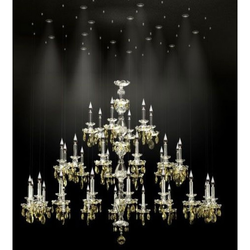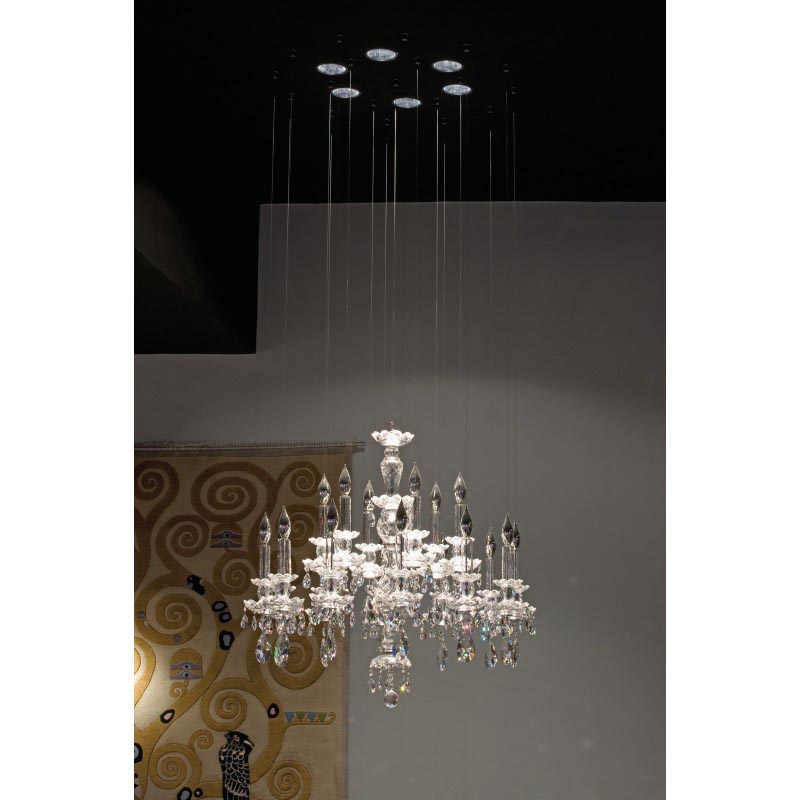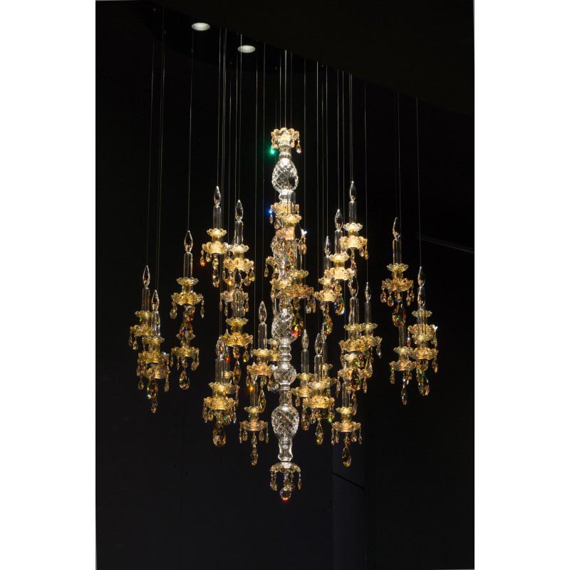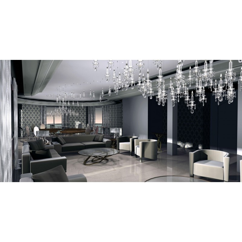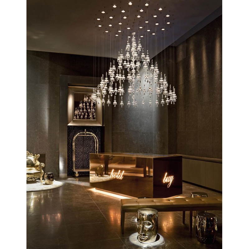 At the first glance a classic chandelier, but at the second sight it reveals the real spirit, the lightness and total freedom of composition. Flying candles, free floating, without any disturbing frame and light bulbs. Heavy crystal strass elements, especially made for Windfall by Swarovski, combined with hand-made gold- or silver-plated mouth blown candles, catch the light from the downlights above and radiate the light, sparkling. This design combines both worlds, classic and modern, and looks great in any interior. The Balances can fill an entrance hall, fly along hallways, descend in multiple stairways or just line up above a dining table.