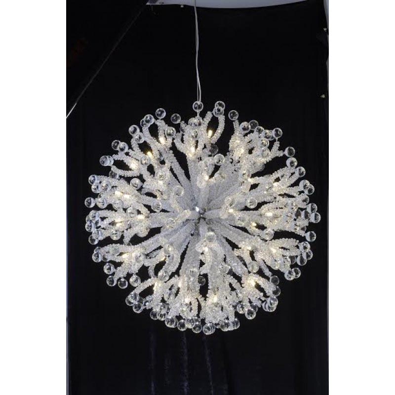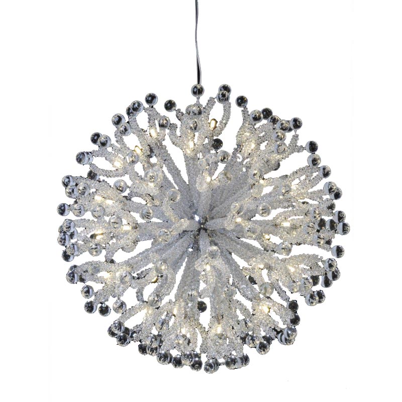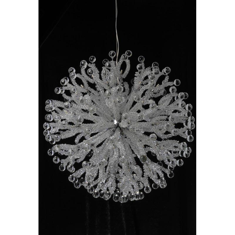This piece features long coiled branches of beautifully crafted round Murano glass balls that flow on wildly angled branches throughout the entire piece. These pieces look like frozen snow clusters glistening in the sun on a frigid, but invigorating winter day. Every inch of the fixture itself, minus the steel frame, is covered in these pristine, clear, flawlessly placed pieces, for a look that is truly an eye-catching and one to savor for years to come.