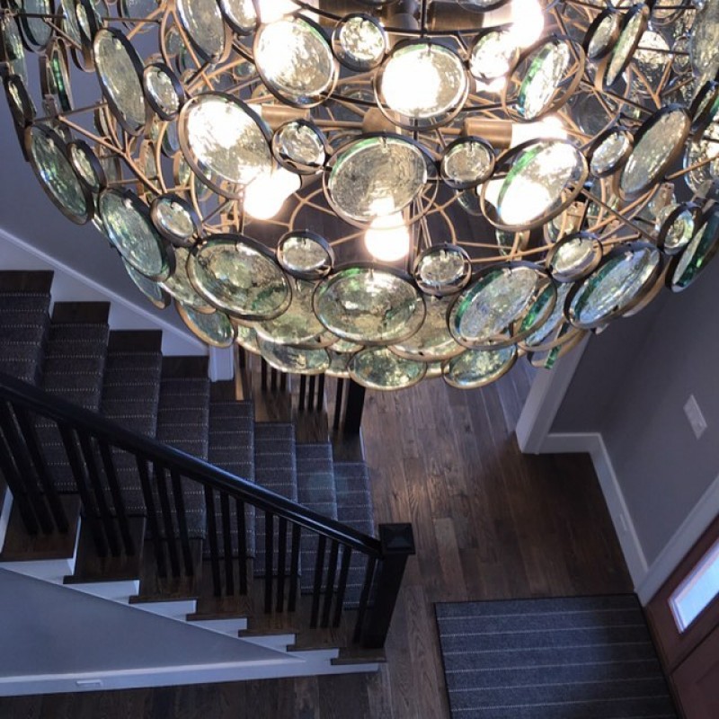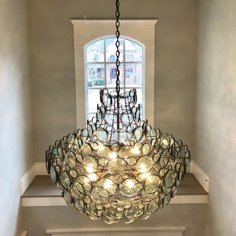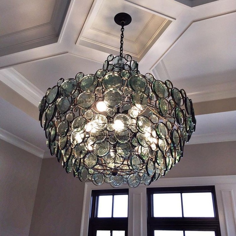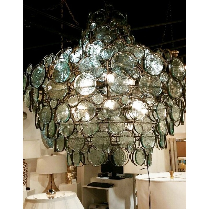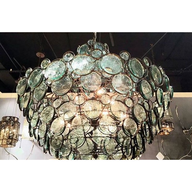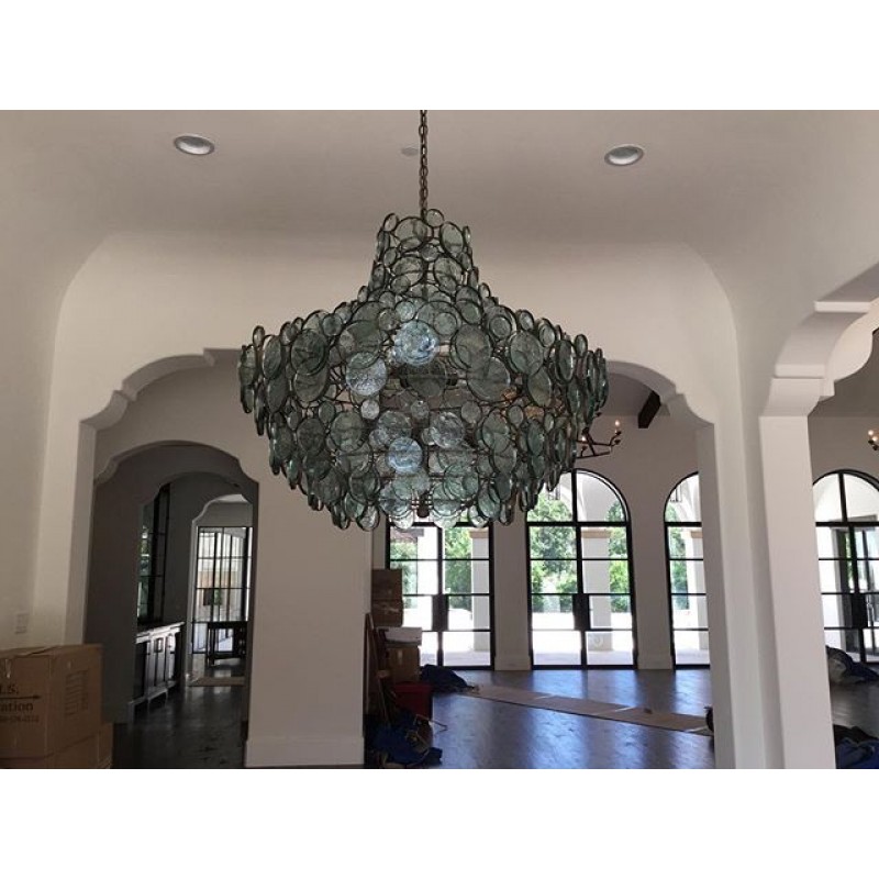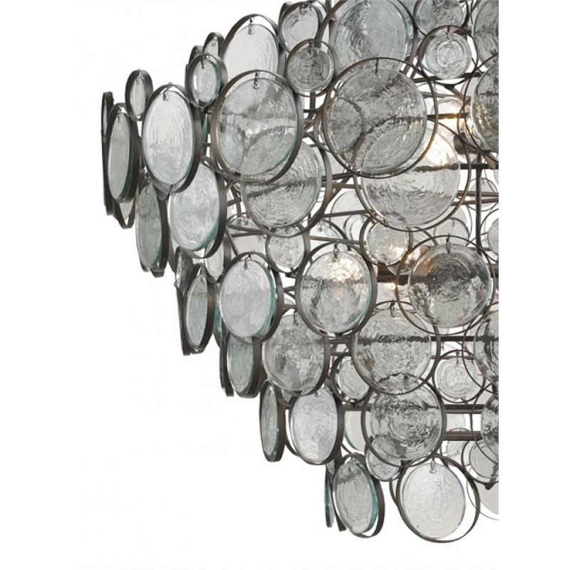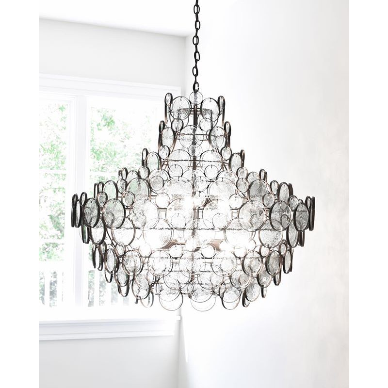 Myriad recycled, recast glass discs are individually attached by hand to hang from an immense wrought iron frame finished in bronze to make the shapely 12-light Galahad Chandelier a true statement piece. The ample charm of the fixture is heightened by the glass, as the light source travels around the shade to glint through each one of the discs depending upon the position from which it is viewed. At Alan Mizrahi Lighting Design, we supply and manufacture many highly sought after designer pieces, so if there is any designer fixture you are intrigued by or have your heart set on, let us know.