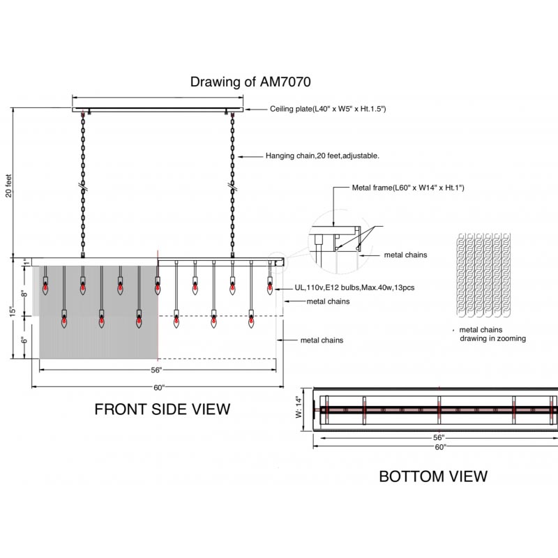 Ceiling: 2-Hanging Chains, adjustable 20 feet long