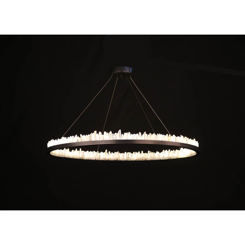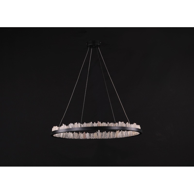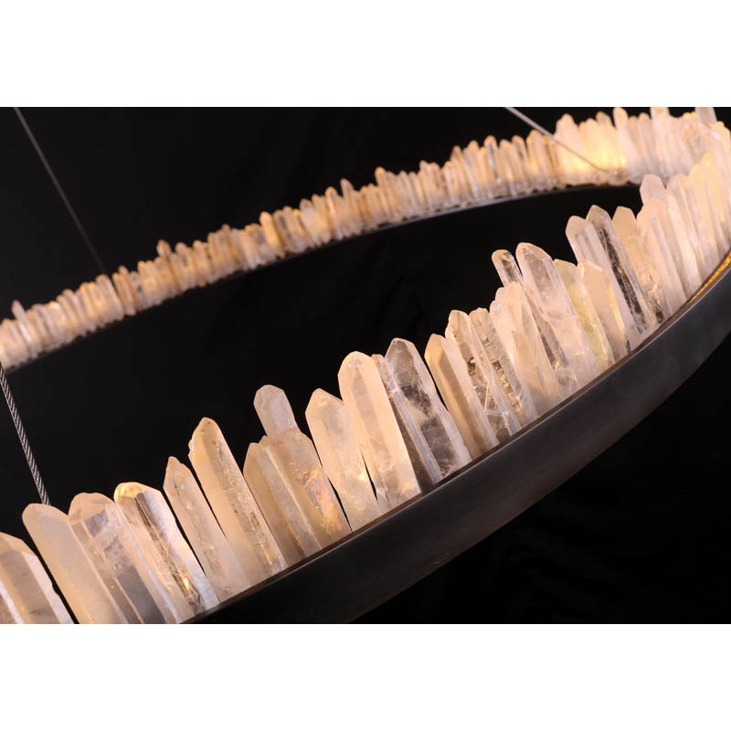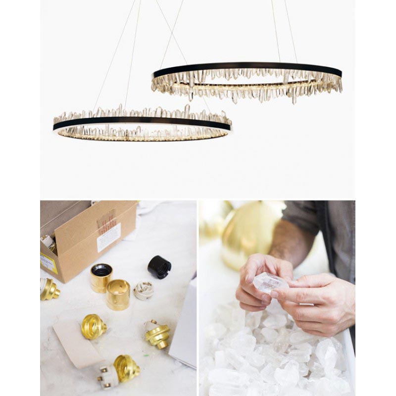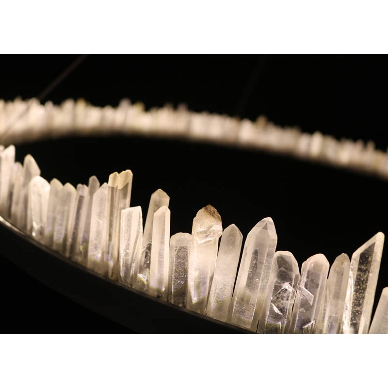 The ancient Greek, Prometheus, gave to mortals what was re-served for the gods “fire”. Here, a simple yet elegant construction creates a timeless light – a ring of ‘ flames’. With the gift of fire, Prometheus allowed humanity to develop… Simple yet elegant construction with warm white LED, natural uncut quartz crystals attached* with rare earth magnets, and a classic bronze ring, creates a timeless light. Greek philosophy’s quest was to distill all things to their essence, their most elemental. Whether in Euclid’s elements of geometry or Democritus’ first concept of the atom, Greek thought explored the possibilities of nature’s abstracted and universal essence. Naturally occurring quartz crystals appear to have grown by Mother Nature, and lit themselves from the inside, illustrating an explorations of pure natural expression. Quartz crystals point up like a crown. Prometheus II Quartz crystals point down like the Sword of Damocles. All crystals will differ in size, shape and scale with every fixture. At Alan Mizrahi Lighting Design, we supply and manufacturer many highly sought after designer pieces, All Chandelier can be customized by number of lights, style, color and size to meet your specific needs. Every chandelier can also be combined with a matching table lamp and wall lamp to accomplish the best room design.