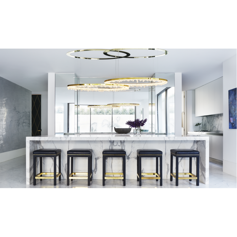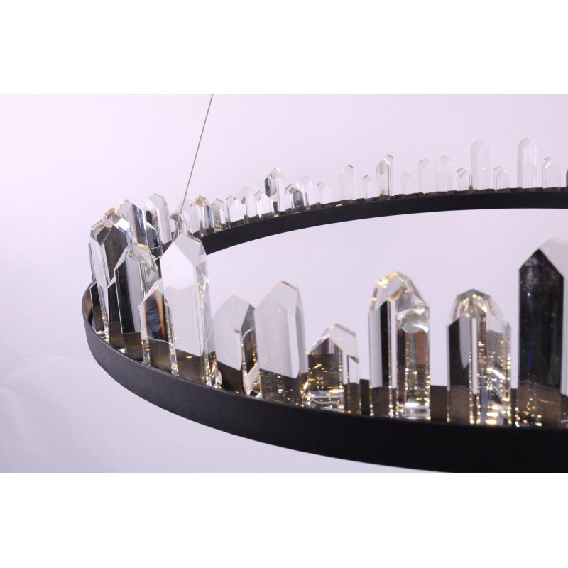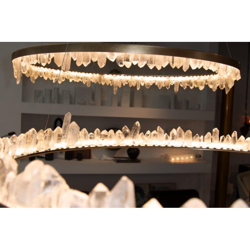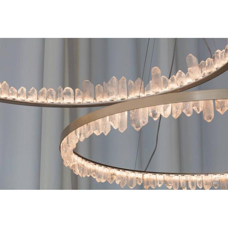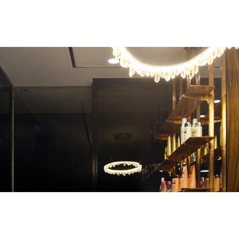The ancient Greek, Prometheus, gave to mortals what was re-served for the gods “fire”. Here, a simple yet elegant construction creates a timeless light – a ring of ‘ flames’. With the gift of fire, Prometheus allowed humanity to develop… Simple yet elegant construction with warm white LED, natural uncut quartz crystals attached* with rare earth magnets, and a classic bronze ring, creates a timeless light. Greek philosophy’s quest was to distill all things to their essence, their most elemental. Whether in Euclid’s elements of geometry or Democritus’ first concept of the atom, Greek thought explored the possibilities of nature’s abstracted and universal essence. Naturally occurring quartz crystals appear to have grown by Mother Nature, and lit themselves from the inside, illustrating an explorations of pure natural expression. Quartz crystals point up like a crown. Prometheus II Quartz crystals point down like the Sword of Damocles. All crystals will differ in size, shape and scale with every fixture. At Alan Mizrahi Lighting Design, we supply and manufacturer many highly sought after designer pieces, All Chandelier can be customized by number of lights, style, color and size to meet your specific needs. Every chandelier can also be combined with a matching table lamp and wall lamp to accomplish the best room design.