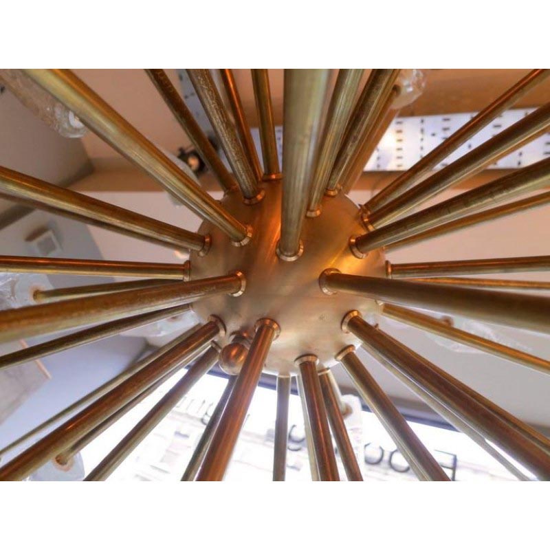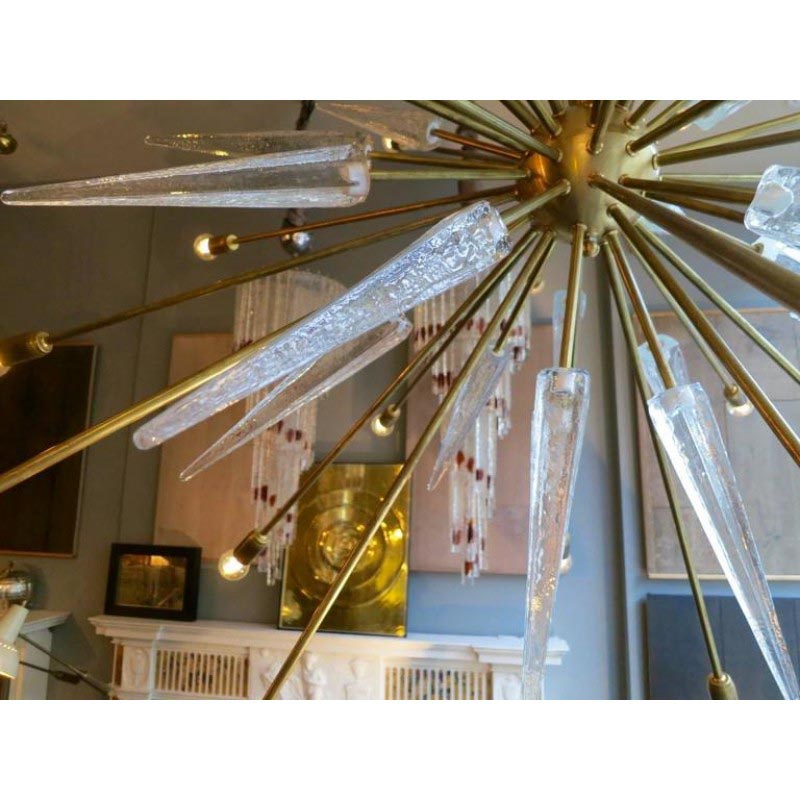 An oversized sputnik chandelier. In typical Mid-Century style with 30 bulb arms and thick glass spiked mounts. A good quality contemporary decorative piece.