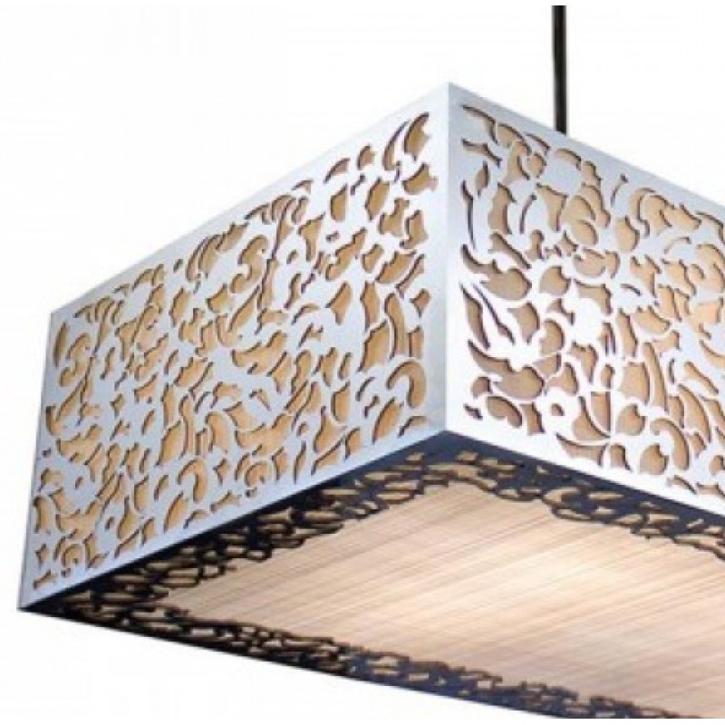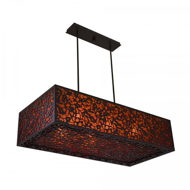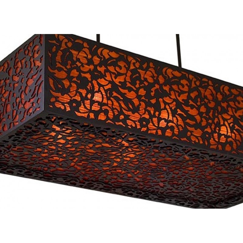Beautiful, boxy laser cut detailing on a faux linen stage. This piece combines simplicity with intricate detailing together in a harmonious duet. Beautiful center piece about a dining table or to light up a family room.