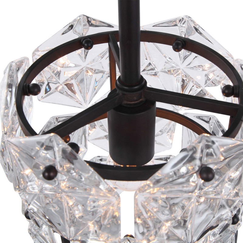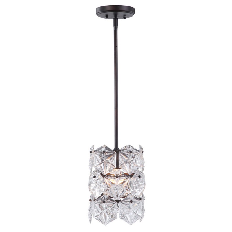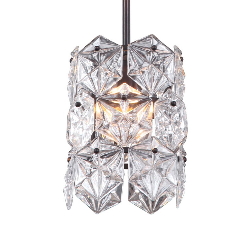 Clear pressed glass gives this mini pendant its sparkle with inspiration and innovation. The body is finished in a complimentary bronze metal finish. Supplied with 1-60 watt max Edison socket, also includes 15' wire, and 3-12" stems & 1-6" stem for adjustable installation. Surprise your guests, employees, or whoever else that may encounter this contemporary and eye-catching fixture that would be a highly impressive focal point in any room you place it. We hope to bring this joy to you and your environment as we ultimately believe that good design should make the world around us a more beautiful and harmonious place to live.