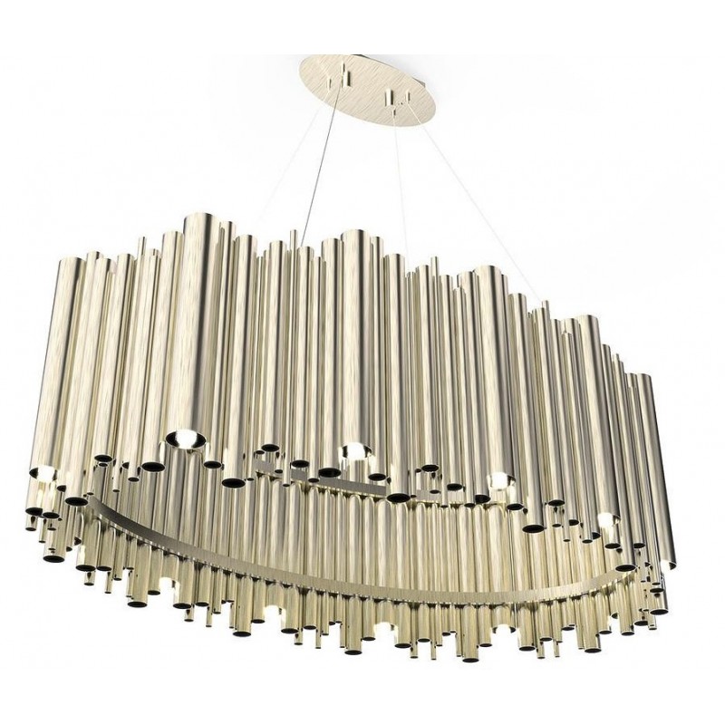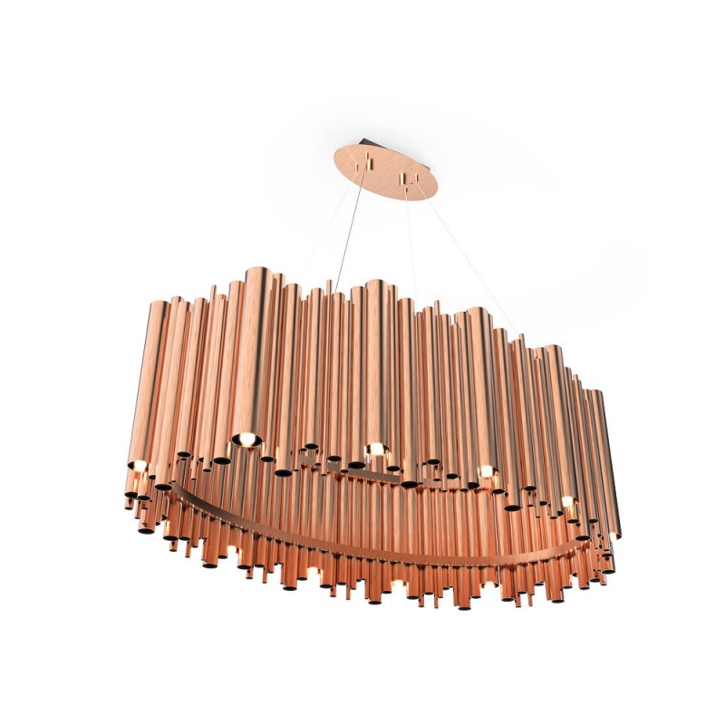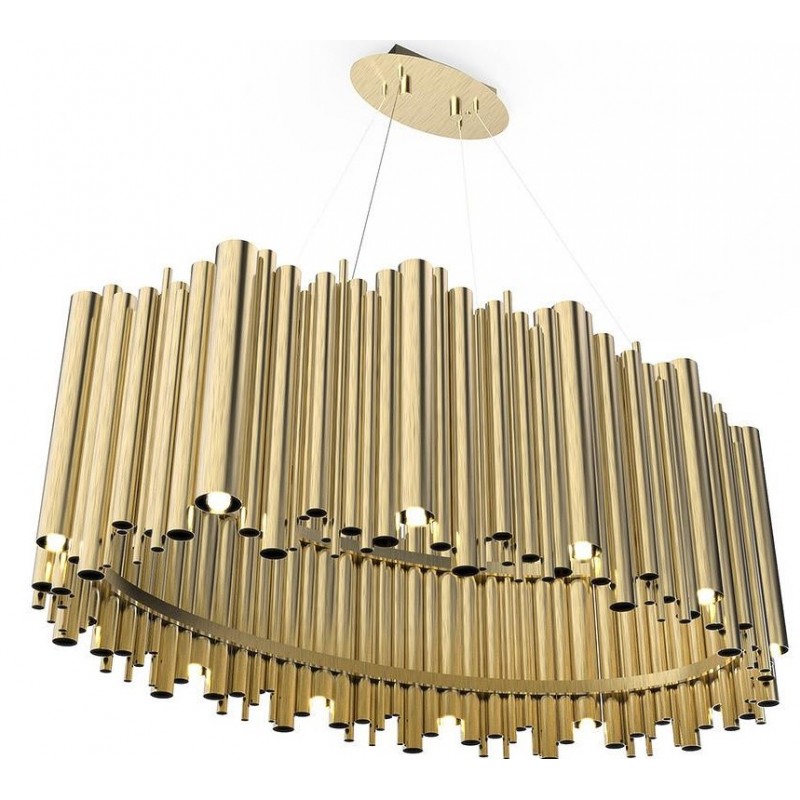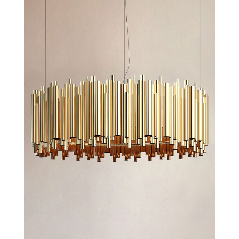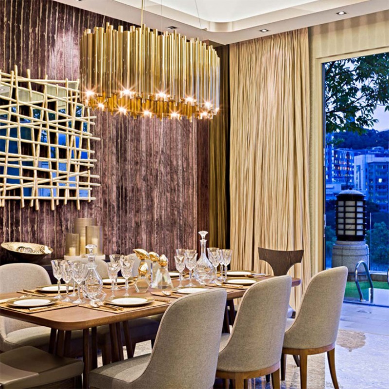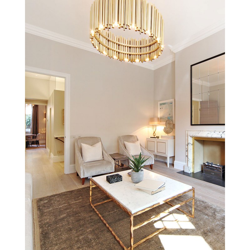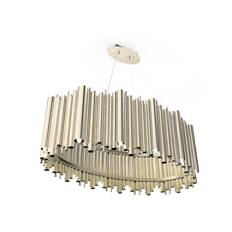 Brubeck mid-century modern chandelier is inspired by one of the foremost exponents of cool jazz: Dave Brubeck. This unique lighting design represents the sophistication and finesse of the American jazz pianist, displaying a very luxurious feeling. Skilled artisans handmake this round chandelier in brass, covering it with a gold-plated finish or customized in multiple other finishes. The result of this outstanding creation is a functional dining room chandelier with sculptural shapes. The key to an elegant, opulent, bespoke design is understanding the aspirations of the client, the relevance of location and through maximizing the potential of existing elements of the space.