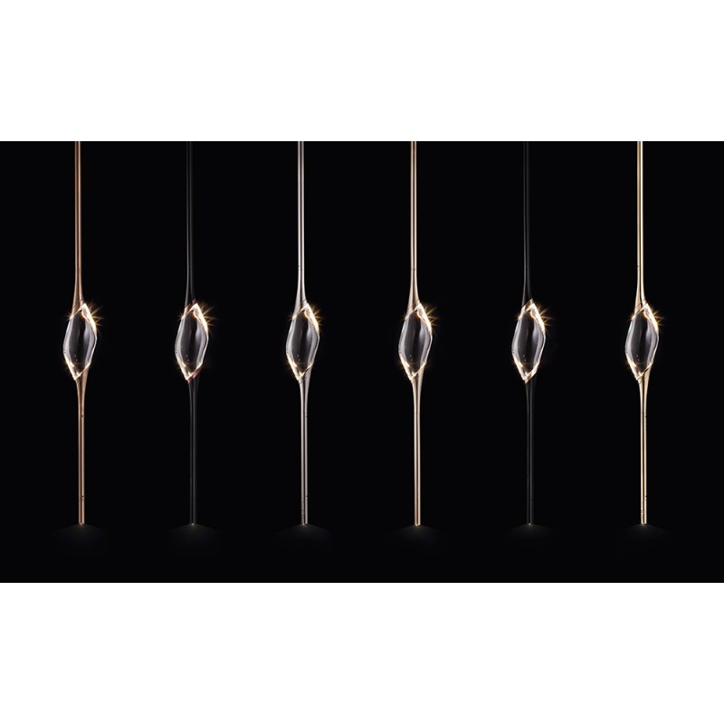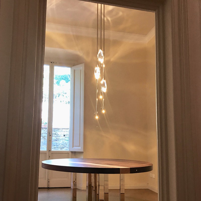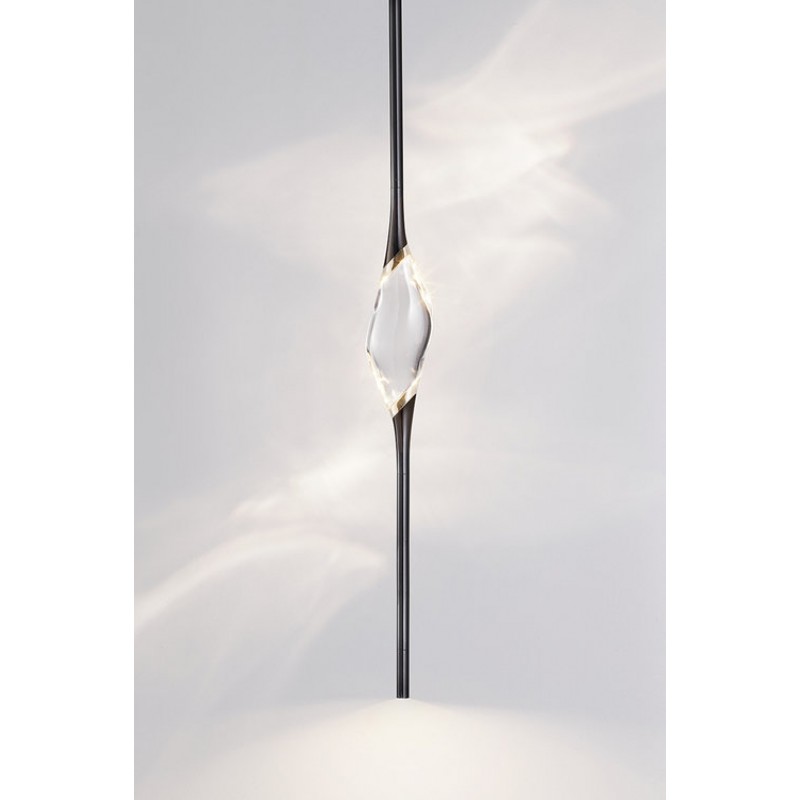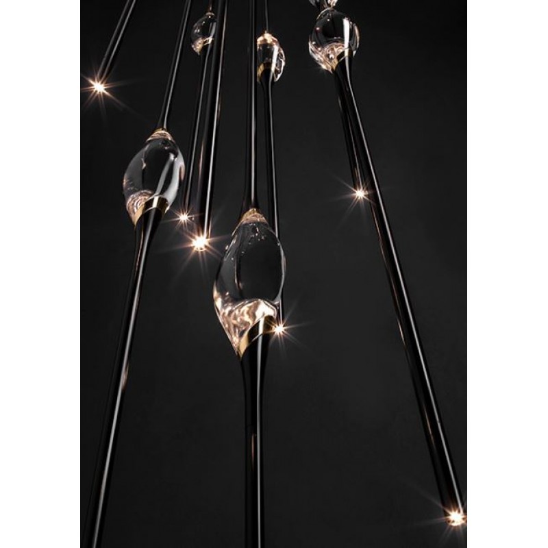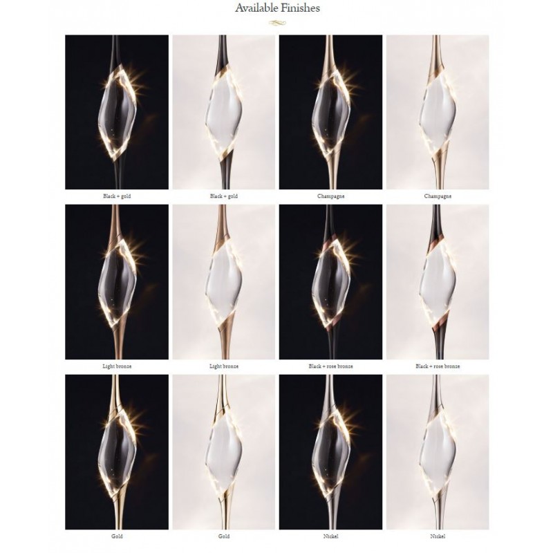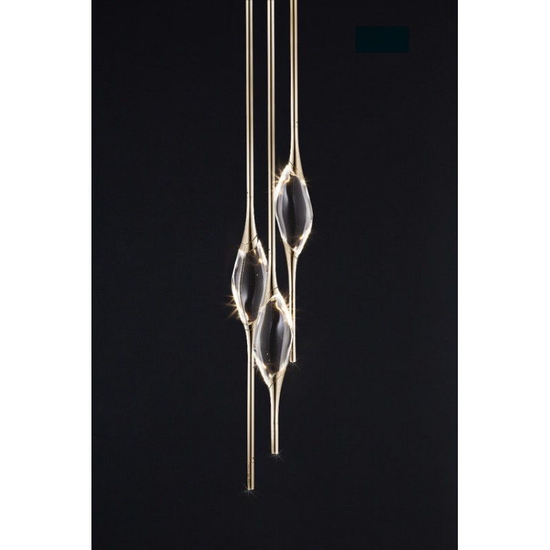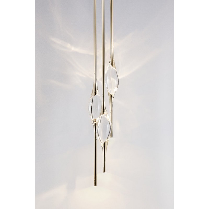 IL Pezzo 12 is a female figure suspended in the air, carrying in her womb the light. It’s nimble, refined, addictive. The solid clearest crystal, illuminated by two LEDs, creates diffused ambient lighting and casts amazing patterns around the room. The crystals are suspended between brass stems and brass casting rings, available in different finishes. At the end of each stem, another LED spreads a direct light. Il Pezzo 12 allows creating clusters able to satisfy the most demanding designs by creating fascinating compositions.