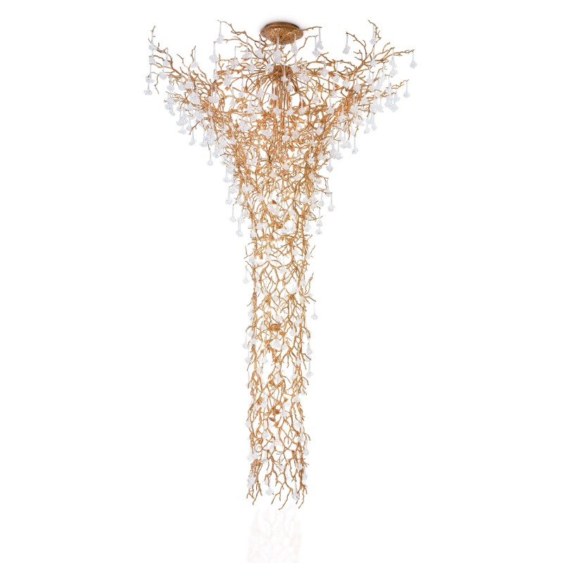 Inspired by the beauty and natural complexity of coral reef shapes, the Coral Collection stands as a dense structure of intertwined metal branches aiming for a faithful representation to its nature and impact. The glass pieces fall into the glimpse of marine organisms in a visual combination of great impression. Dense and robust, this collection integrates a complex system of detail aiming for a differential presence. A luxurious chandelier that provides a soft and warm light through its layers, giving a romantic ambiance to any setting.