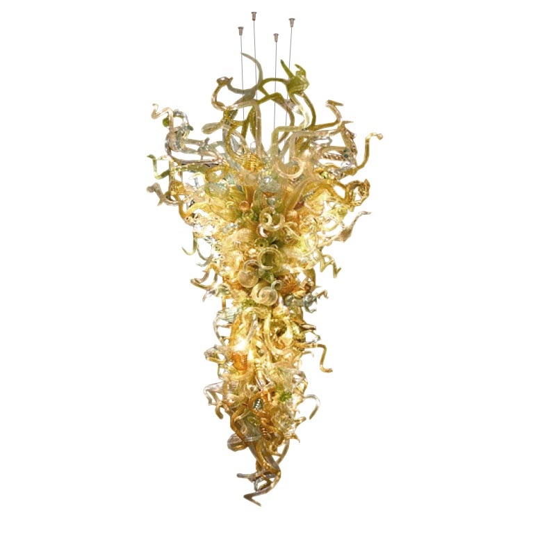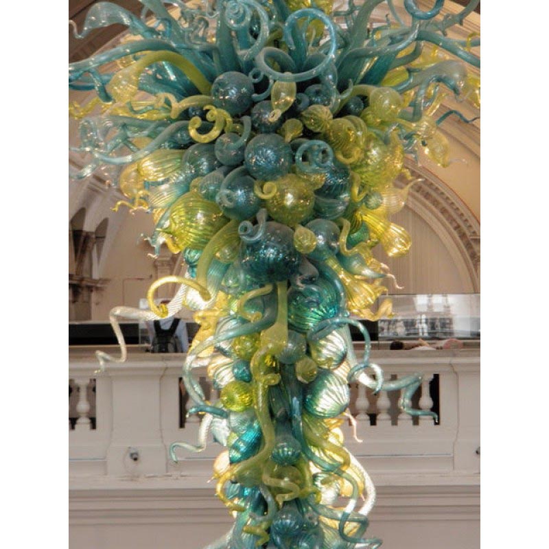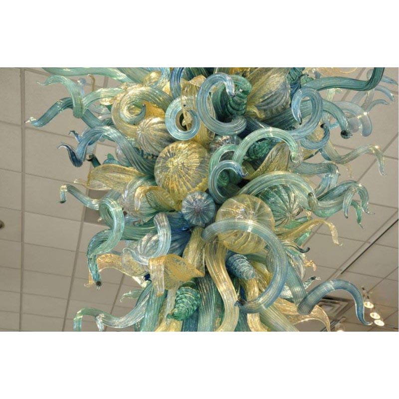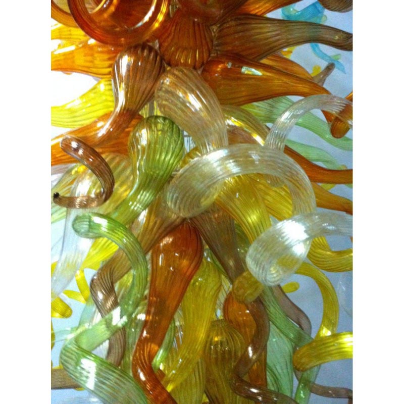 Majestic hand blown glass chandelier in the manner of Dale Chihuly. This incredible Light is made up of different color glass arms. The beauty of this chandelier is stunning and very captivating with the lights on or off. The time and craftsmanship that goes into making this chandelier is amazing. Over the course of four decades, Chihuly has explored new and old techniques, pushing the boundaries of contemporary art. He draws inspiration from the world around him, creating statements using color and form to capture the imagination, and catapult beyond conventional ideas of function and beauty. Venice’s longstanding tradition of glassmaking has continued throughout the generations, and to this day, the Venetian island of Murano is still internationally renowned for its active involvement in the glassmaking industry. For this reason, artists with an interest in all things glass, will typically flock to Venice and observe the work of famed Italian artisans who still reside in the stunning city in the Venetian tradition. The striking, fantasy feel of this piece would add the perfect touch to a room that is need of a pop of color or a huge statement piece set to transform a space to something totally different. It's smooth, hand crafted glass is sure to draw eyes and inquiries for years to come.