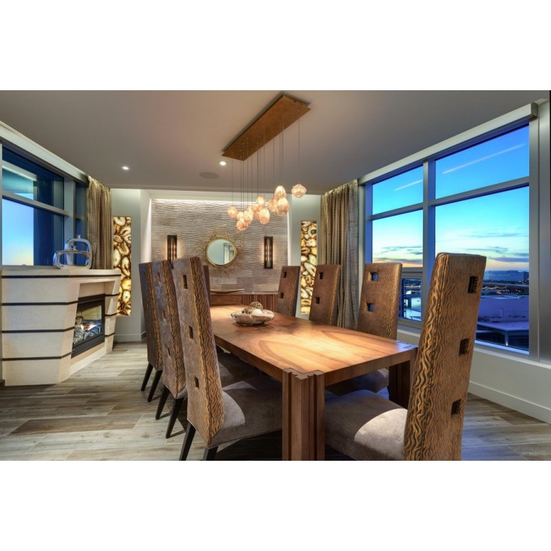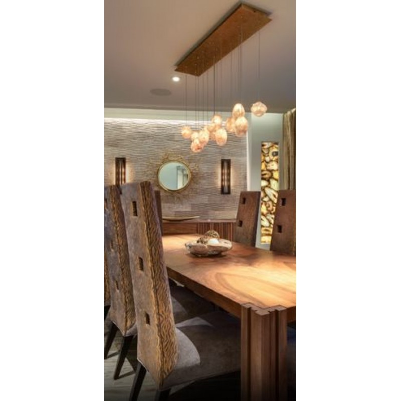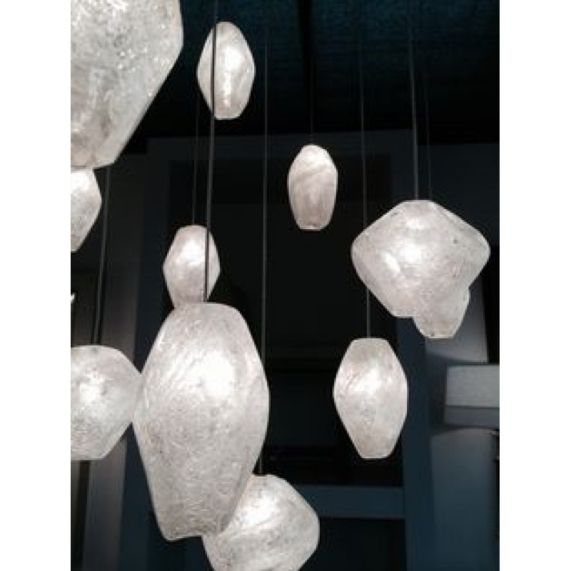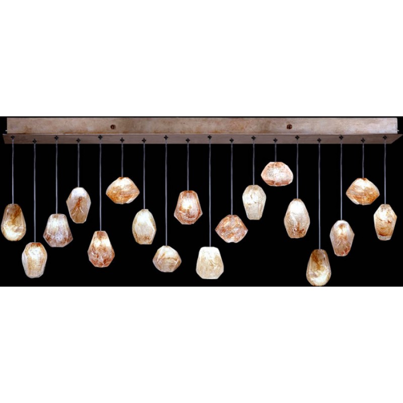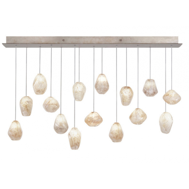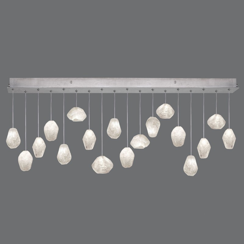 Born from the core elements of earth, inspired by the beauty of nature and created by the sculpting hands of master craftsmen. A collection of precious drop lights as wondrous and unique as nature itself. Available in platinized silver leaf or gold toned silver leaf finish and your choice of crystal glass options shown below. Includes 10 watt halogen bulbs and standard 10' adjustable coaxial cables. LED bulbs available, sold seperately. Twenty-five configurations available. Custom finishes and custom sizes available on all canopies.