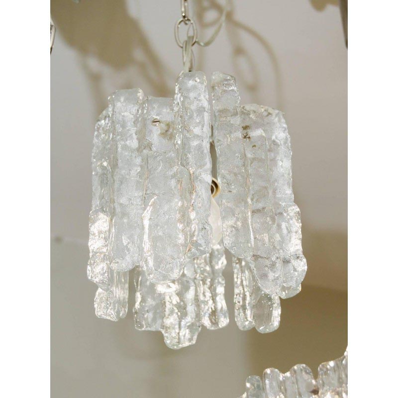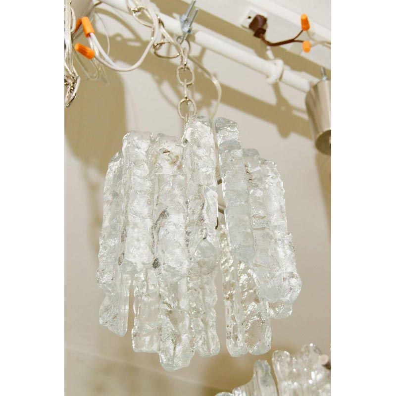 Fantastic petite ice glass pendant with five pieces of glass. It can be used as a group with independently coordinating fixtures in other sizes available separately. This piece is brought to you courtesy of Kalmar lighting. This enchanting vintage style chandelier is finished with a sleek nickel frame and is dressed with textured cast glass ice style prisms that embellish it flawlessly from top to bottom. Designed to look like a pendant created by Mother Nature’s wondrous winter icicles, this piece is one piece that will not only stand out but will provide an encompassing warming aura with its welcoming glow and whimsical appeal.