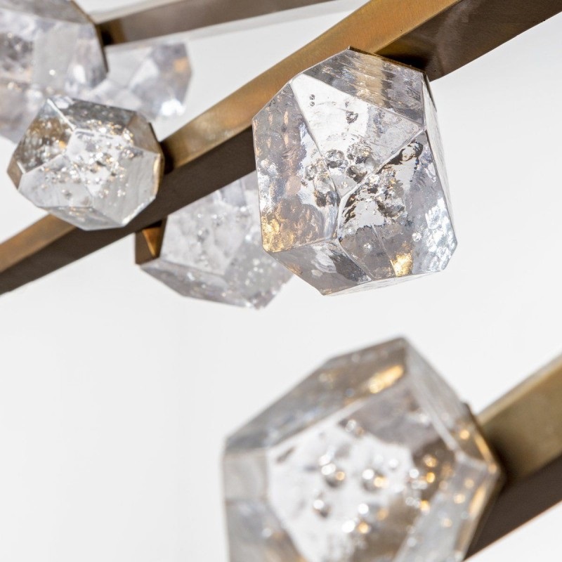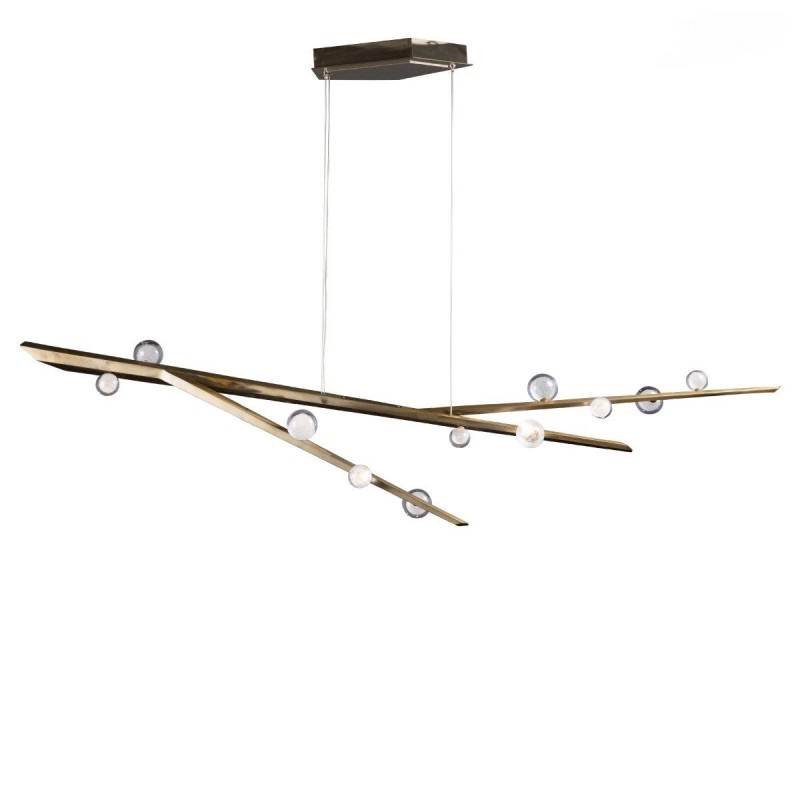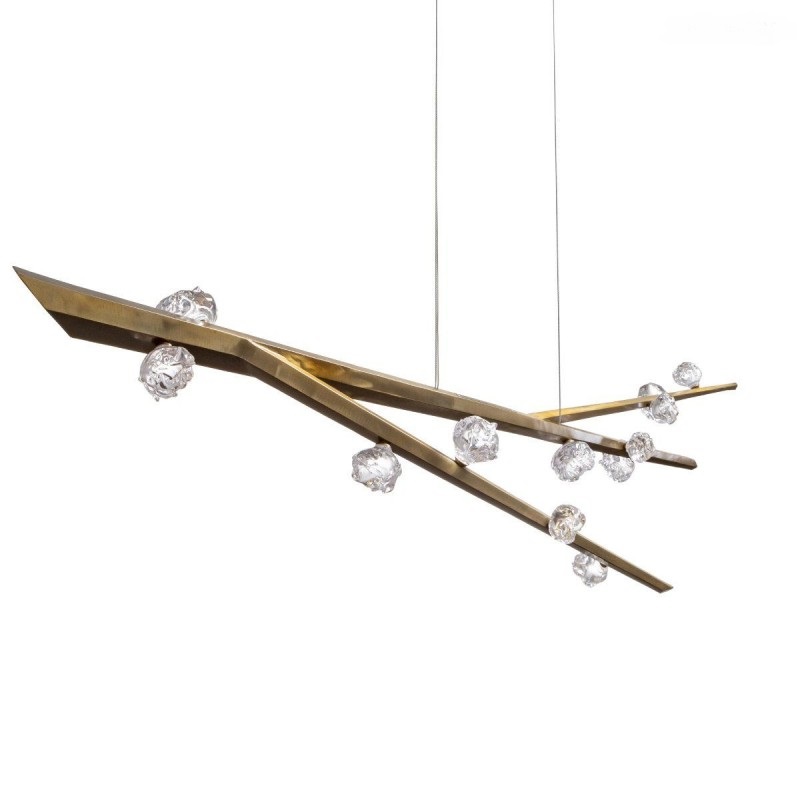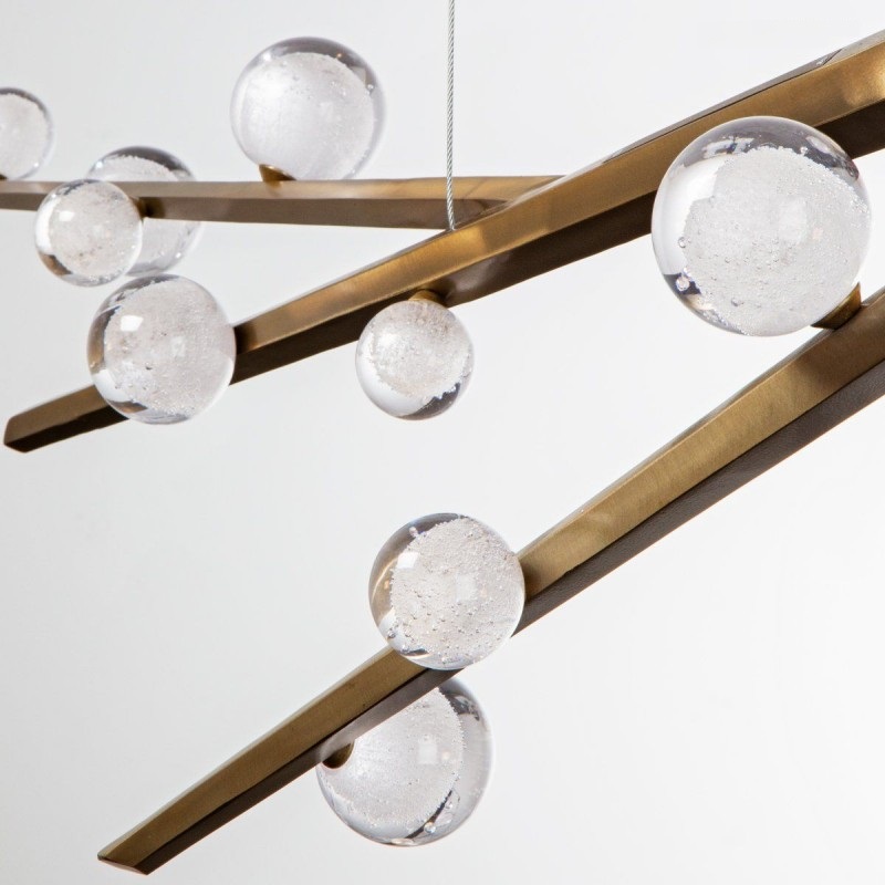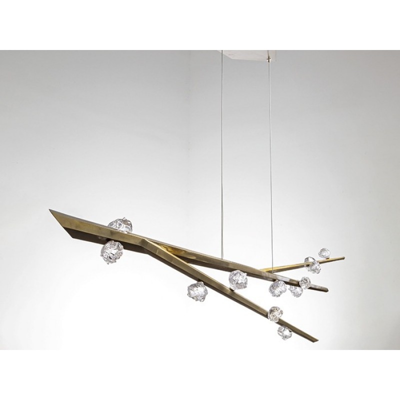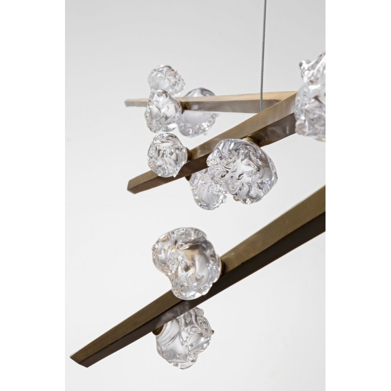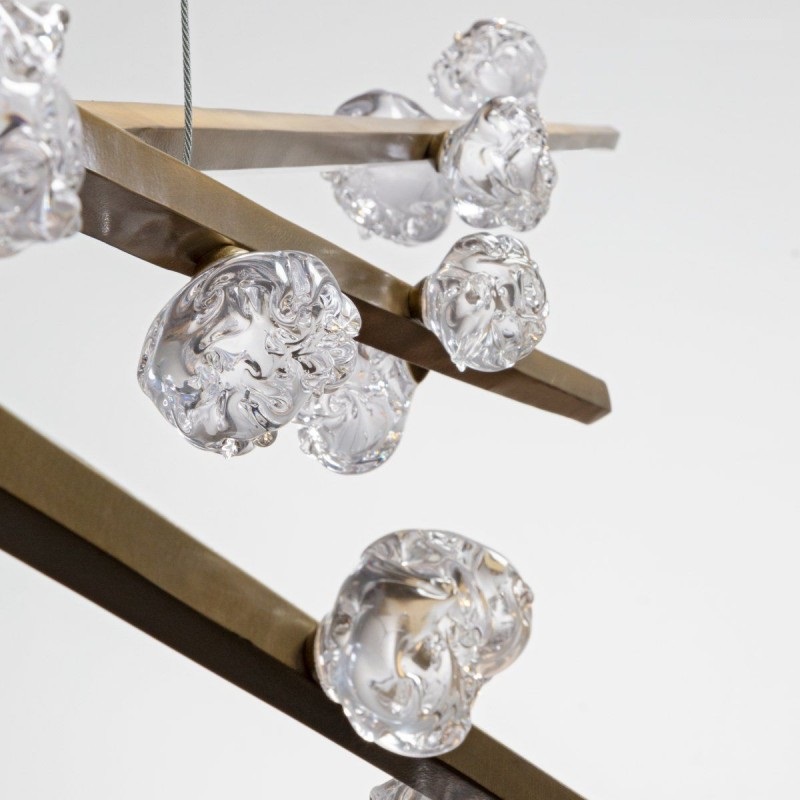 Hand hewn steel is meticulously polished and adorned with organic artisan glass buds in this magnificent linear sculpture. The SJ2114 chandelier is a great addition for both restaurants and homes. Having created custom chandeliers for over three decades, we specialize in bringing lighting concepts into reality, whether your inspiration comes from a rough sketch, an existing chandelier, our original concepts, or even your own creative imagination. We approach this sculptural object in a contemporary, unexpected and creative way