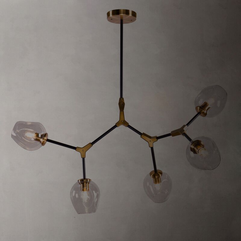 Orbital bronze chandelier with clear glass lamp holders. This piece features a stunning bronze finish and clear glass lamp holders. At Alan Mizrahi Lighting Design, we manufacture many highly sought after pieces. All Chandeliers can be customized by the number of lights, style, color, and size to meet your specific needs. Every chandelier can also be combined with a matching table lamp and wall lamp to accomplish the best room design. Our company provides collections that can make all your project dreams come true. The key to an elegant, opulent, bespoke design understanding the aspirations of the client, the relevance of location, and maximizing the potential of existing elements of the space.
