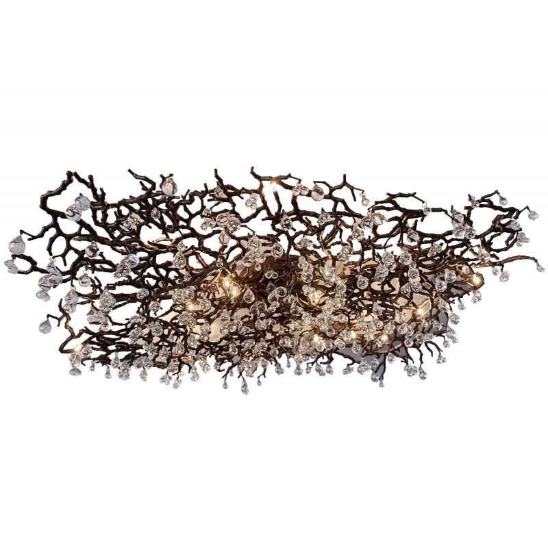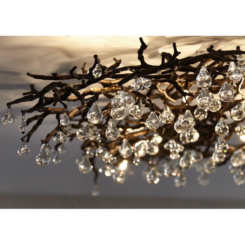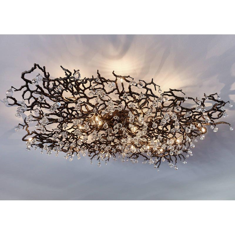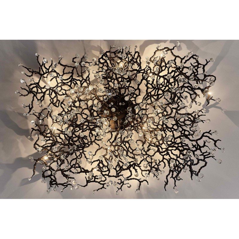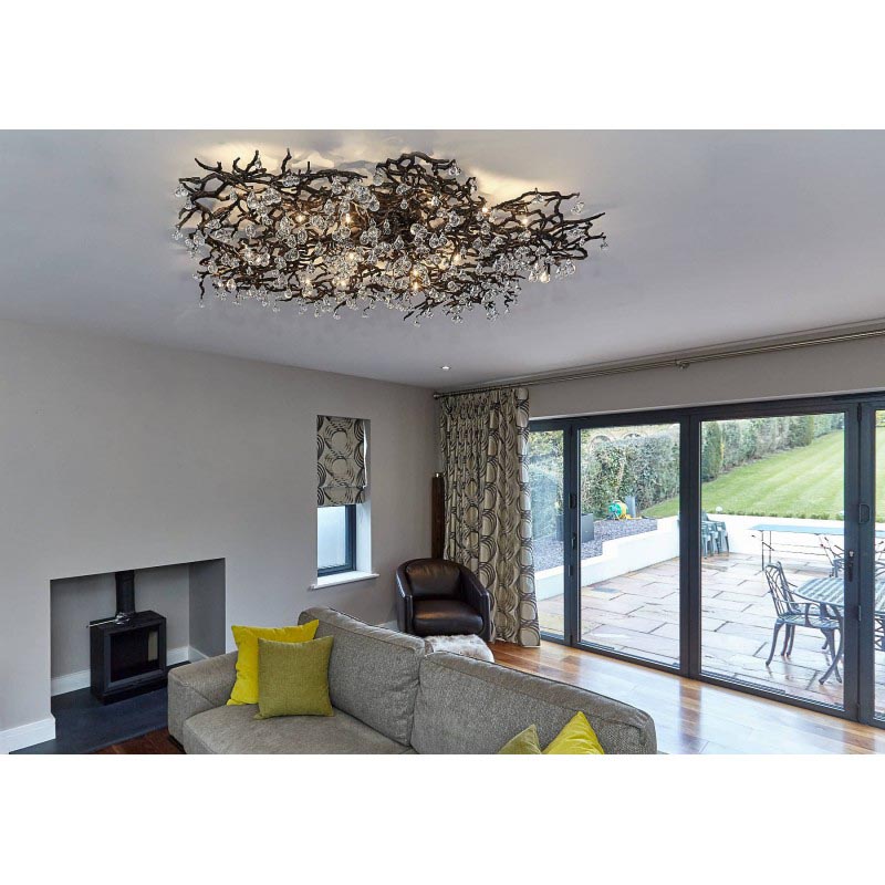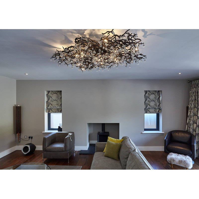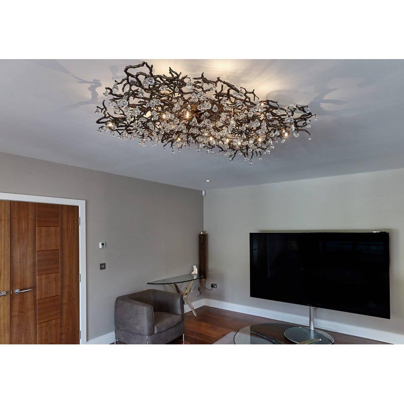 An organic and meticulously designed piece which makes for a fascinating talking point. This unique piece would look perfect in a special area of the home, such as over the dining table with dimmed lighting to set the mood. The metal parts are plated in dark bronze with crystal droplets, designed in a random fill of singles or clumps, and sculpted in varying diameters with internal wiring.