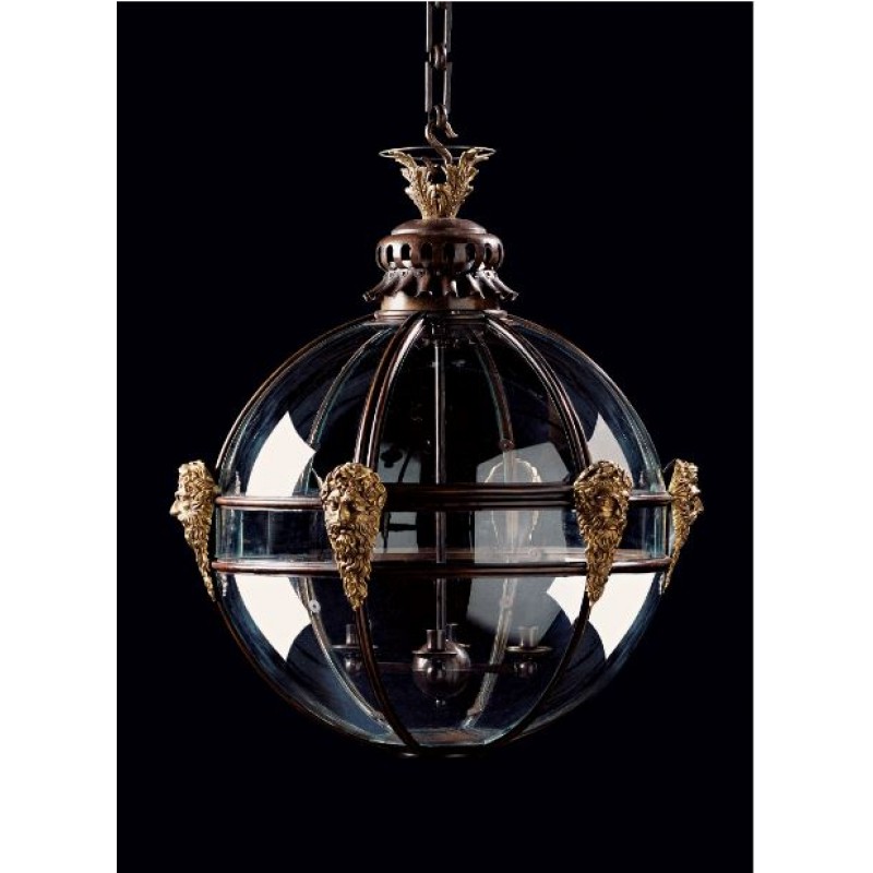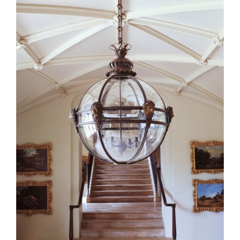 Made with hand-molded copper and finished in bronze, this large glazed spherical lantern is enriched with cast brass masks. The masks, with long beards, represent Neptune, the God of the Sea. The leaf cast finial rests on a pierced cupola designed to reduce heat or smoke. All fixtures can be customized by the number of lights, style, color, and size to meet your specific needs. Every light can also be combined with a matching table lamp and wall lamp to accomplish the best room design. At Alan Mizrahi Lighting Design, we supply and manufacture many highly sought after designer pieces.