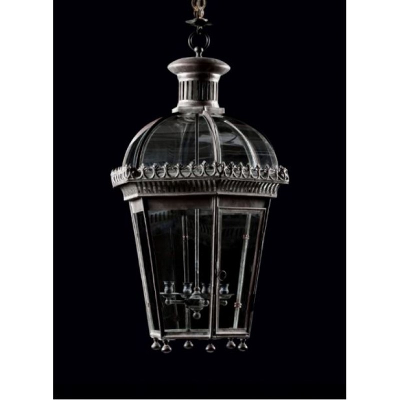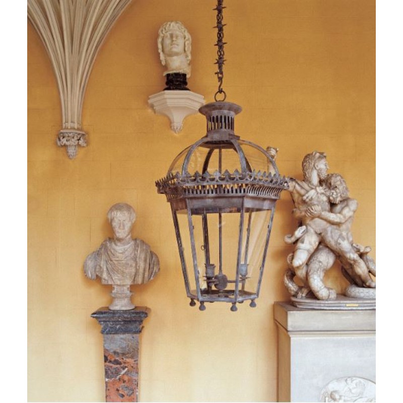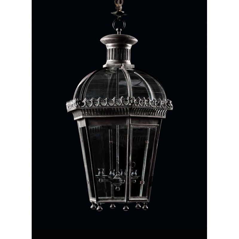 This tapered and molded lantern has a hinged side door on bun feet beneath a running band of piercing, and a glazed and domed top with a slotted cupola.