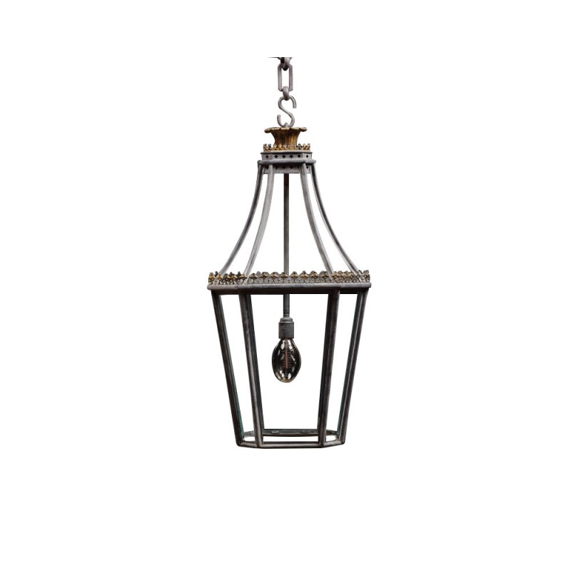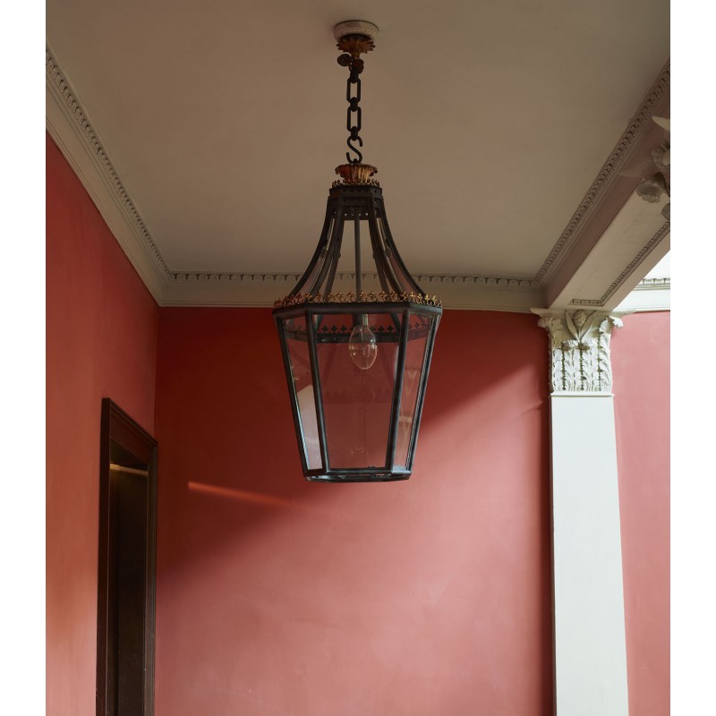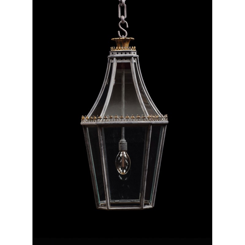 This highly unusual tapered and molded hanging lantern is decorated with delicate pierced gallery around both the central partition and the top, which is capped by a floral cupola.