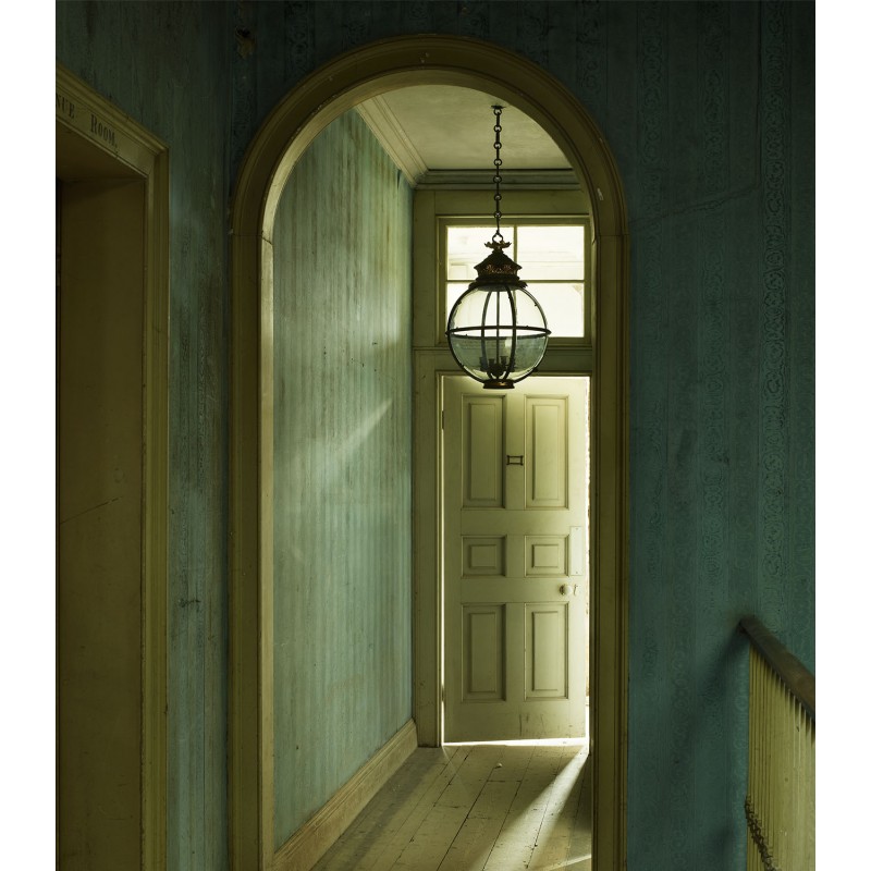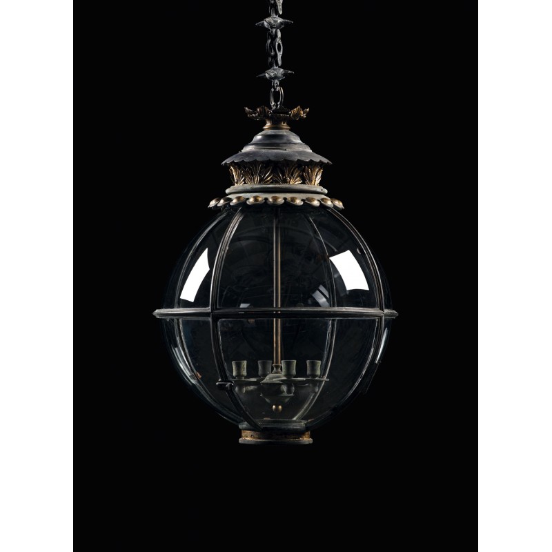 A spherical hanging lantern with molded glazing bars and a hinged access panel, the top decorated with gilded foliage beneath a petal shaped smoke cap with foliate rose and a gilt bead collar.