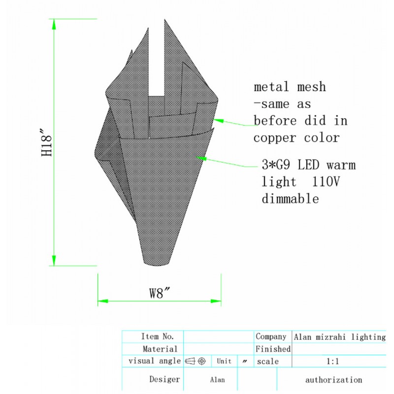 The stunning NER TAMID Sconce is meant to evoke the wonder and mystery of light presence. The overlays of bronze, copper and gold mesh provide changing views of the sparkling light all around. This piece emits an almost ethereal light due to the partially transparent mesh and will brighten any dining room or foyer. Because our lighting is made by a workforce that still relies on traditional working methods, each product is unique and carries with it the sensitivity of the artisan. All aspects can be customized-hardware finish, dimension, and the most current LED illumination options.