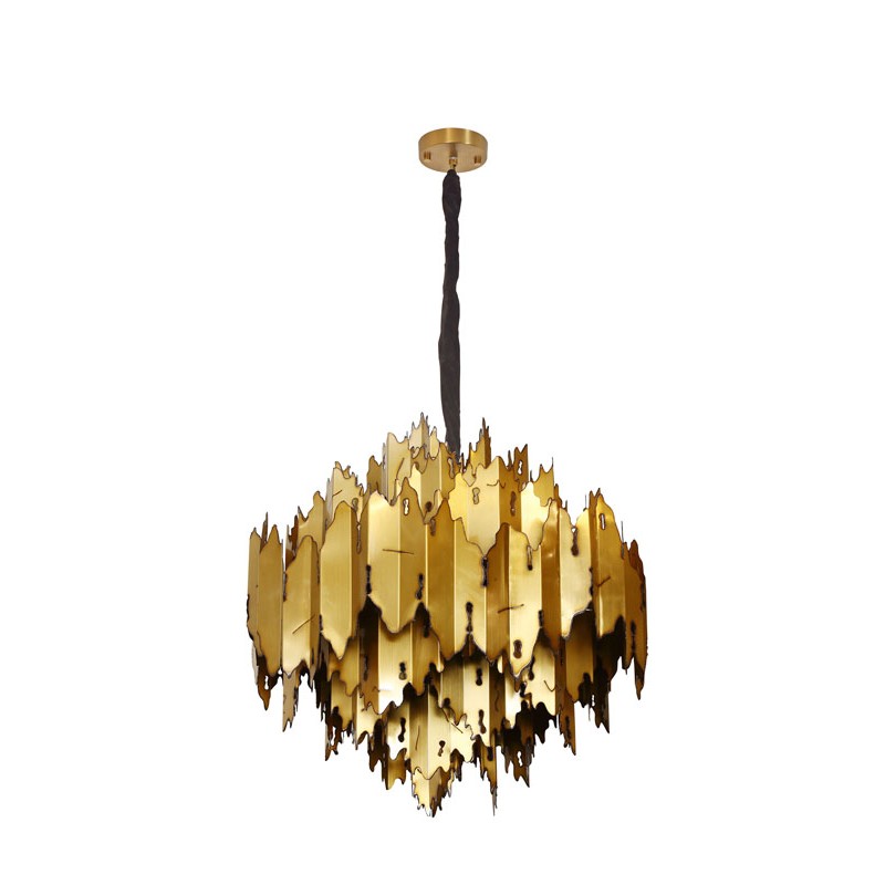 Bergamo Chandelier is a bold mix of 70s Italian and sleek kinetic modernism. The architectural design is constructed from individually tooled solid brass panels that are provocatively placed together. The chandelier hangs from an adjustable single center pole and shines with a warm luxe glow.