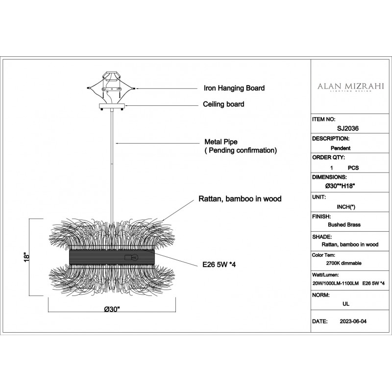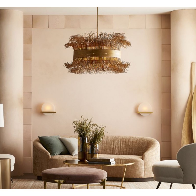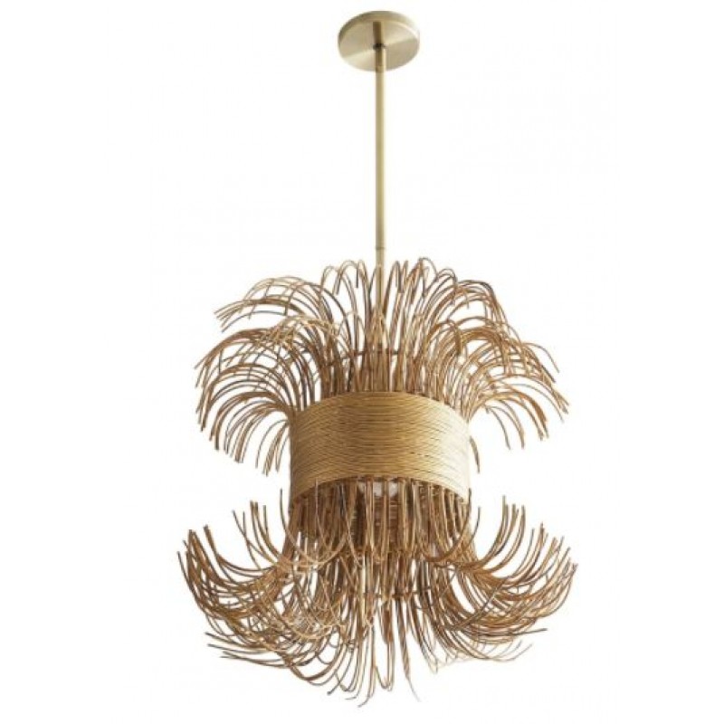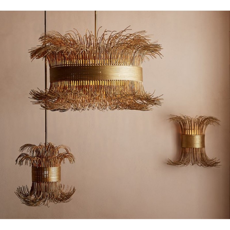 Naturally chic, this chandelier is crafted from free-flowing natural rattan cinched with a steel band finished in gold. In addition, it provides an outstanding piece; we are also able to create this piece in whatever size, and any finish you need. No mass products, but one by one characteristic designs that offer you the possibility to add your own unique touch to your interior.