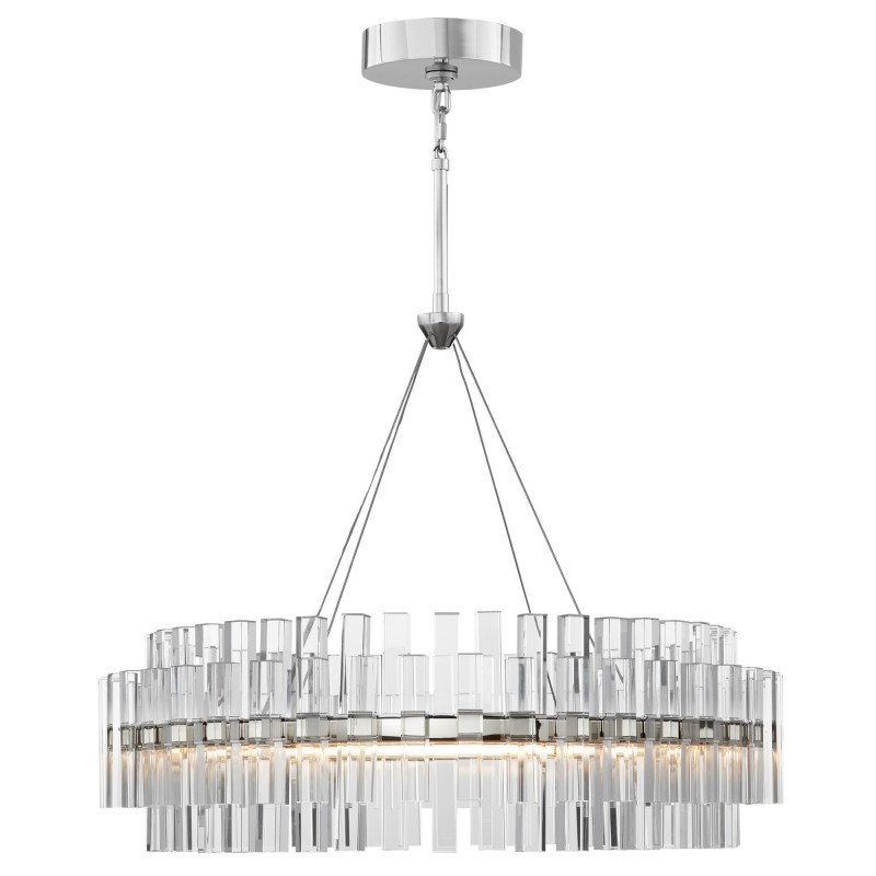 Old-world glamour meets modern energy efficiency with our stunning chandelier, illuminated with long-lasting LED panels. Staggered rows of optical glass are meticulously placed around a steel frame to produce a radiant, shimmering glow when illuminated. Inspired by Art Deco designs from the 1930s, it makes a majestic statement in the foyer, dining area or living room.