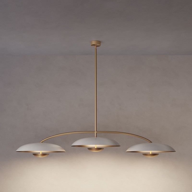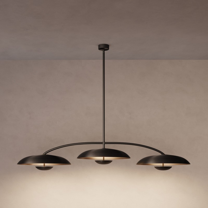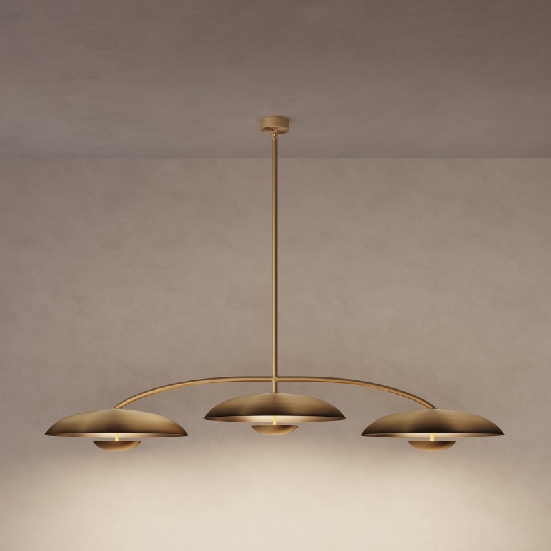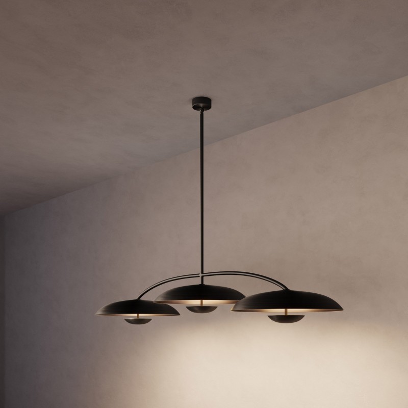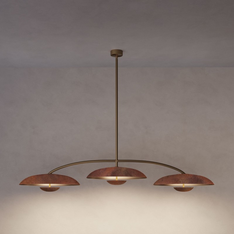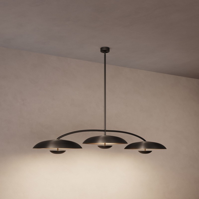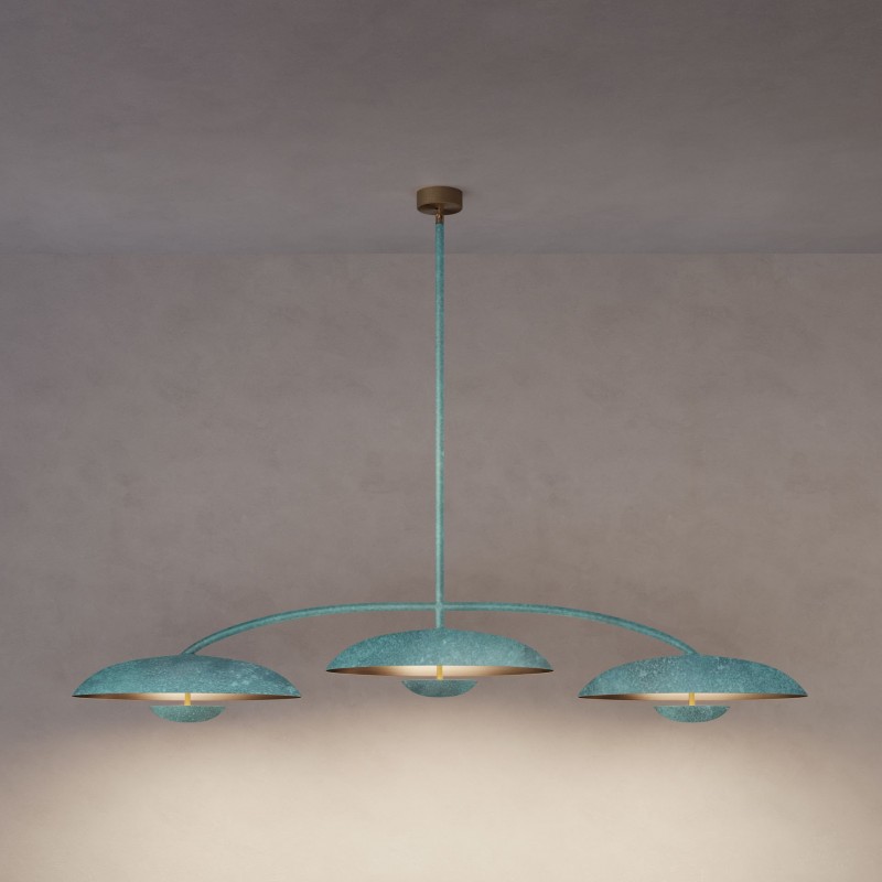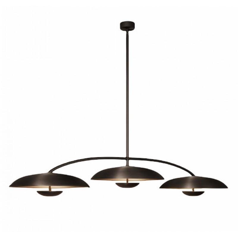 Trio for three, a unique ceiling light composed by a cluster of lighting components. Combining patinated brass plates and finely brushed bronze framework, the Orbit Trio ceiling light is softly illuminated with LED elements from within. At Alan Mizrahi Lighting Design, we supply and manufacture many highly sought after designer pieces. All Chandeliers can be customized by number of lights, style, color and size to meet your specific needs. Every chandelier can also be combined with a matching table lamp and wall lamp to accomplish the best room design