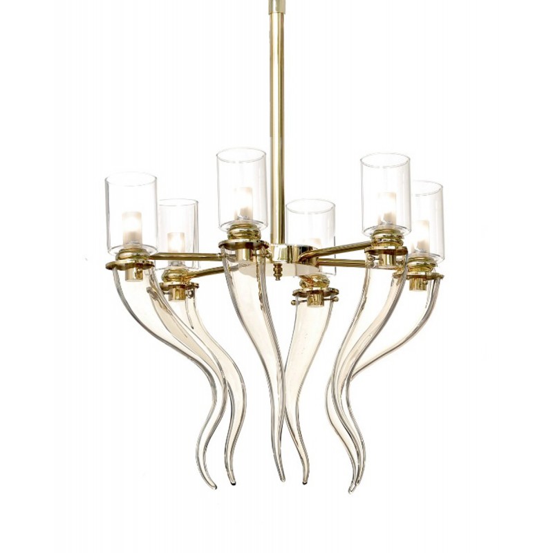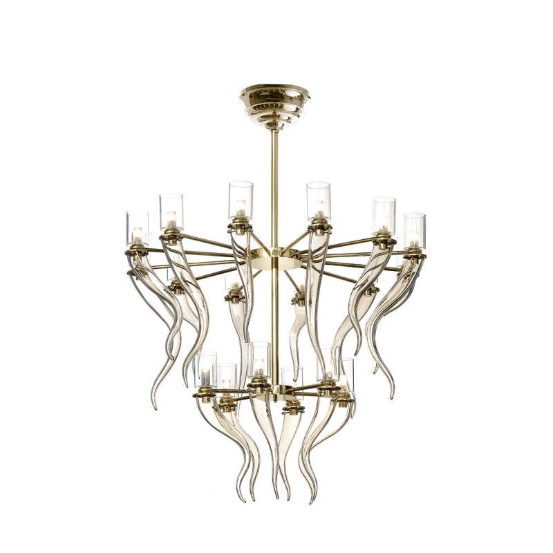 This exquisite chandelier was made of mouth-blown Venetian glass shaped in a series of horn-like elements in a delicate honey color. These pieces are tiered in two layers - one layer with twelve, the other with six - to create dramatic depth. Entirely handmade, the glass pieces are attached to a brushed and lacquered metal frame with a polished gold finish. A statement piece in any decor, this piece can be made upon request in different shapes and sizes. Please ask the concierge.