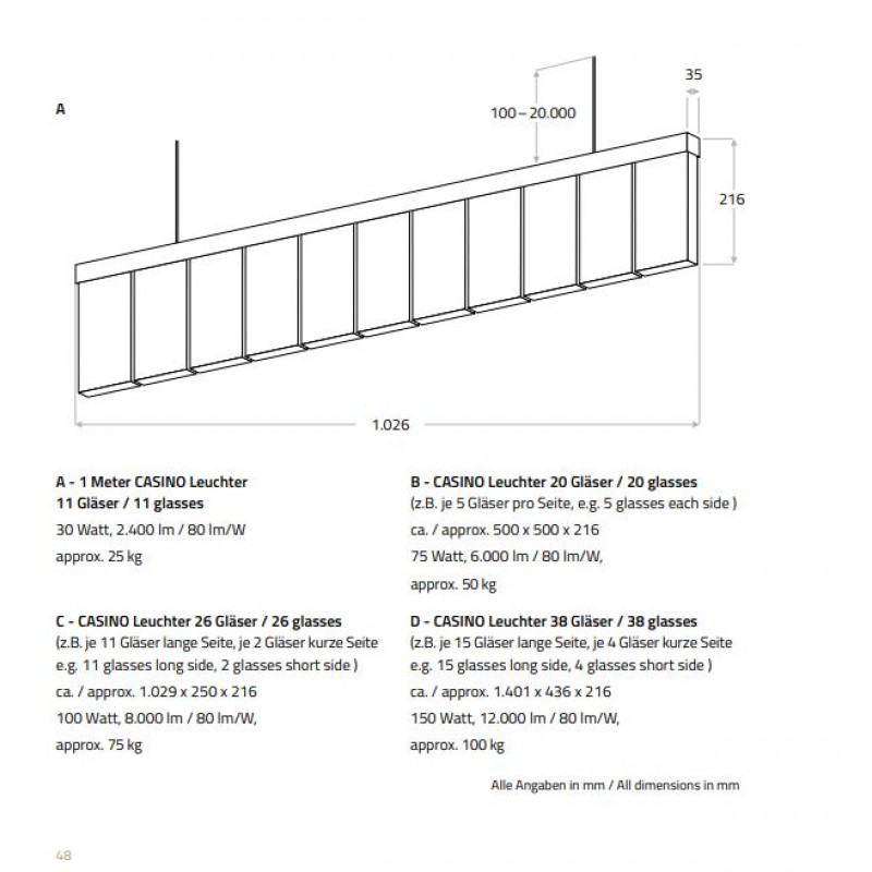Compact and of classic elegance, the CASINO CHANDELIER is particularly well suited for custom-built light fixtures such as an endless rail above a bar, as a bespoke rectangular chandelier above a table in different levels or as a big floor light. This lighting profile offers plenty of possibilities as a pure design element for individual lighting solutions.