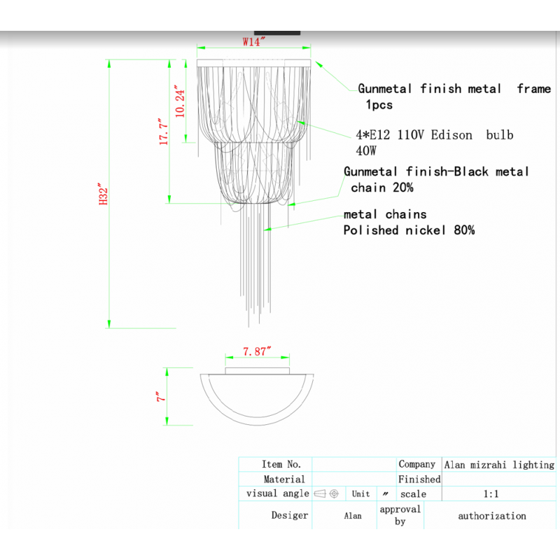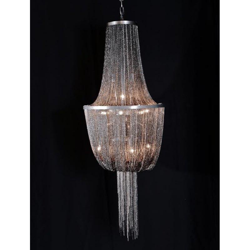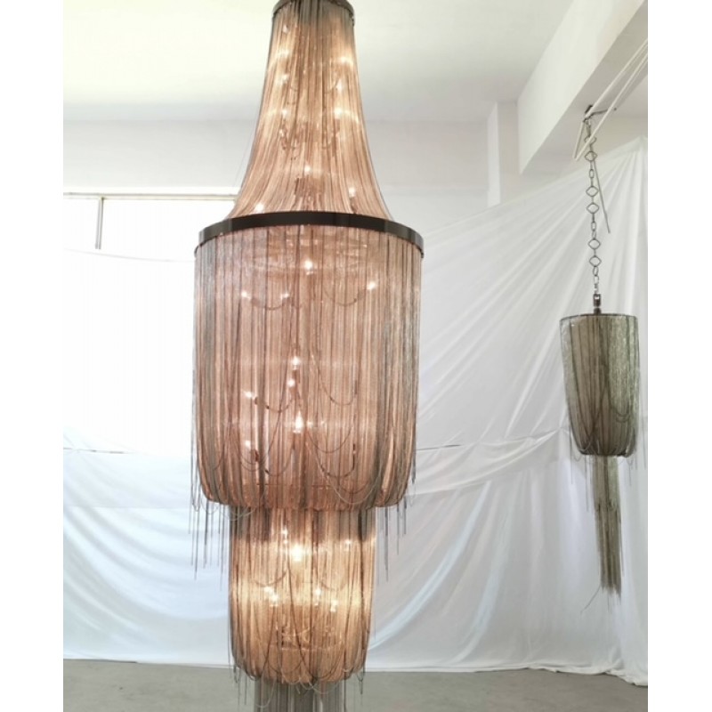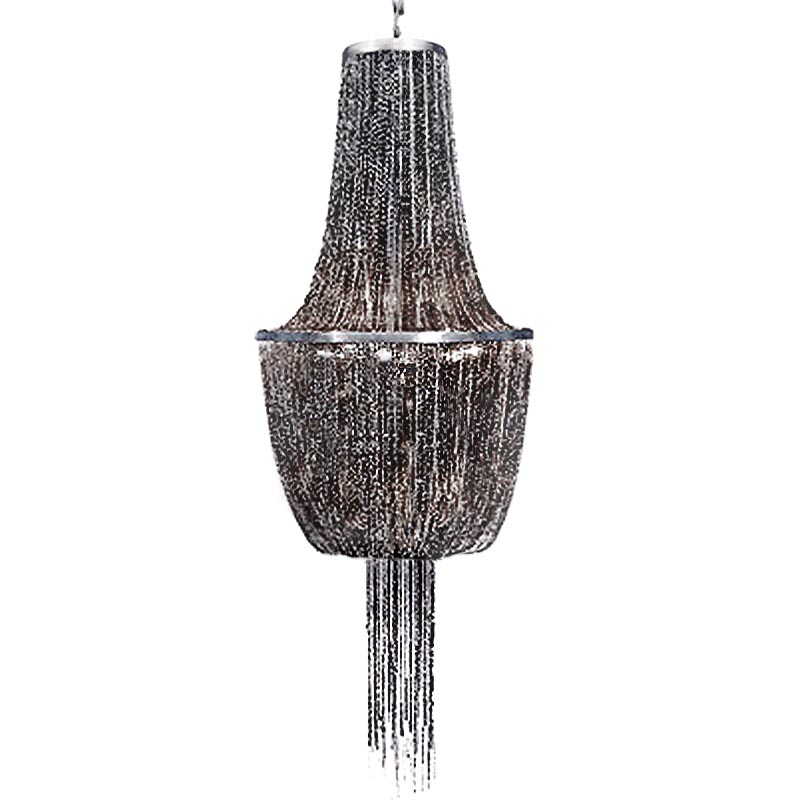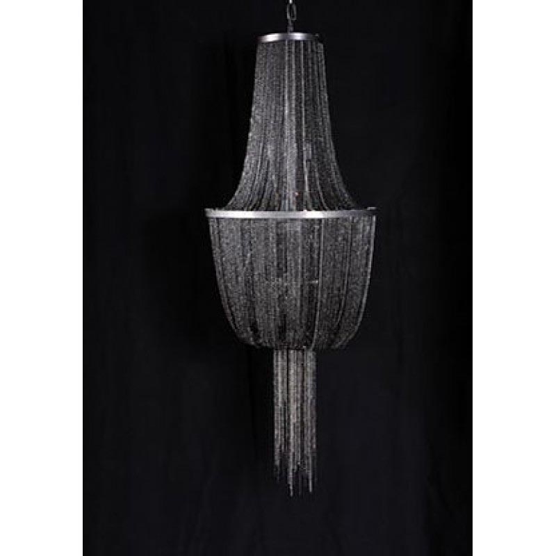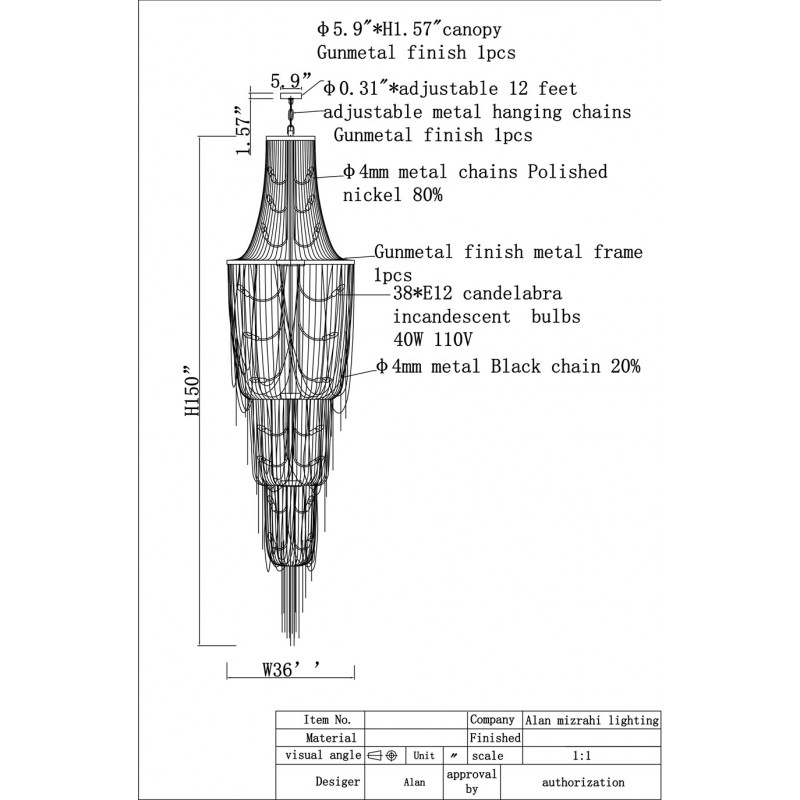 With its gunmetal black color and rugged metal chain extension, this unique chandelier melds a fusion of industrial style with dark glamour into one gorgeously stare-drawing piece. It measures in at 18” deep x 36” height (for the size featured) and is covered in an array of beautifully gathered metal strands that flow effortlessly throughout this fixture to provide ample, warm, and inviting light to any space it is placed in. In addition, this piece has a Venetian tinge to it with its sculptural shape and flowing chains from the cinched area, providing a very different and spell-binding piece you will cherish for many years to come.