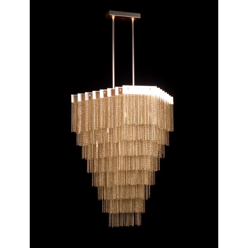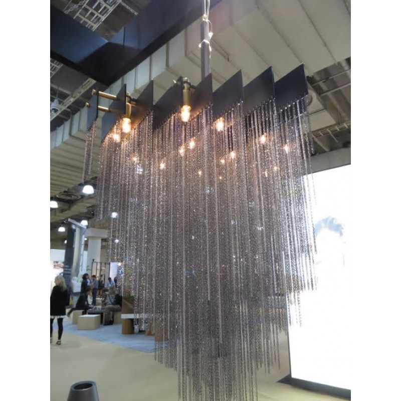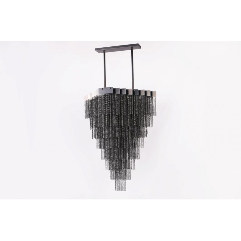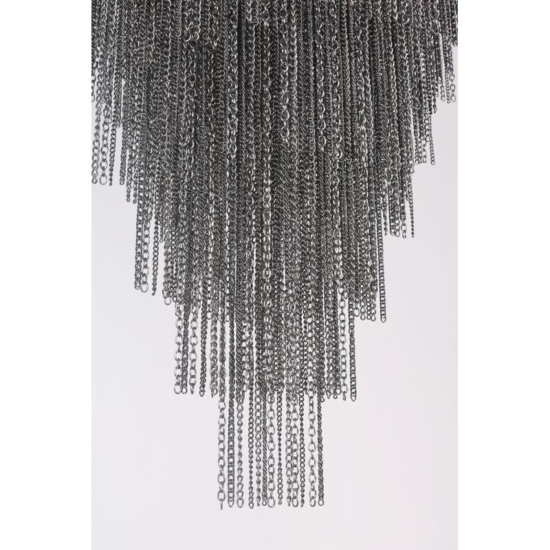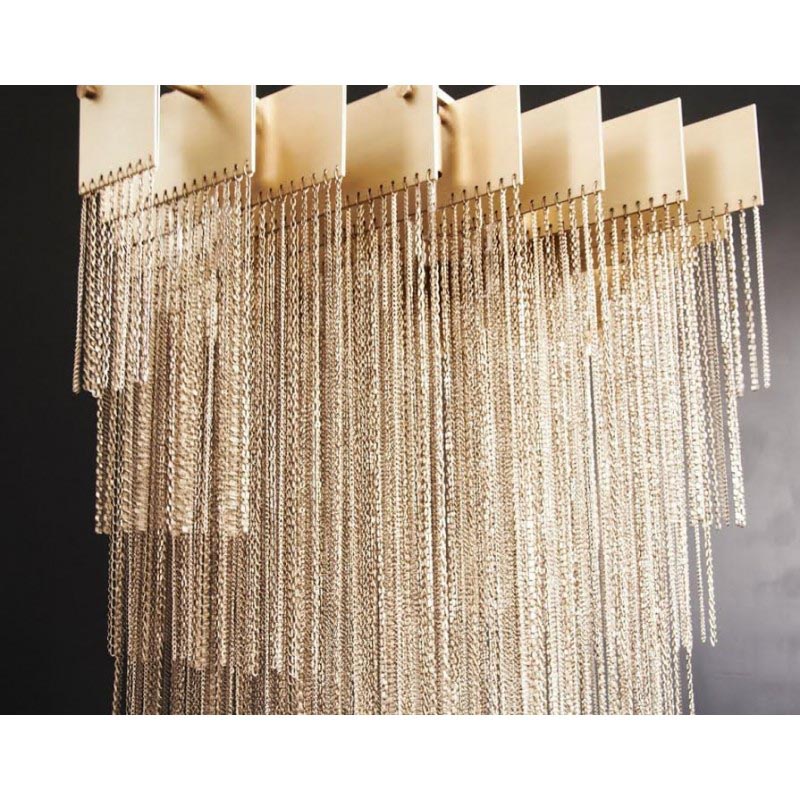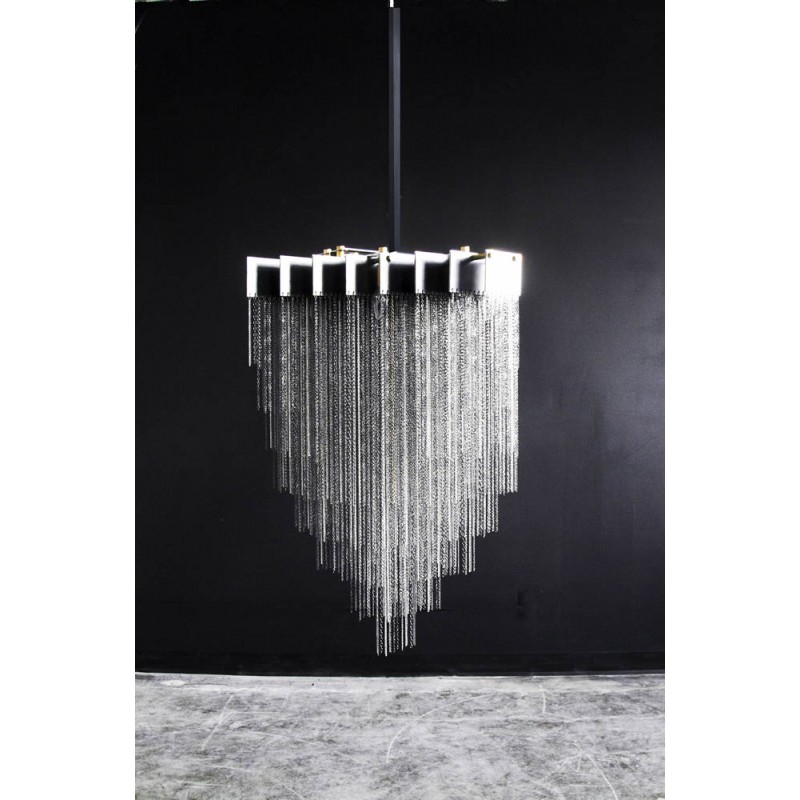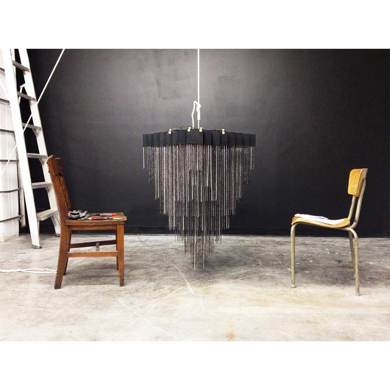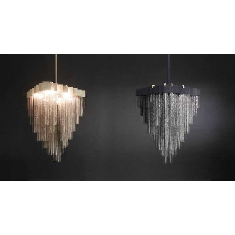 Bold and elegant sculptural light fixture, the "KELLY" Chandelier holds over a half-kilometer of reflective chain to generate a staggered and diametrically exquisite geometrical form. Light glimmers throughout the chain for to create a soft glistening cloud effect. Available in black steel with black and silver chain, or entirely in brass