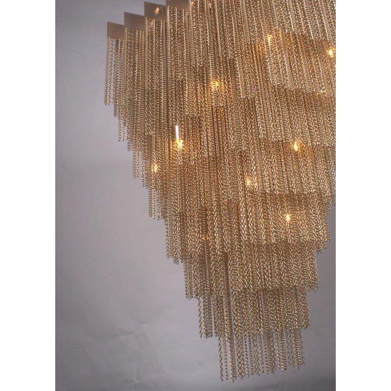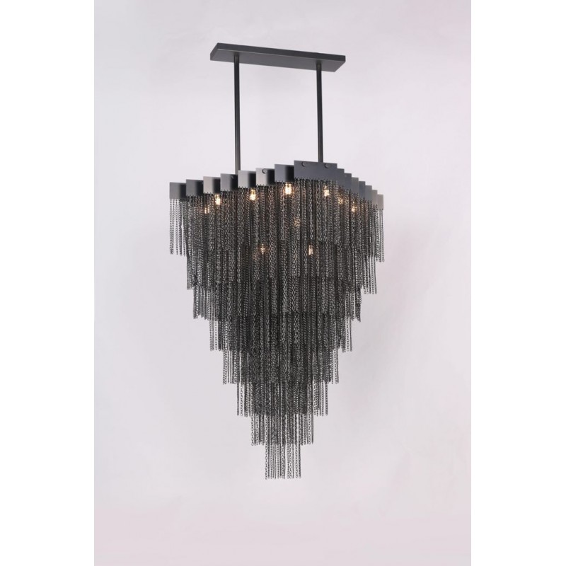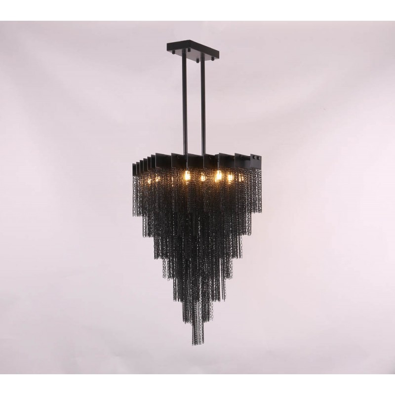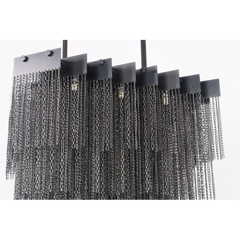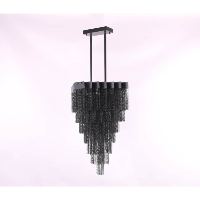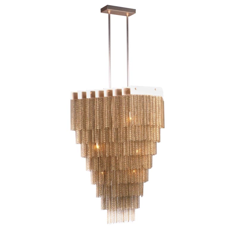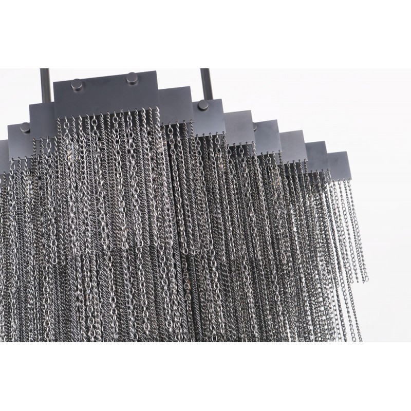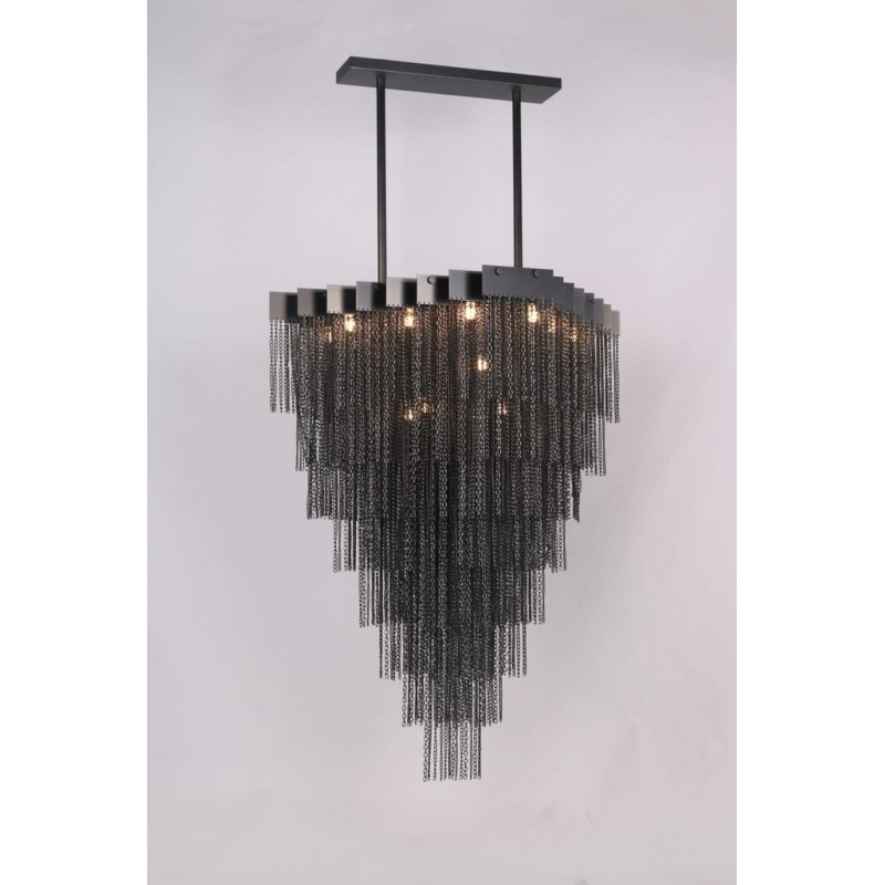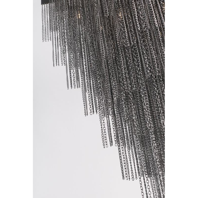 Bold and elegant sculptural light fixture, the "KELLY" Chandelier holds over a half-kilometer of reflective chain to generate a staggered and diametrically exquisite geometrical form. Light glimmers throughout the chain for to create a soft glistening cloud effect. Available in black steel with black and silver chain, or entirely in brass