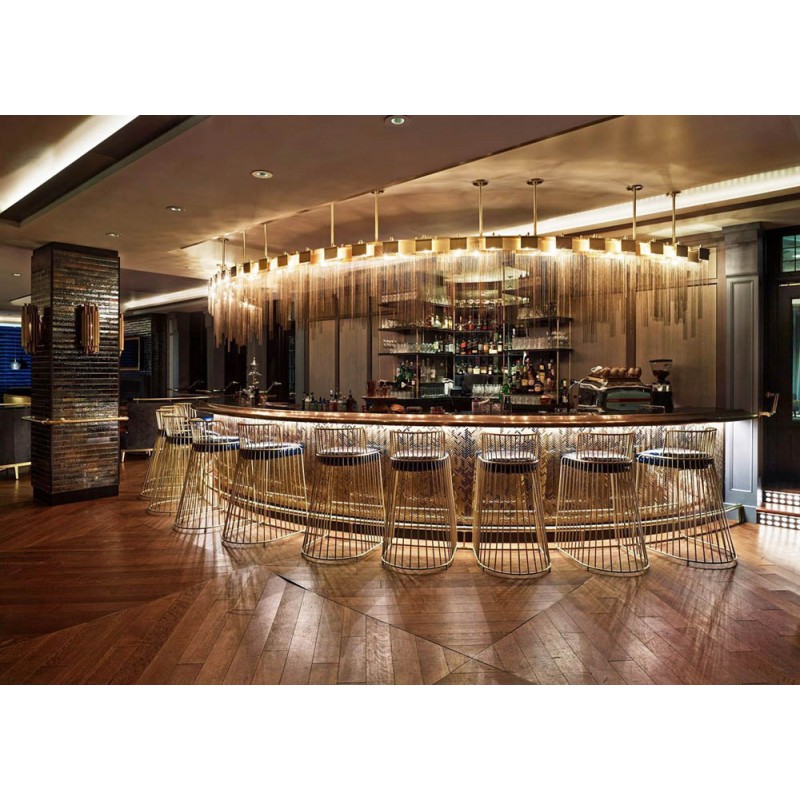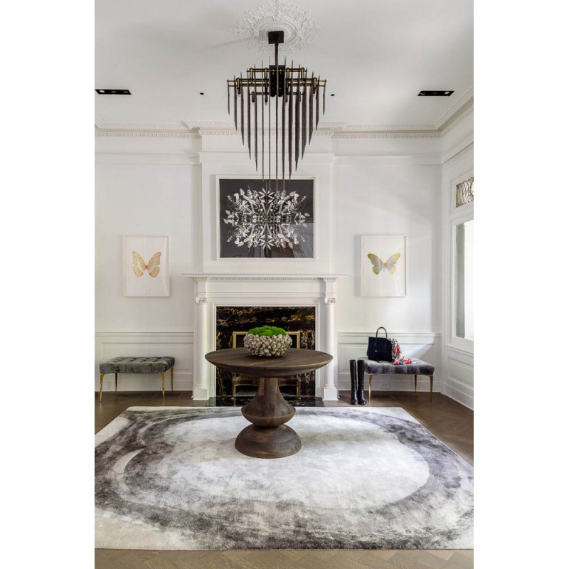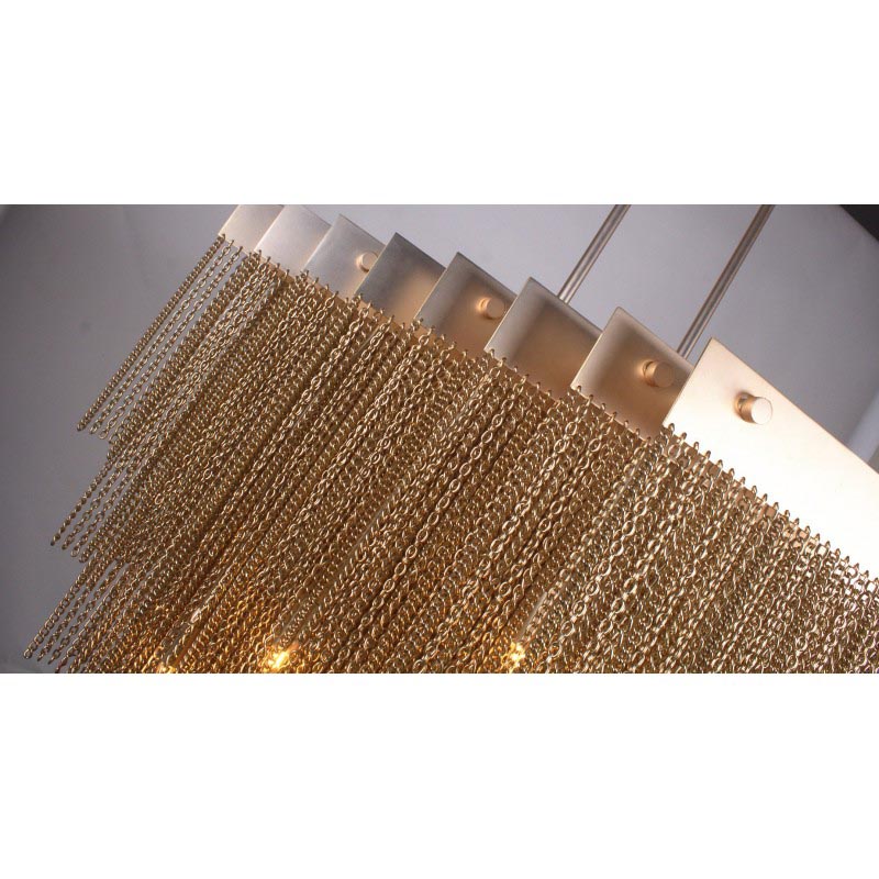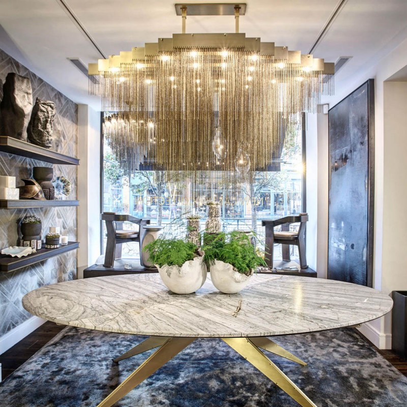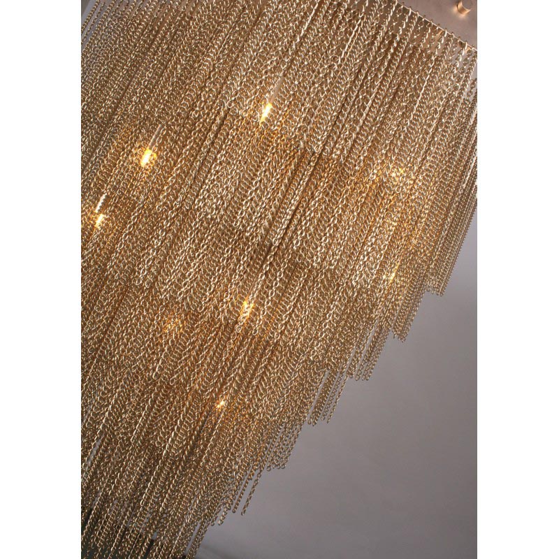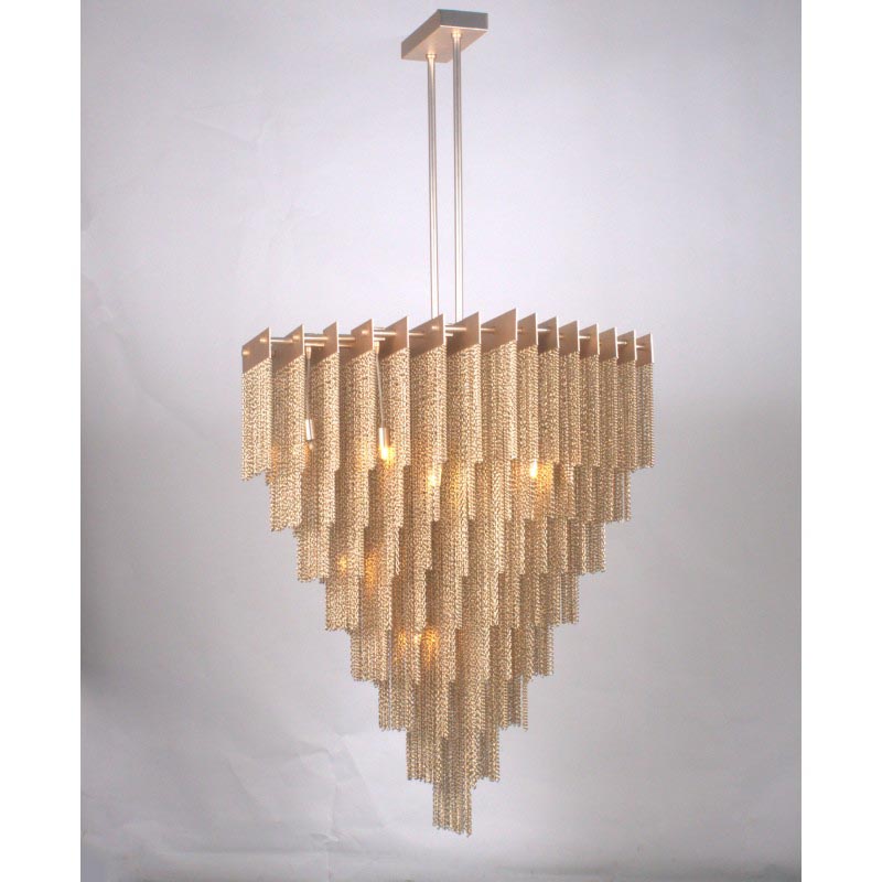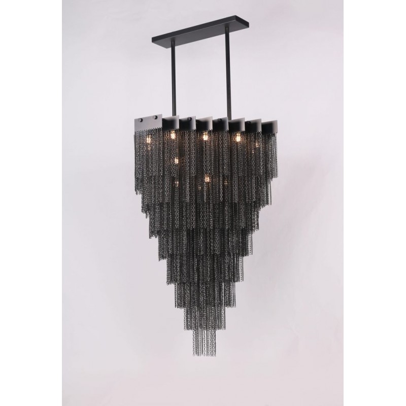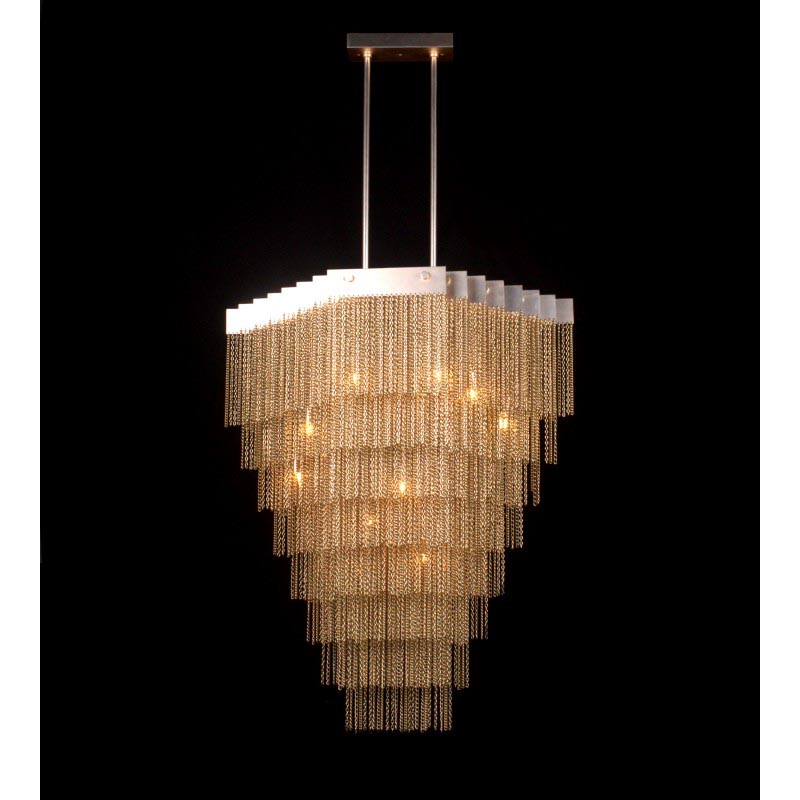 Bold and elegant sculptural light fixture, the "KELLY" Chandelier holds over a half-kilometer of reflective chain to generate a staggered and diametrically exquisite geometrical form. Light glimmers throughout the chain for to create a soft glistening cloud effect. Available in black steel with black and silver chain, or entirely in brass