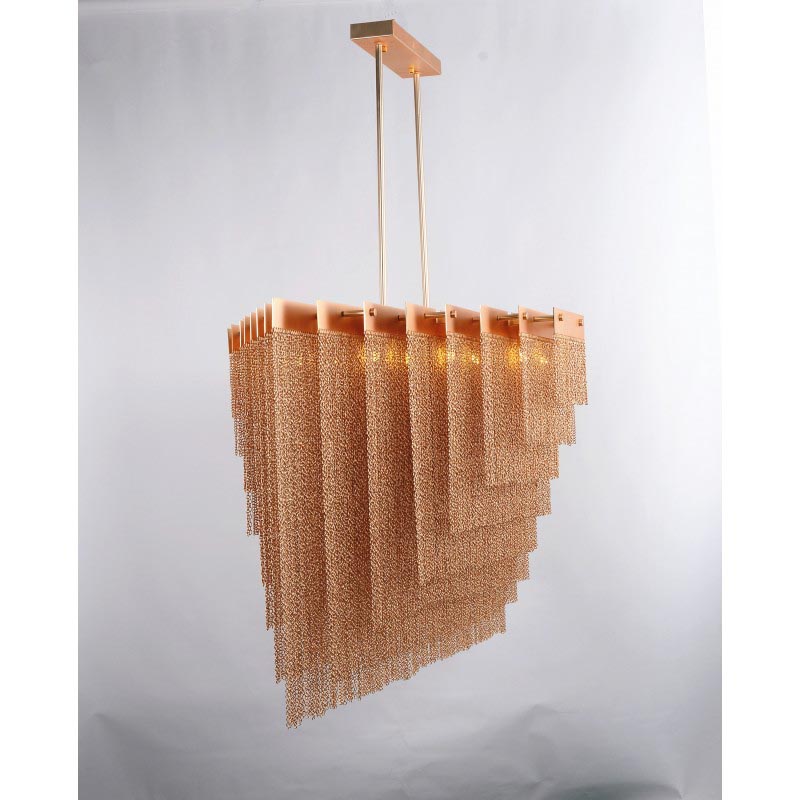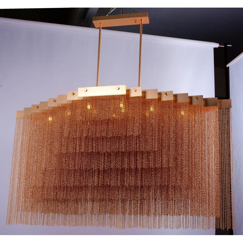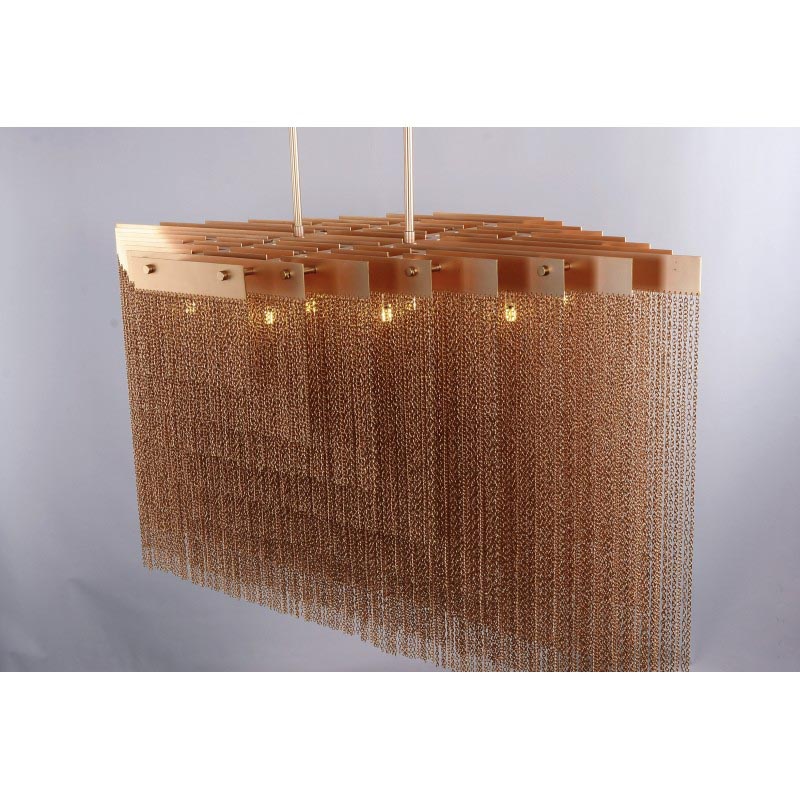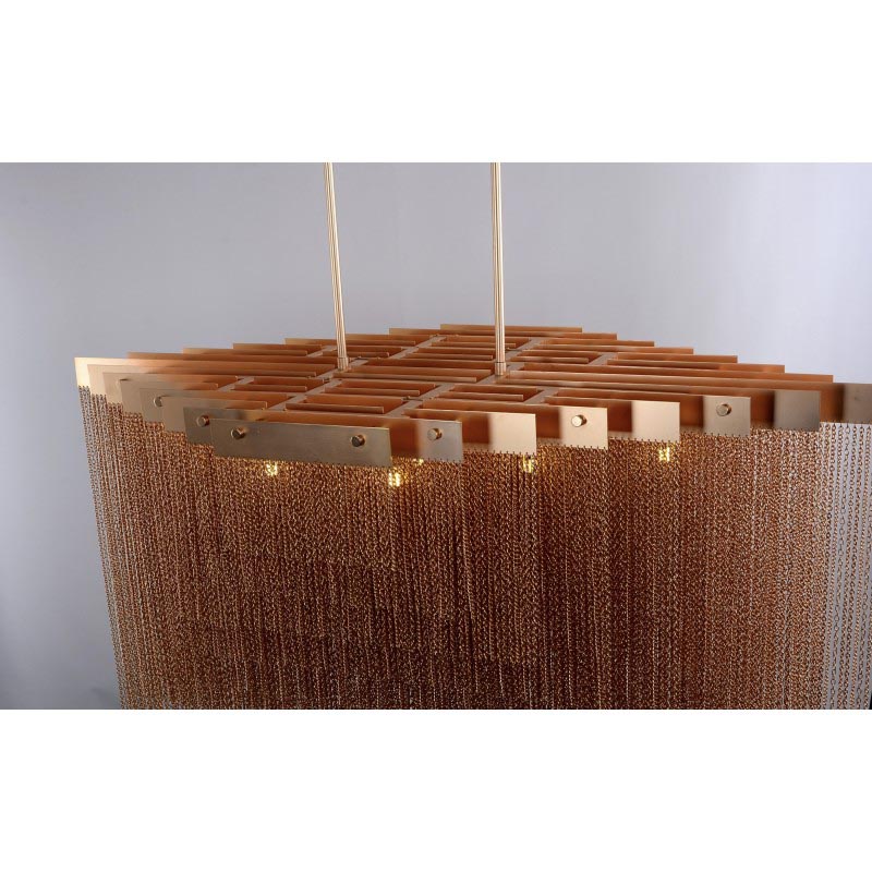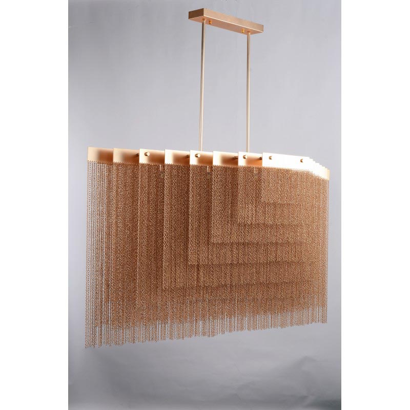 A bold and elegant sculptural light fixture, the "KELLY" chandelier holds over a half-kilometer of reflective chain to generate a staggered and diametrically exquisite geometrical  form. Light glimmers throughout the chain for to create a soft glistening cloud effect. Available in several finishes for both the frame and chain. Having created custom chandeliers for over three decades, we are specializes in bringing lighting concepts into reality, whether your inspiration comes from a rough sketch, an existing chandelier, our original concepts, or even your own creative imagination. Large or small, our team can meet the challenge, and can even coordinate the production of a private collection, where all finishes are kept consistent. Let us create the perfect lighting fixtures for your individual needs, to your individual specifications, and with attention to detail throughout production.