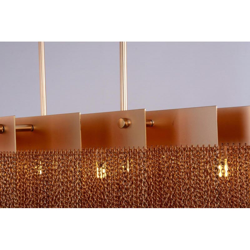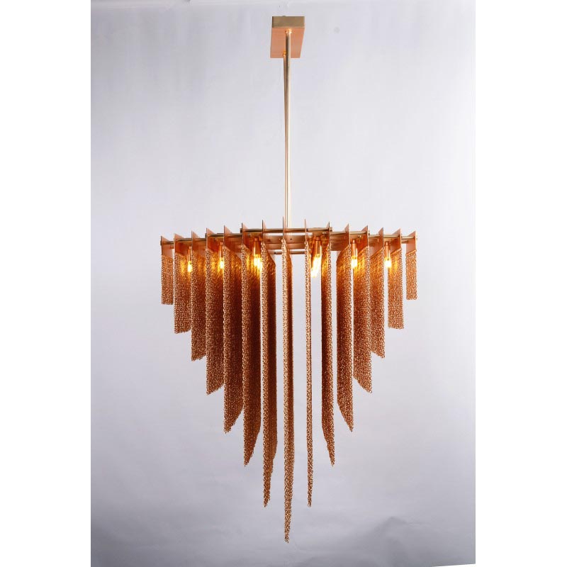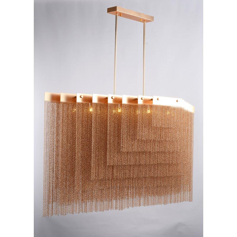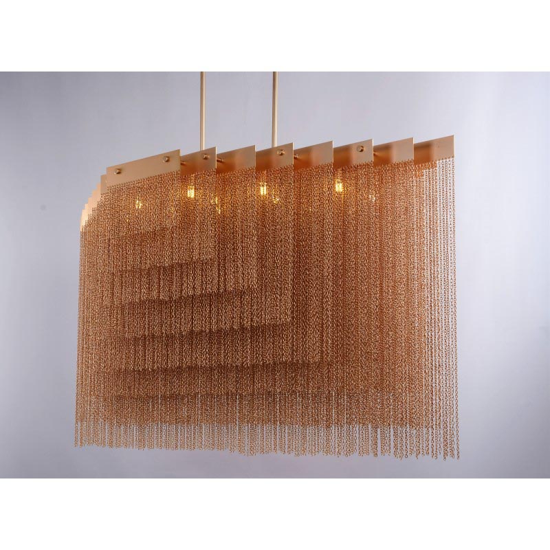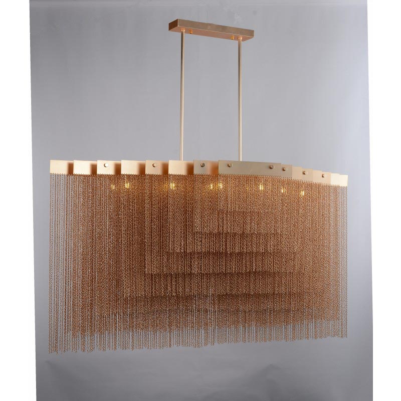 A bold and elegant sculptural light fixture, the "KELLY" chandelier holds over a half-kilometer of reflective chain to generate a staggered and diametrically exquisite geometrical  form. Light glimmers throughout the chain for to create a soft glistening cloud effect. Available in several finishes for both the frame and chain. Having created custom chandeliers for over three decades, we are specializes in bringing lighting concepts into reality, whether your inspiration comes from a rough sketch, an existing chandelier, our original concepts, or even your own creative imagination. Large or small, our team can meet the challenge, and can even coordinate the production of a private collection, where all finishes are kept consistent. Let us create the perfect lighting fixtures for your individual needs, to your individual specifications, and with attention to detail throughout production.