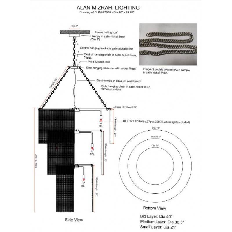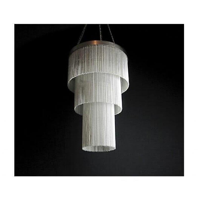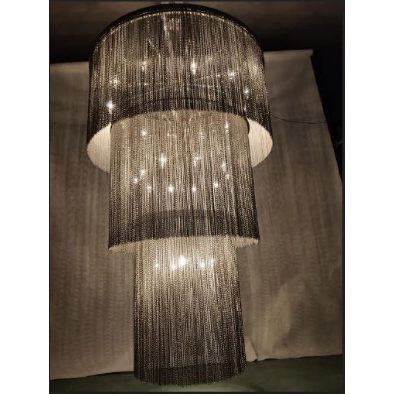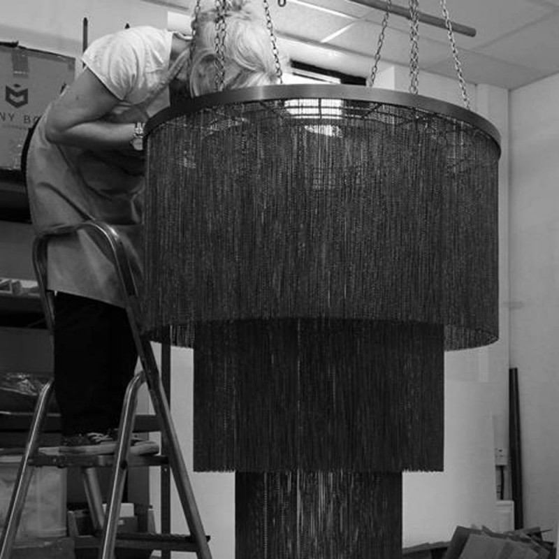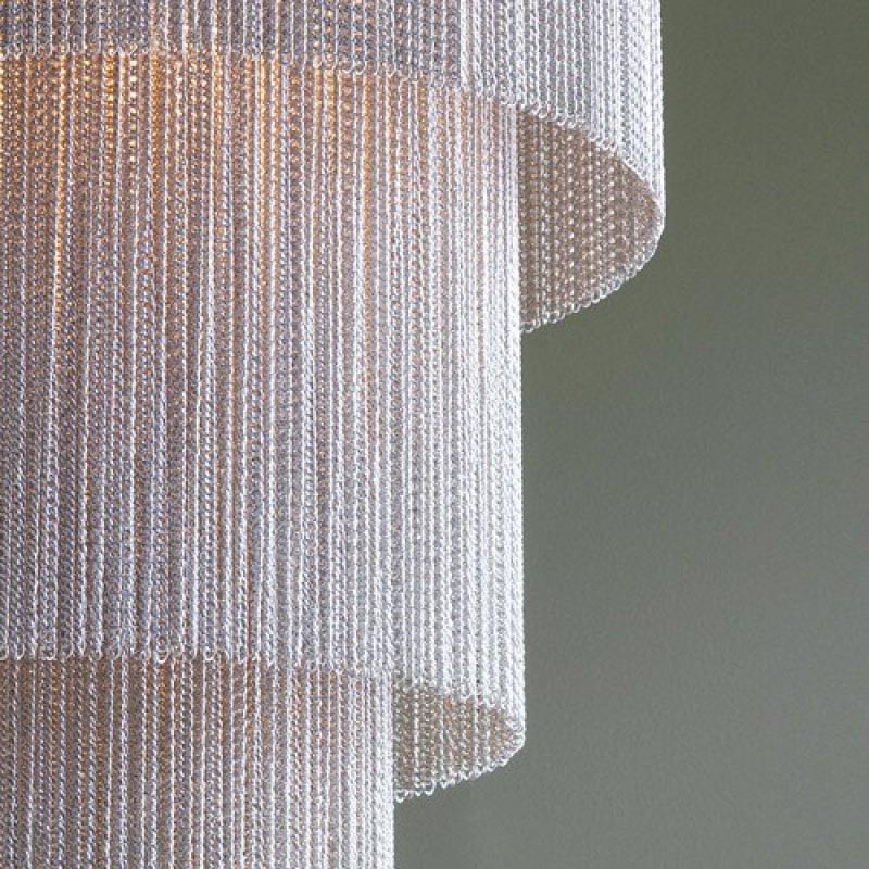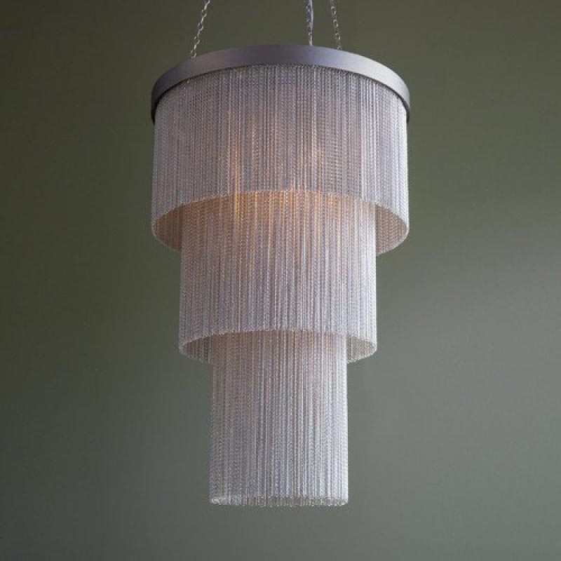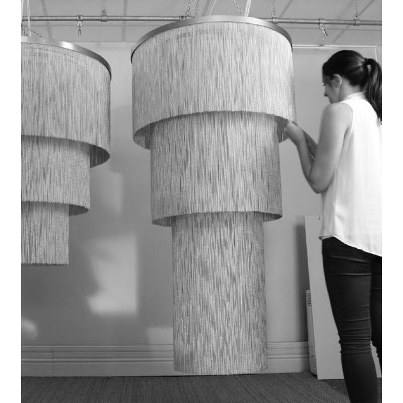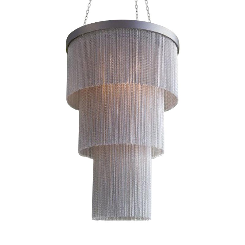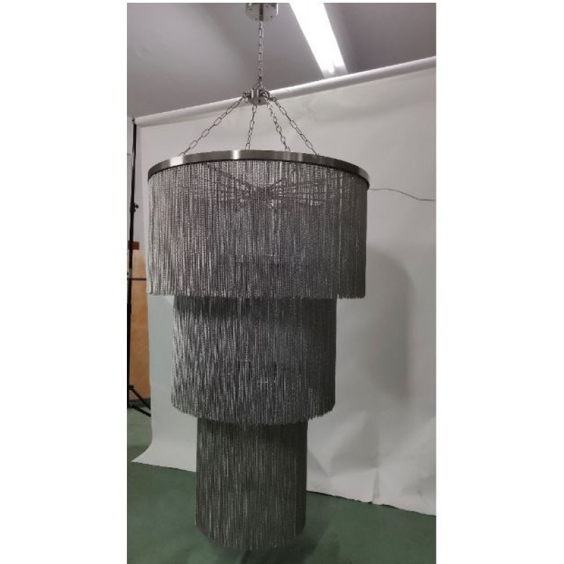 This unusual Chain Chandelier is made up of hundreds of individual strands of silver chain, which light up with an incredible opalescent glow when the chandelier is switched on.Having created custom chandeliers for over three decades, we are specialize in bringing lighting concepts into reality, whether your inspiration comes from a rough sketch, an existing chandelier, our original concepts, or even your own creative imagination. Large or small, our team can meet the challenge, and can even coordinate the production of a private collection, where all finishes are kept consistent. Let us create the perfect lighting fixtures for your individual needs, to your individual specifications, and with attention to detail throughout production.