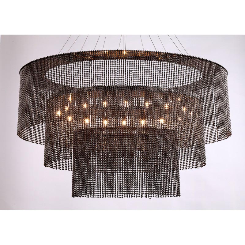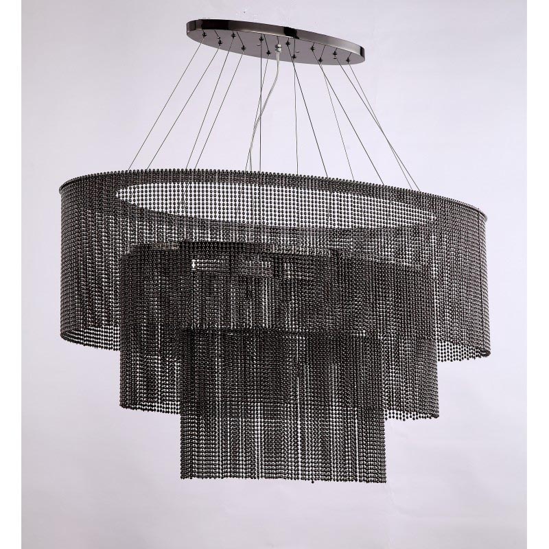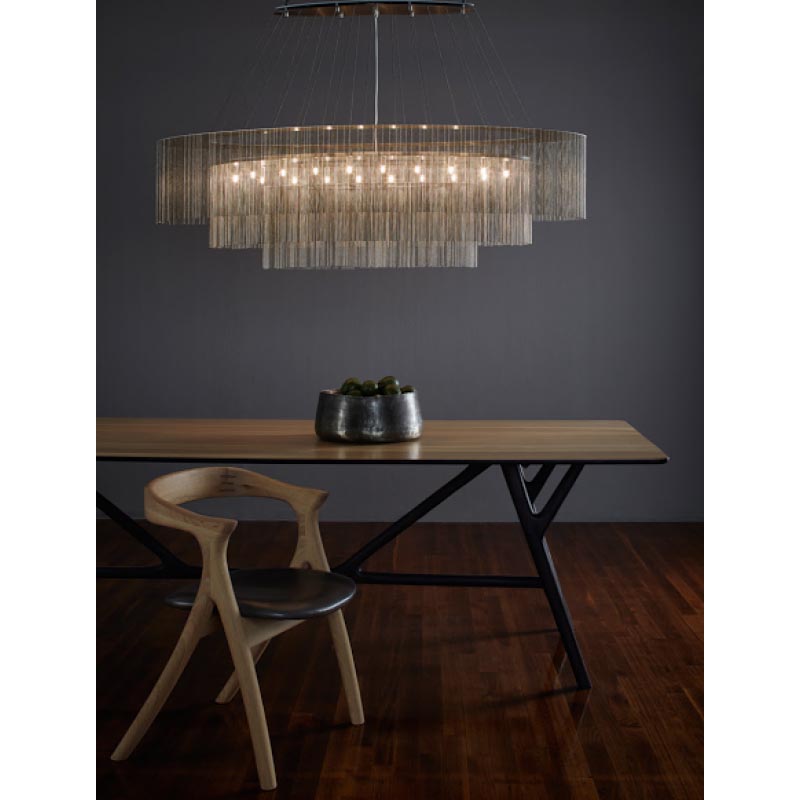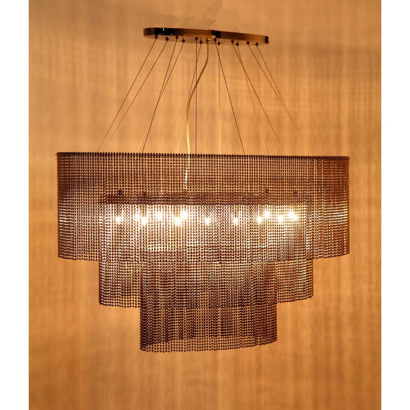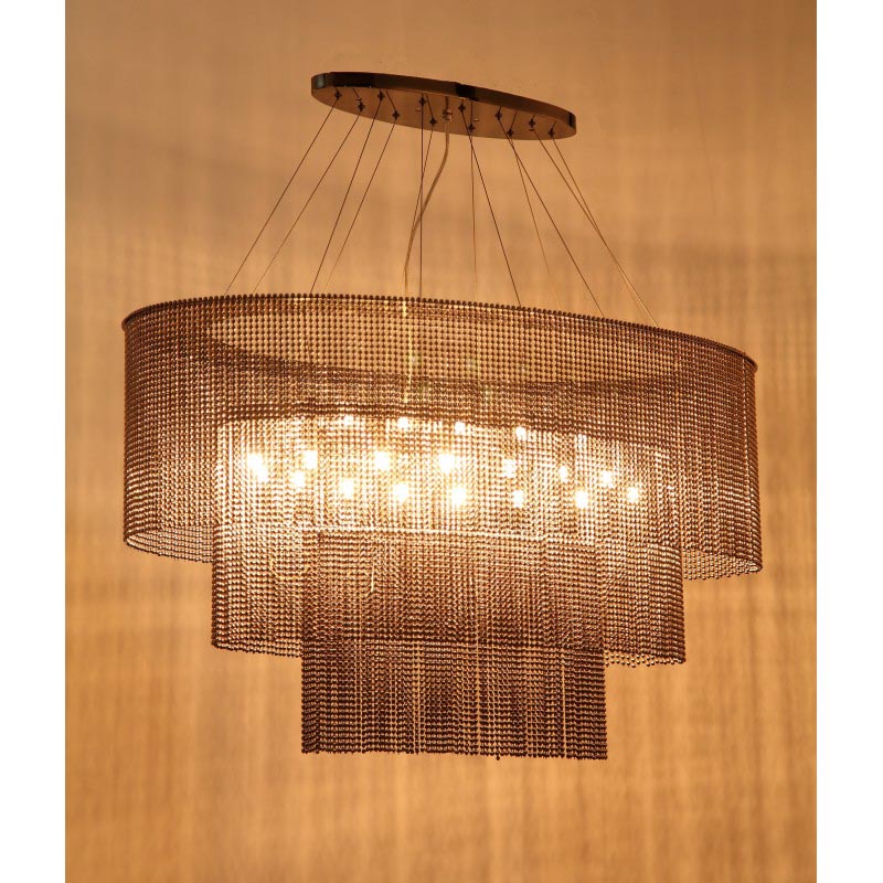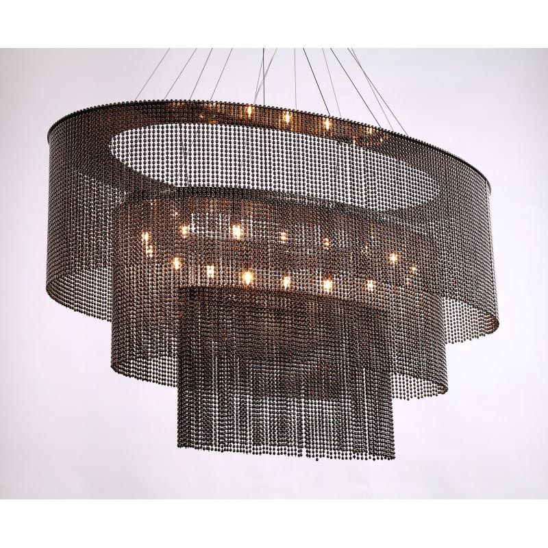 A suspended chandelier based on a modern classic chandelier design. An arrangement of three semi transparent elliptical volumes, made from laser cut stainless steel frames, chrome plated or lacquered. Composed of solid brass, illuminated by 18 surface mounted G9 Halogen or LED lamps.