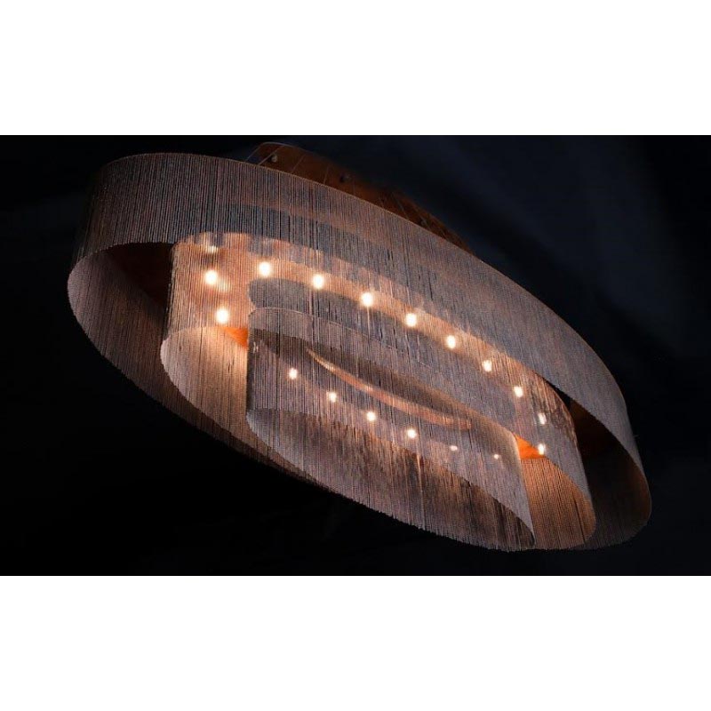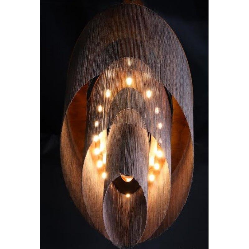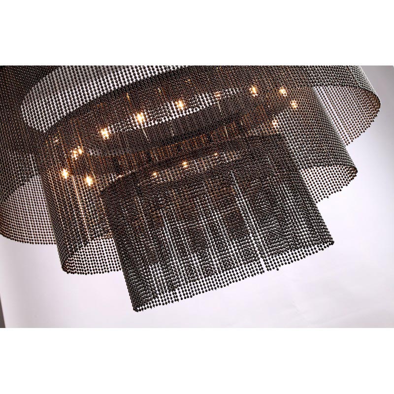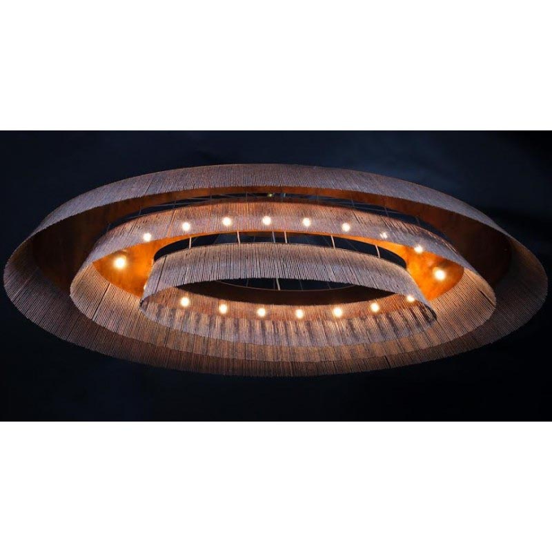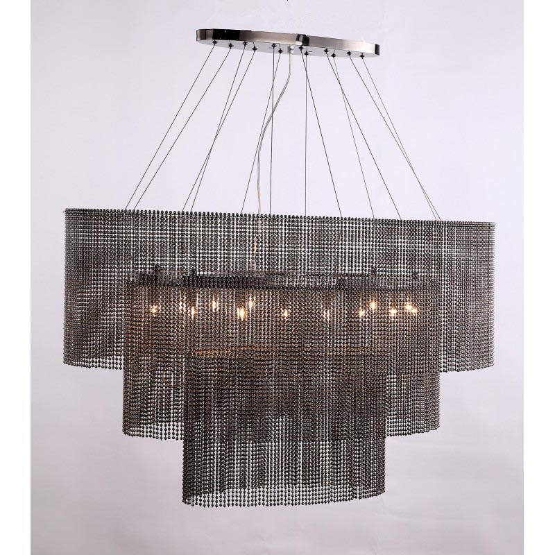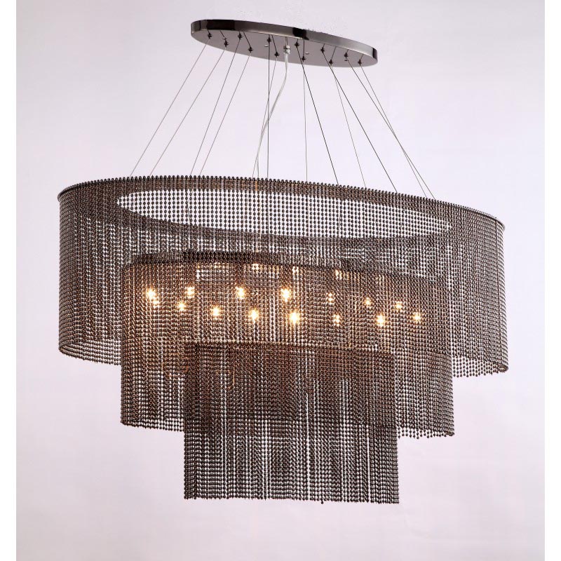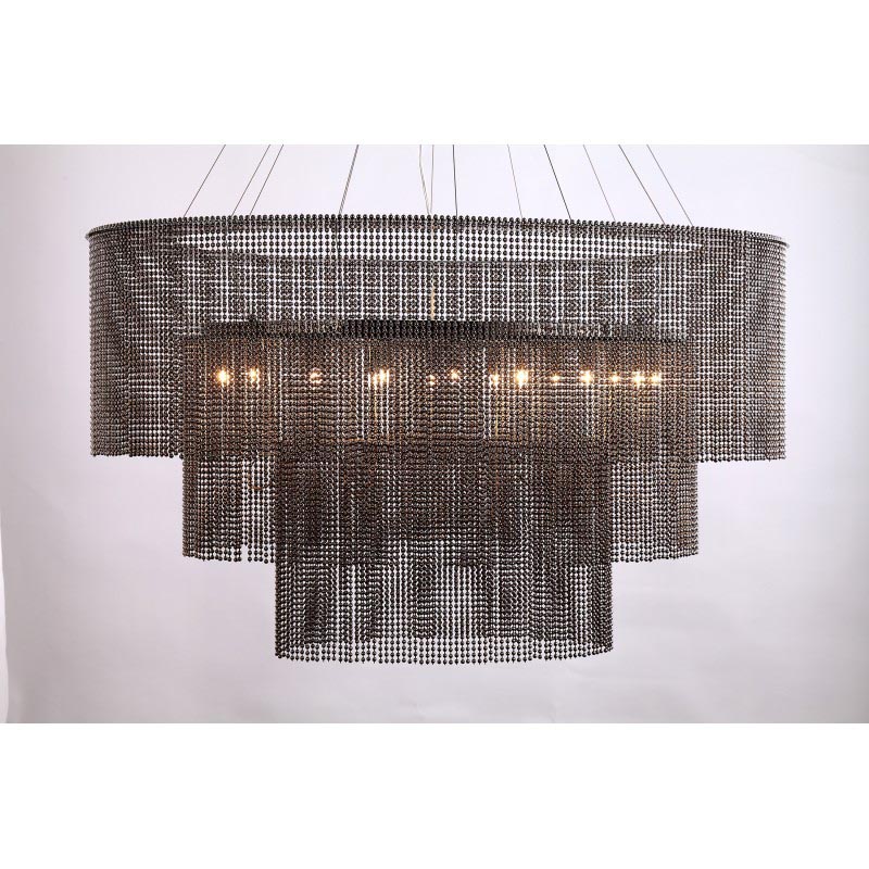 A suspended chandelier based on a modern classic chandelier design. An arrangement of three semi transparent elliptical volumes, made from laser cut stainless steel frames, chrome plated or lacquered. Composed of solid brass, illuminated by 18 surface mounted G9 Halogen or LED lamps.