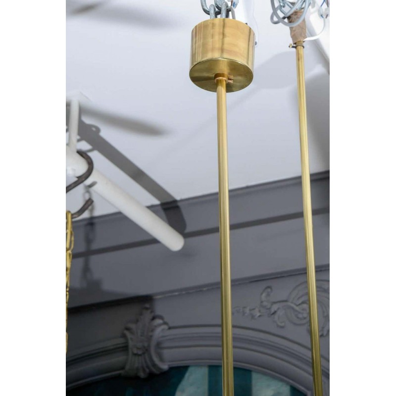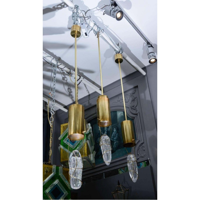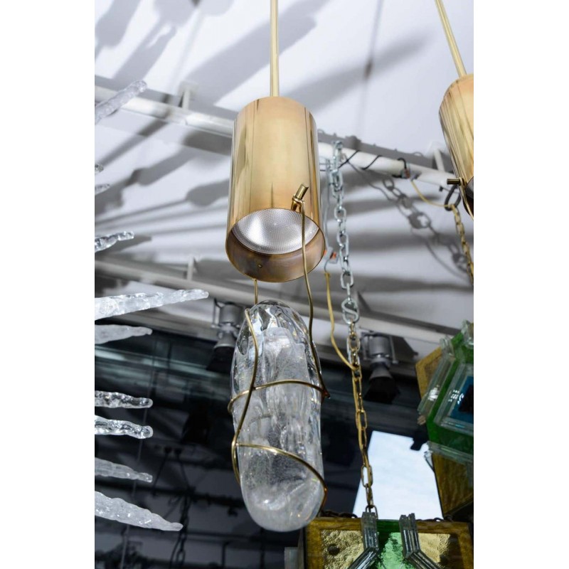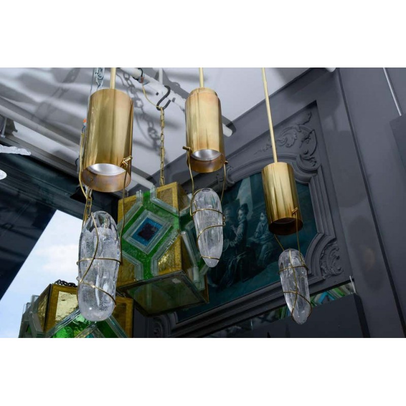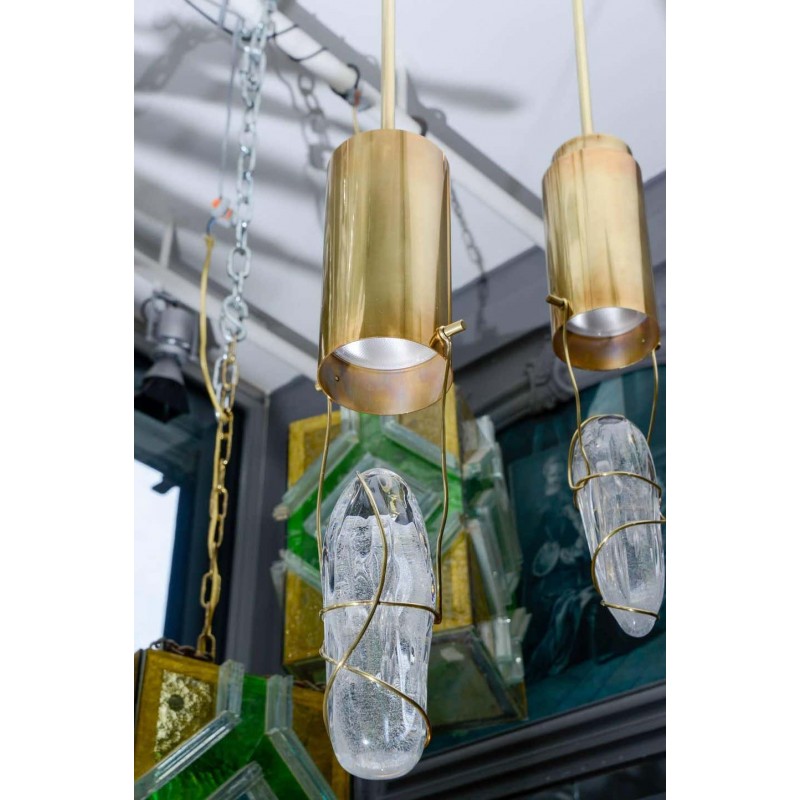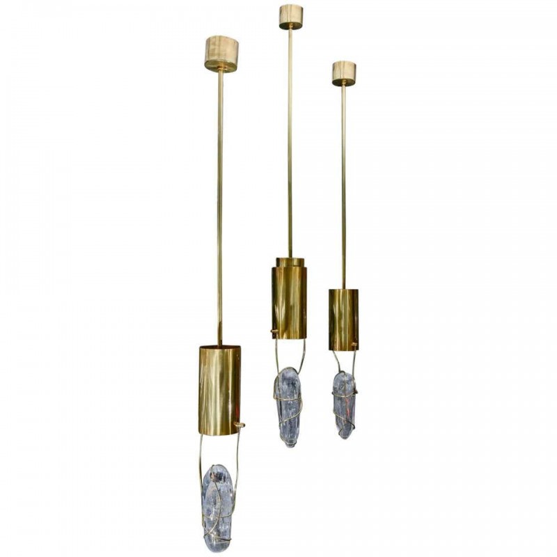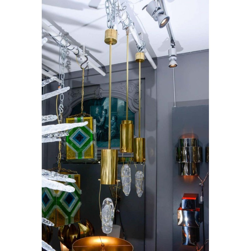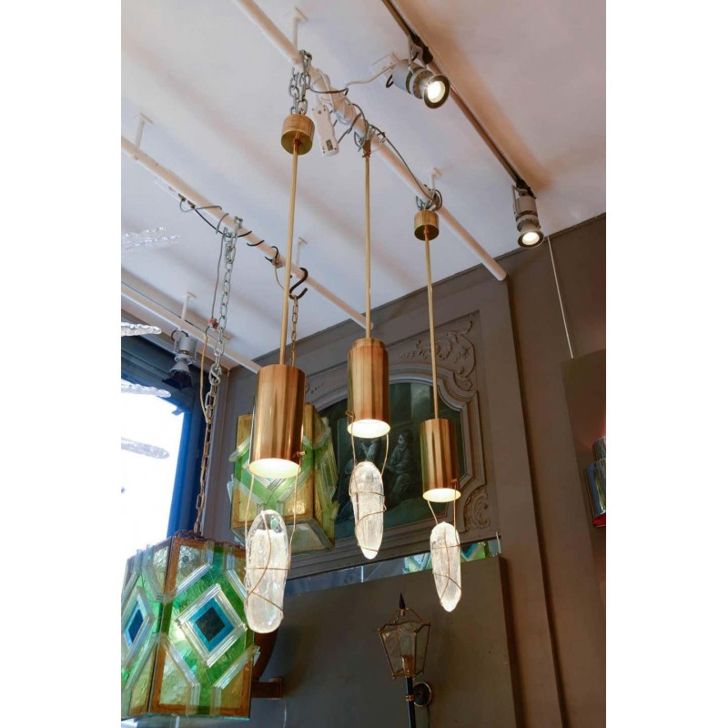 Set of three supernova pendants designed by Angelo Brotto for Esperia. Made of brass, each suspension hold a Murano glass "rock" that diffuse the light.