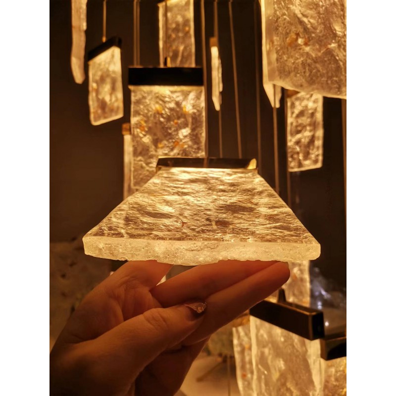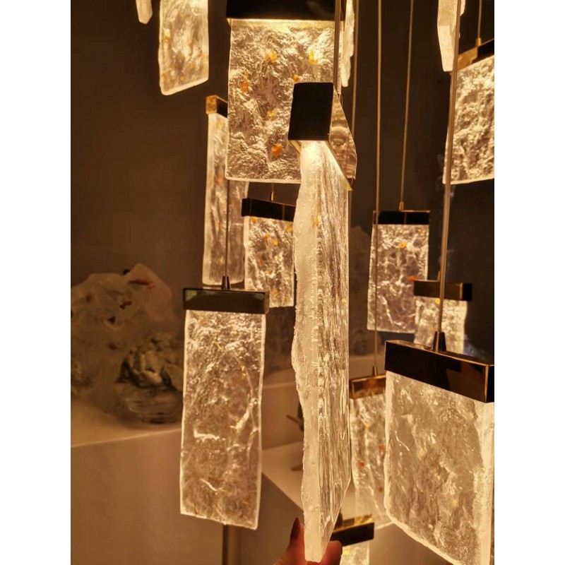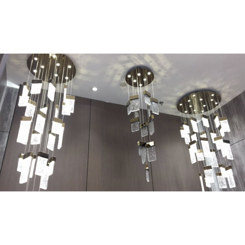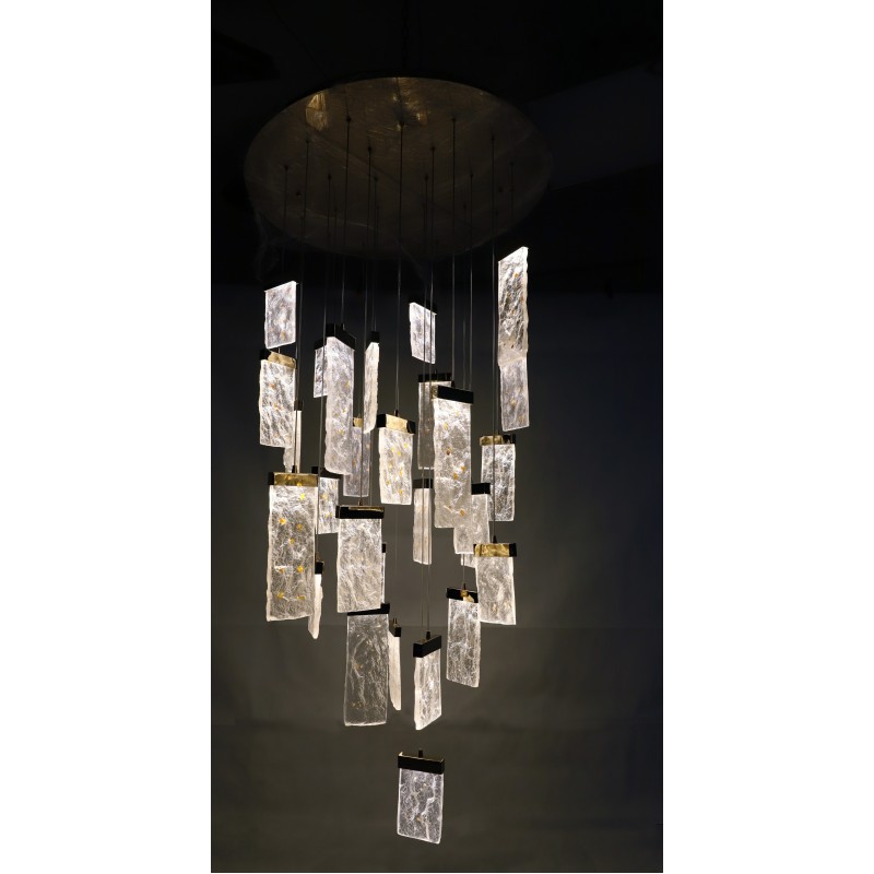 Original one of a kind chandelier. No two alike, each chandelier created from this design is a one of a kind. This hanging light looks interesting from every angle, and creates enticing shadows. One of the most technical chandeliers created. We approach this sculptural object in a contemporary, unexpected and creative way. Light and shadow interplay while existing harmoniously, using both to manipulate space and thought.