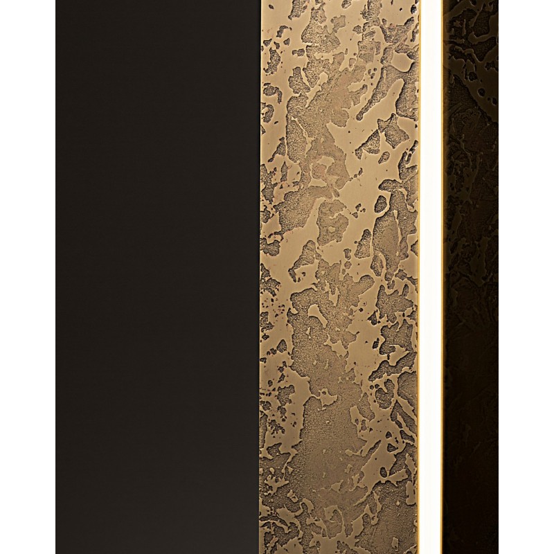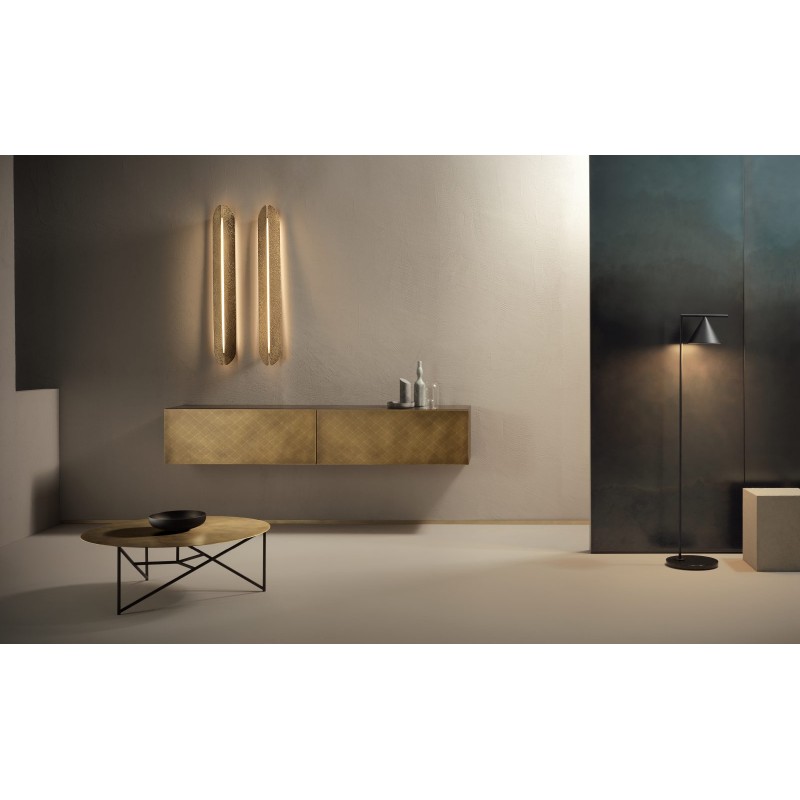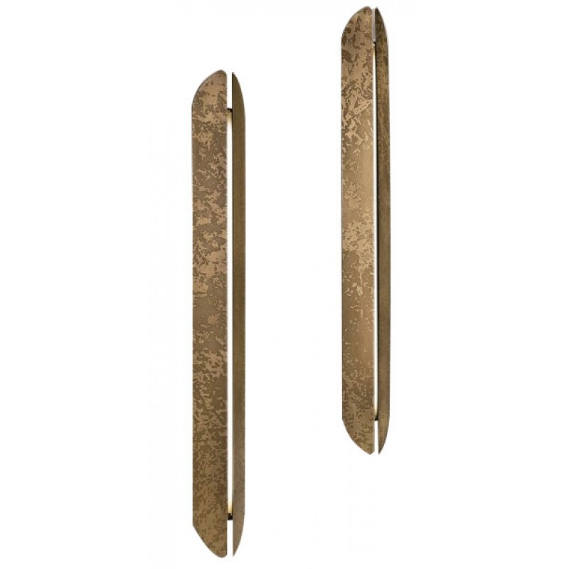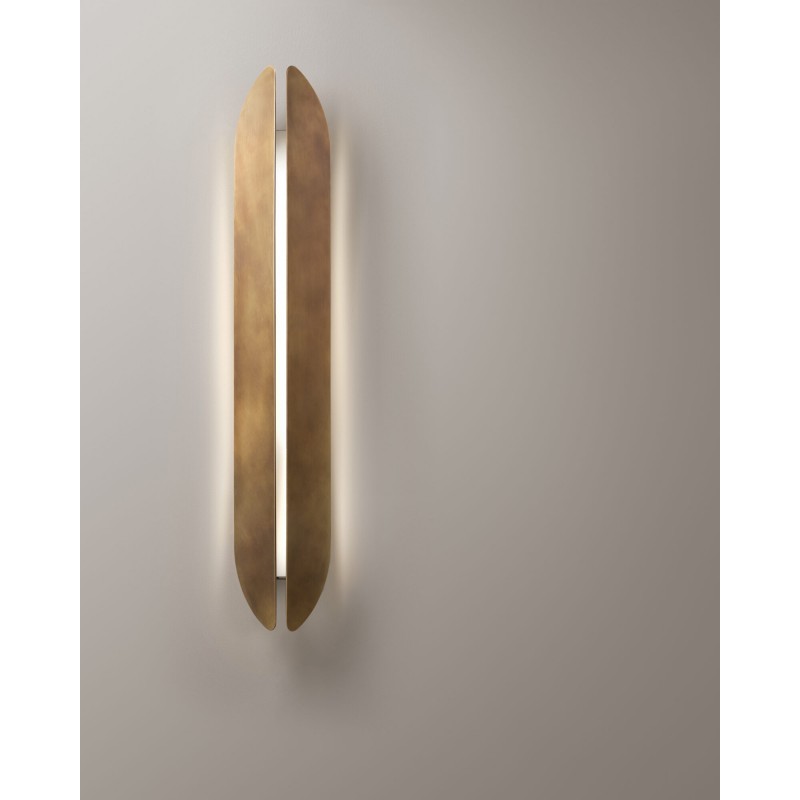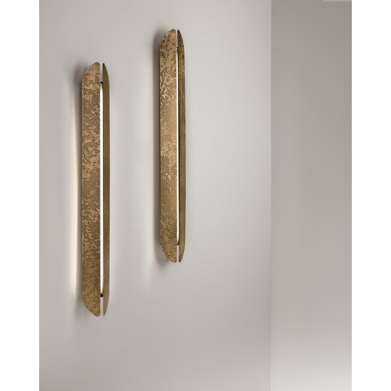 The Aare Gorge in Switzerland is testimony to natural erosion, shaped by the last ice age. Here, a river originating from melting glaciers once carved deep into the rock, cutting to its core. Thus, little by little, light began working its way into the cracks, amid ancient limestone stratification. The manual erosion technique used on the sheet metal of Aare is its modern echo, recreating the natural look of the rock along its surfaces. Thanks to a centre slit, these wall sconces take on the archetypical form of earthly geography sculpted by ice, reproducing its prehistoric beauty, as if they too were forged centuries ago.