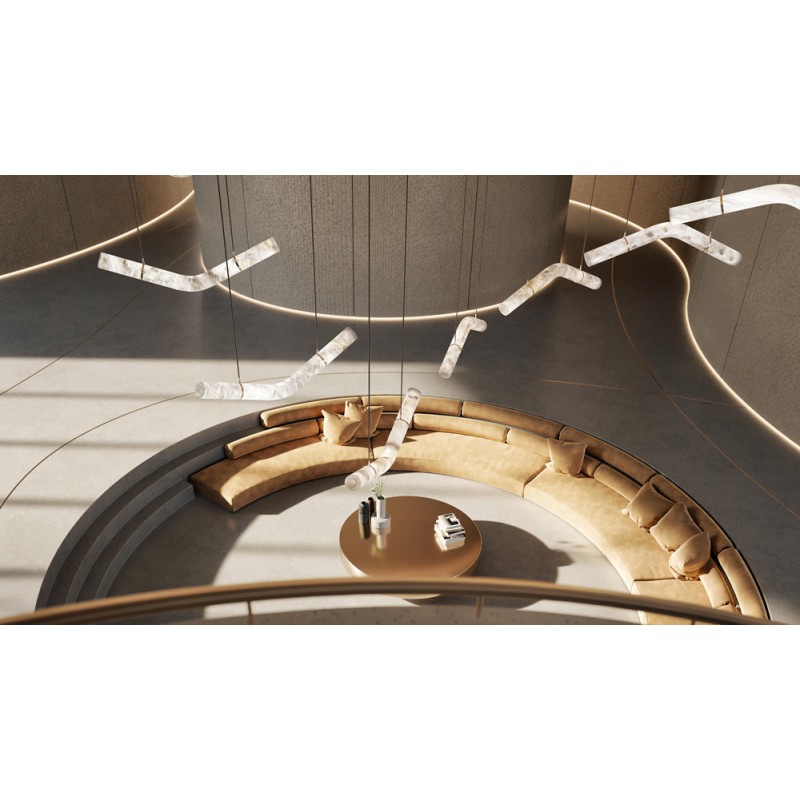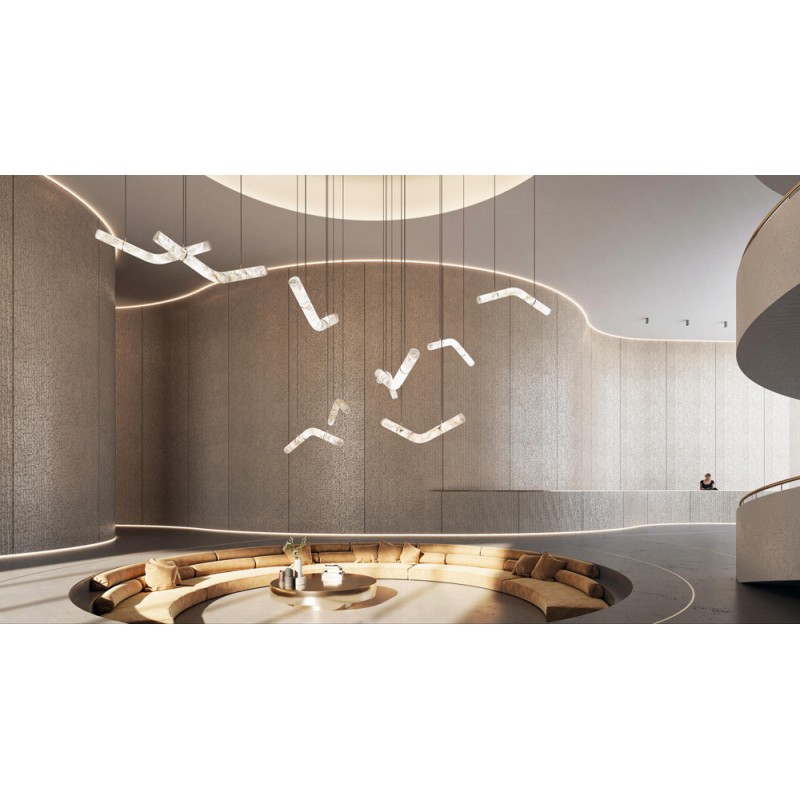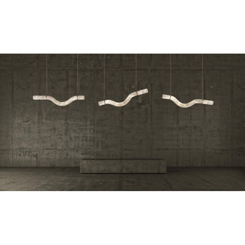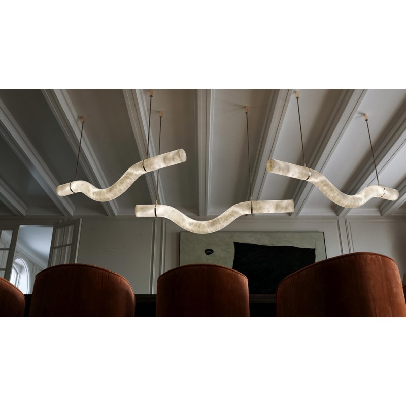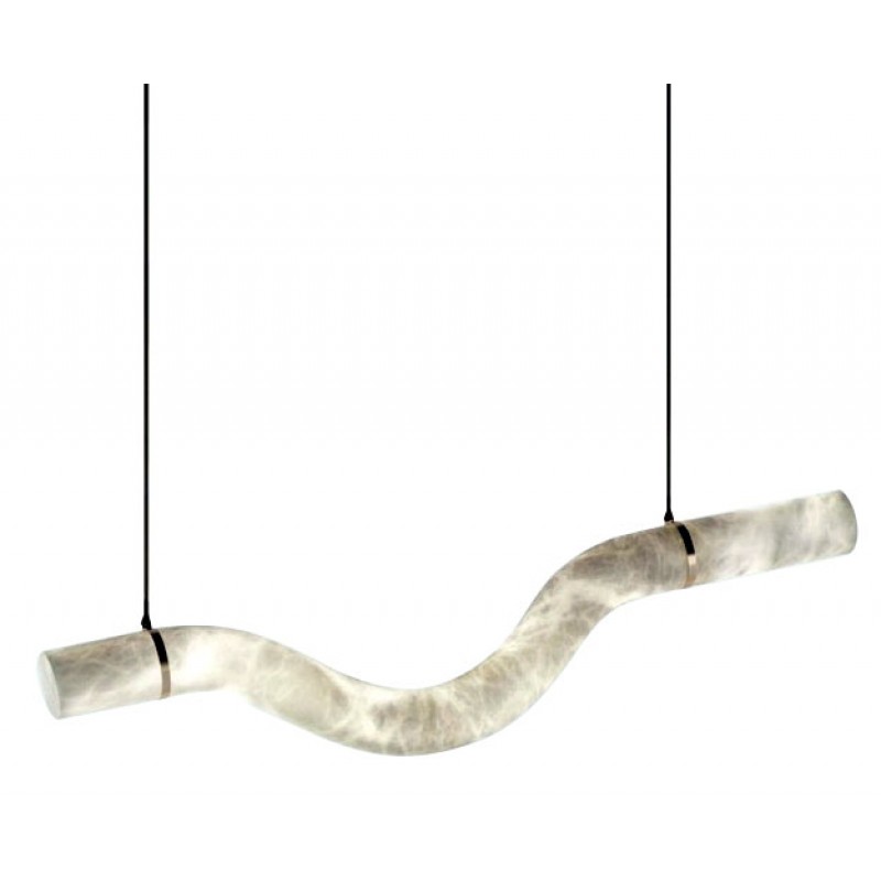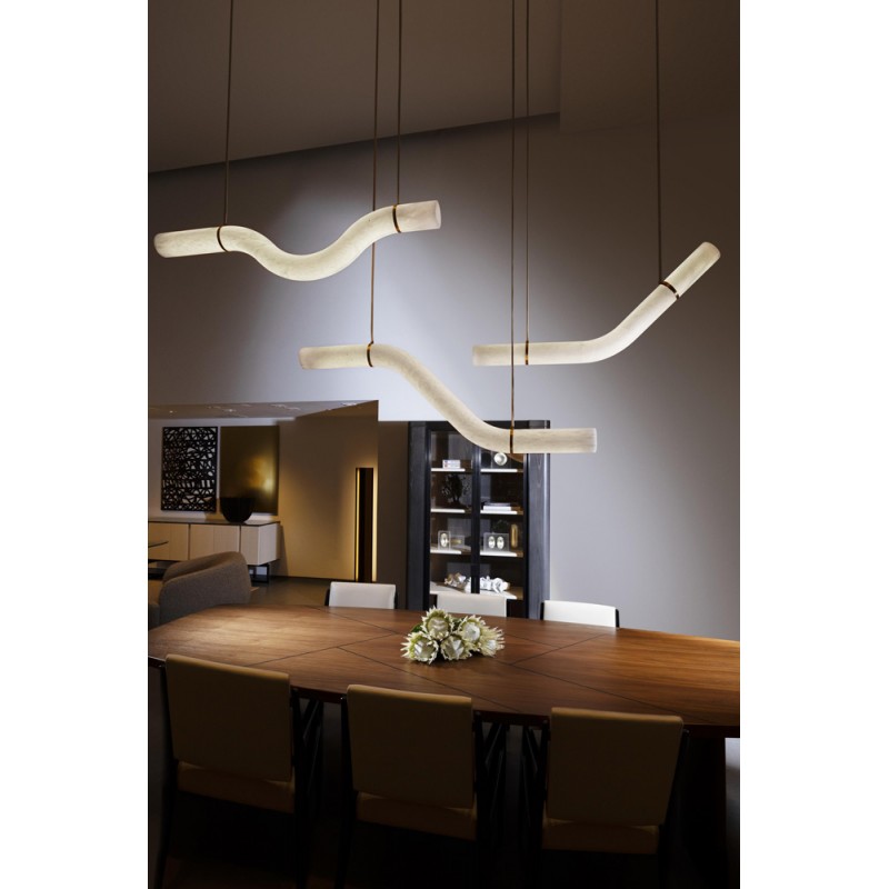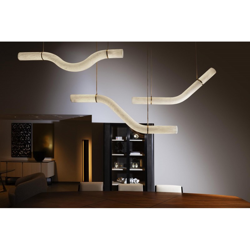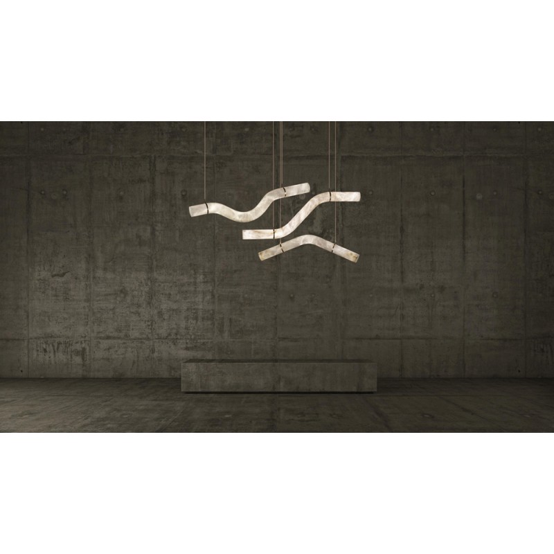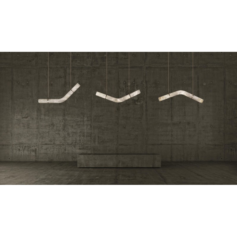 Hanging from leather-covered steel cables, the Liberty Hanging Light introduces movement and shape to the space above a room while diffusing a soft, ambient glow. Whether hanging on its own, in a pair or as a complete trio, the alabaster pendant presents a dialogue between form and function, design and art, space and light. Alabaster is a natural stone and will have a great deal of variation in the coloring and natural veining running throughout the stone