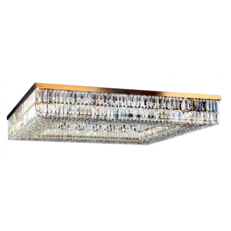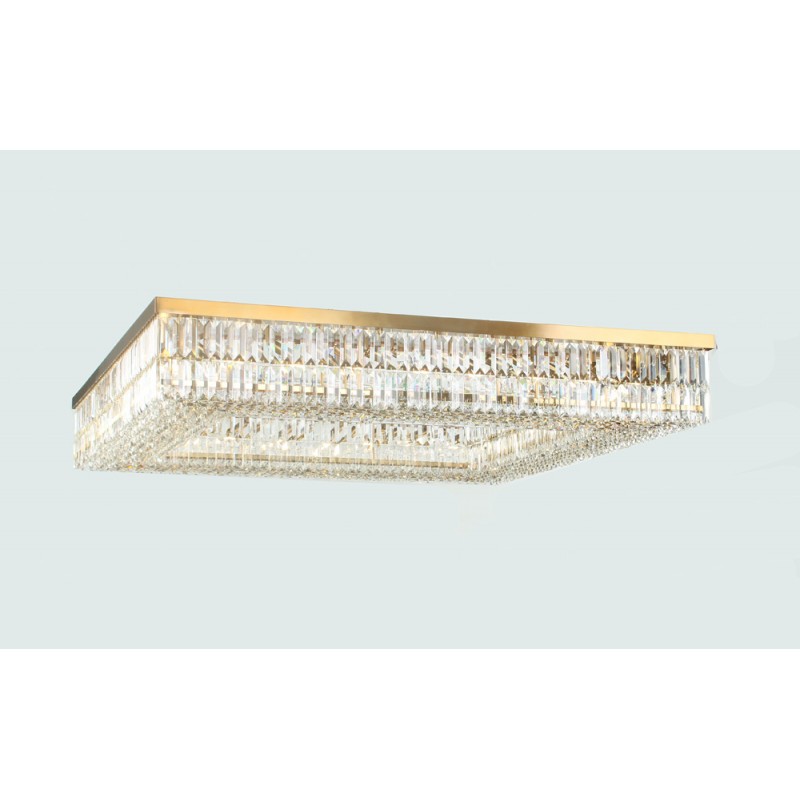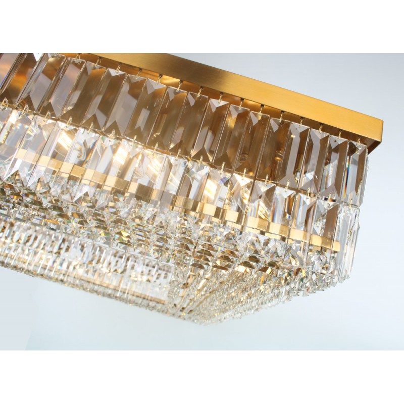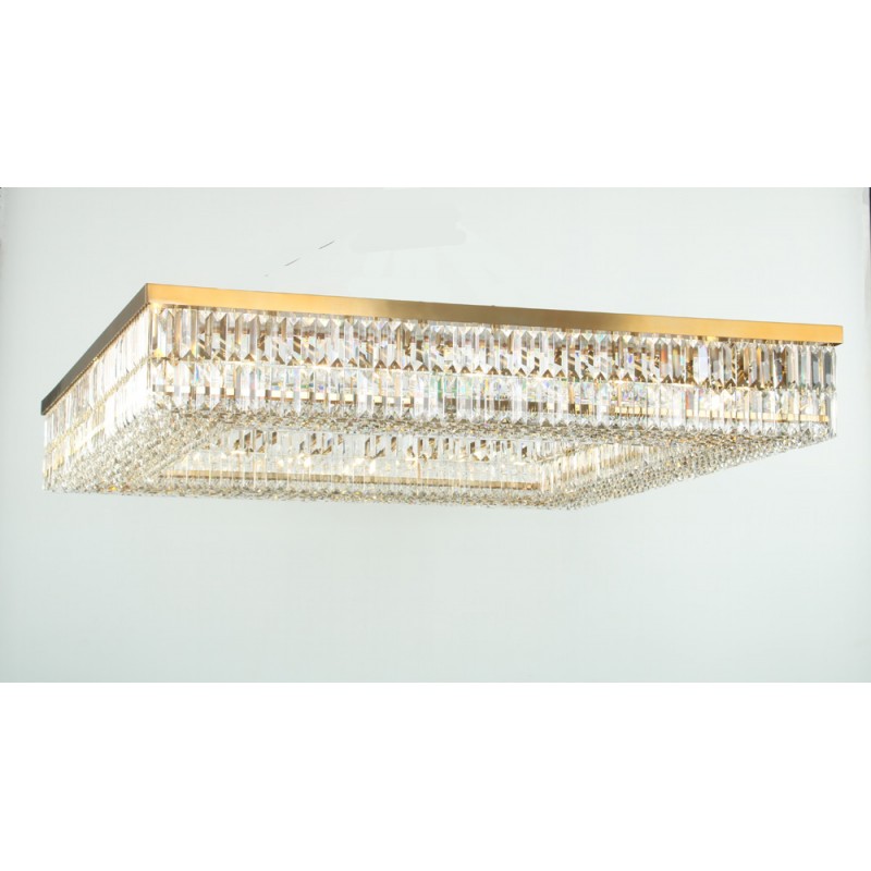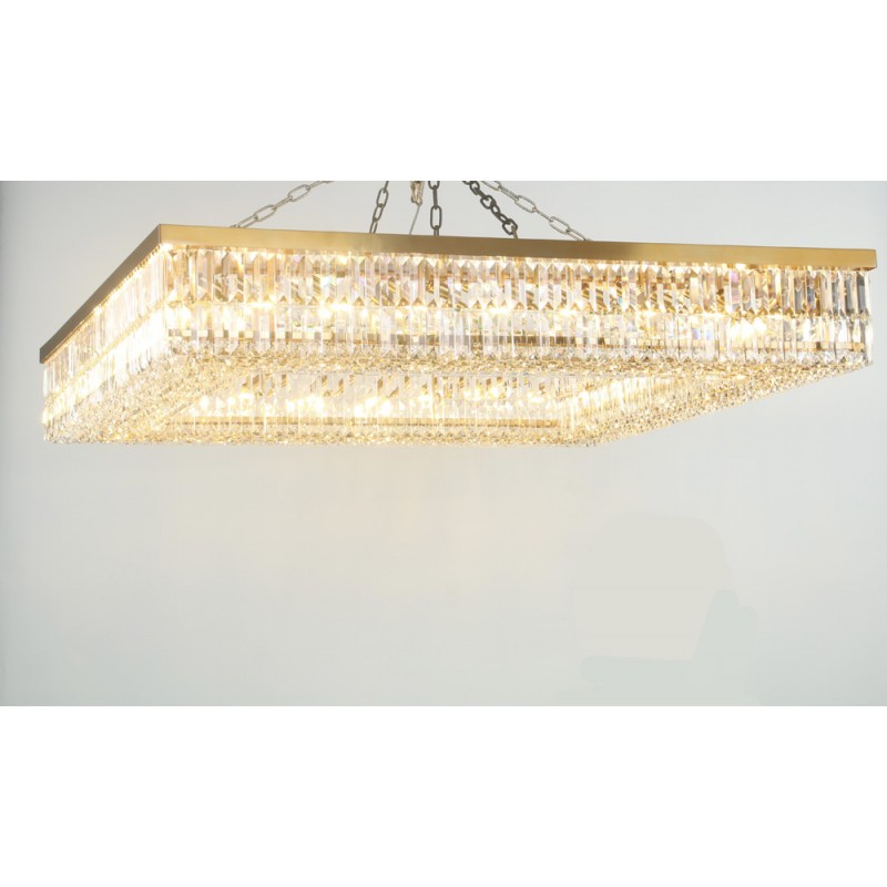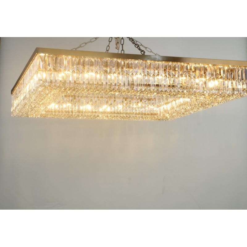This chandelier is a unique display of chic design and modern innovation at its finest. The rediscovery of crystal glass as a conductor of magical, rare light has pushed designers to define creation within a repertoire of making each piece an original work. The natural and precious nature of this crystal glass becomes the first argument for its seductive illumination. Its size is the second. This chandelier features a gold-plated finish frame that is adorned the finest of high-quality 30% LED baguette crystals over every inch of the fixture. Its stunning, rectangular shape gives it a modern edge and the crystals add just the right amount of shimmer to bring to your company a piece that is eye-catching, but not overbearing. In addition, the lovely golden hue is sure to cause many second glances and even more compliments.