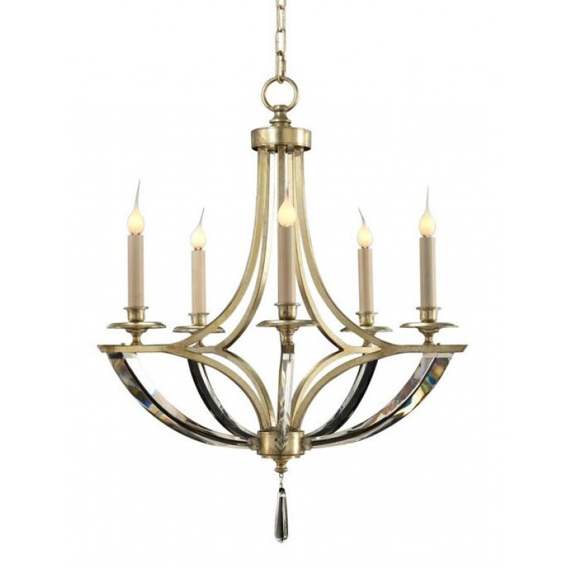 Bent-Crystal Five-Light Chandelier This chandelier has a silver-leaf finish and a bent-crystal body, with a hanging crystal finial. Original One of a Kind Design Chandelier. No two alike, each chandelier in this design is a one of a kind. This hanging light looks interesting from any angle, and makes nice shadows. One of the technically most particular chandeliers created. We approach this sculptural object in a contemporary, unexpected and creative way. Light and shadow interplay and exist together, there is a subtlety of using both to manipulate space and thought.