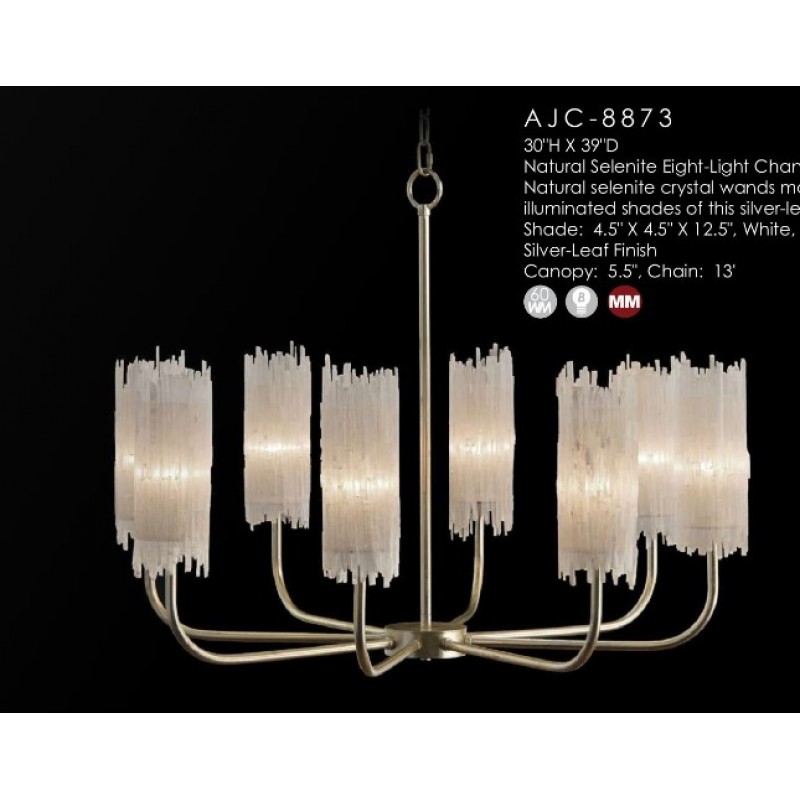 Natural Selenite Eight-Light Chandelier Natural selenite crystal wands make up the stunning illuminated shades of this silver-leaf chandelier. Because our lighting are made by a workforce that still relies on traditional working methods, each product is unique and carries with it sensitivity of the artisan. Attract attention, provoke emotion to what the imagination with games of light and matter, such as the ambition and the creative spark of existing elements of the space.