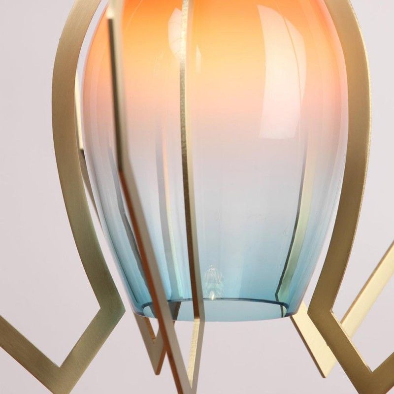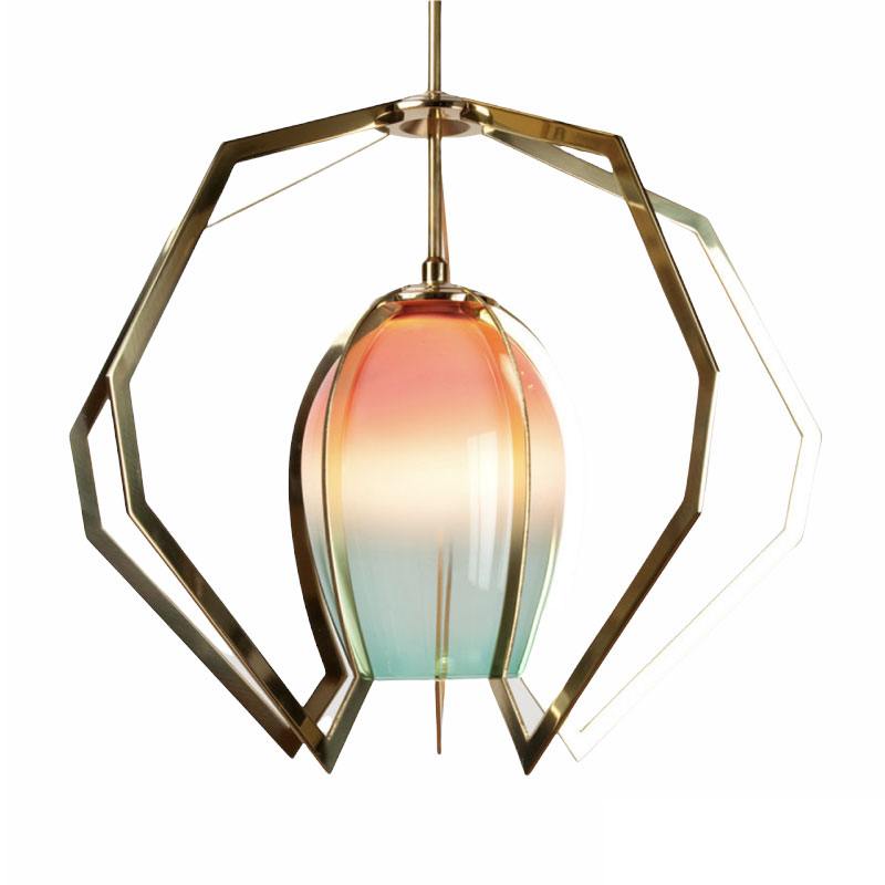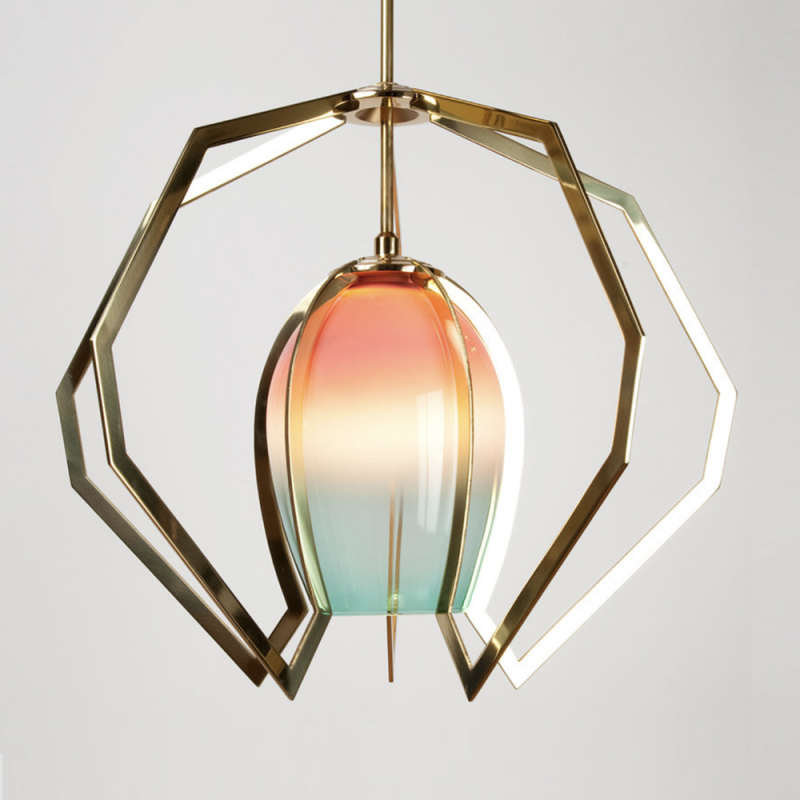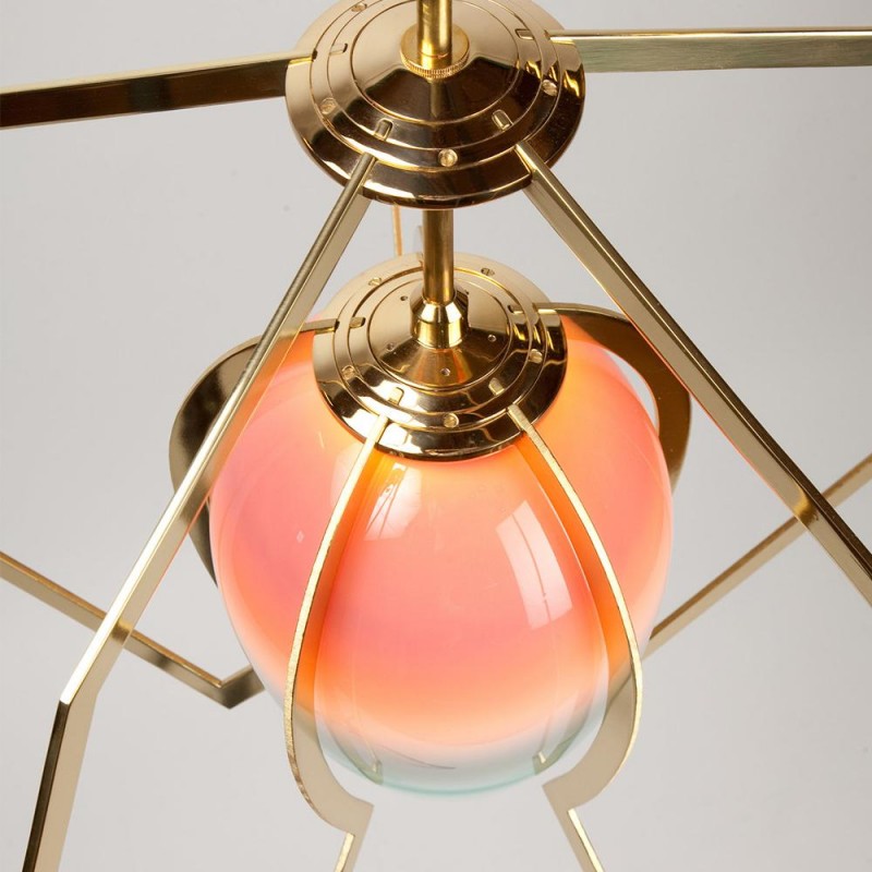 Vise captures a hand-blown glass globe within brass claws that are machined to follow the glass’s gentle curvature. The light source is set high inside the globe, creating a soft glow that gradually fades towards the opening.  Vise is shown here in a special double-fade glass that mimics the nuances of a sunset.
