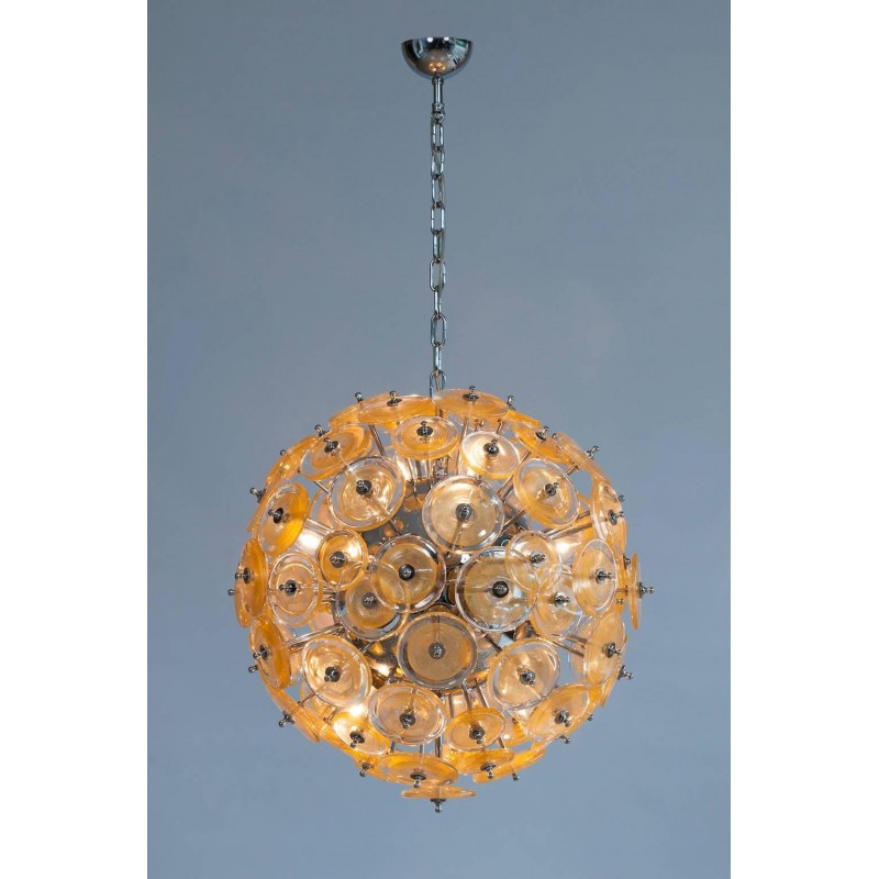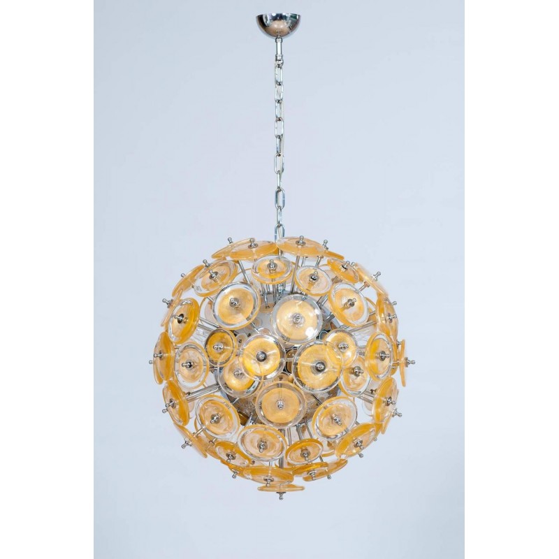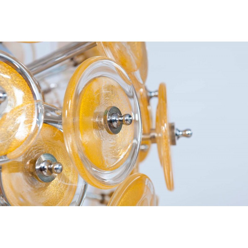 Amazing and spectacular Italian Venetian Murano Glass Sputnik Chandelier, attributed to Mazzega circa 1970s. Composed of circular elements in transparent glass with circular submerged gold shapes in the middle. All supported by chrome frame.