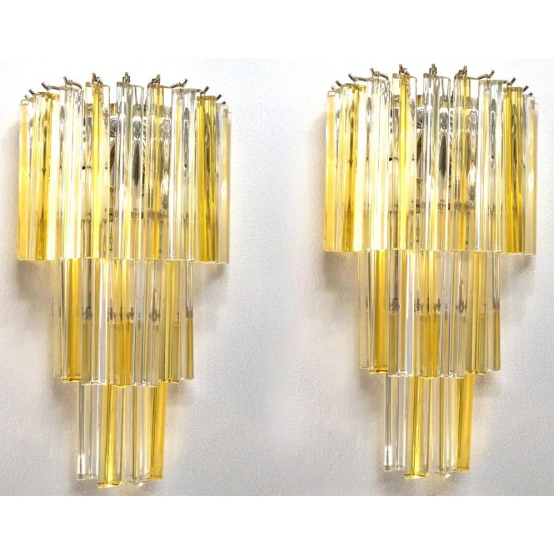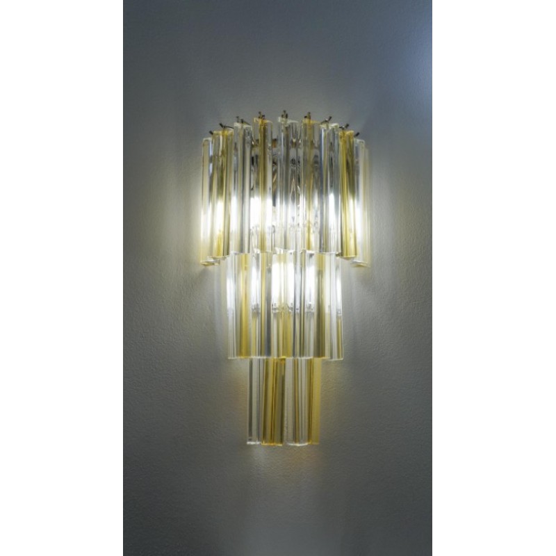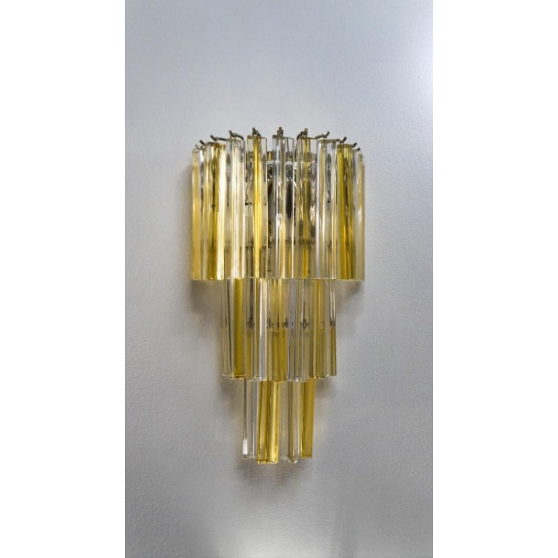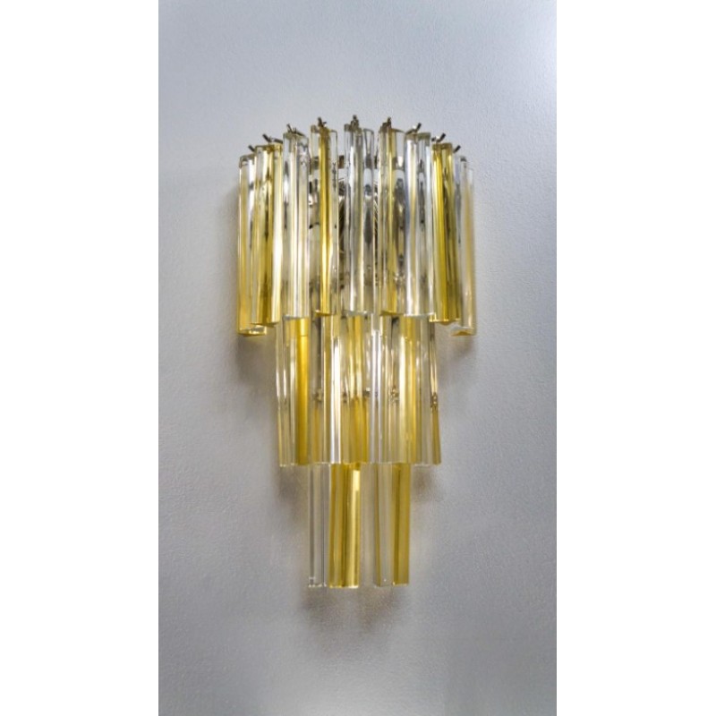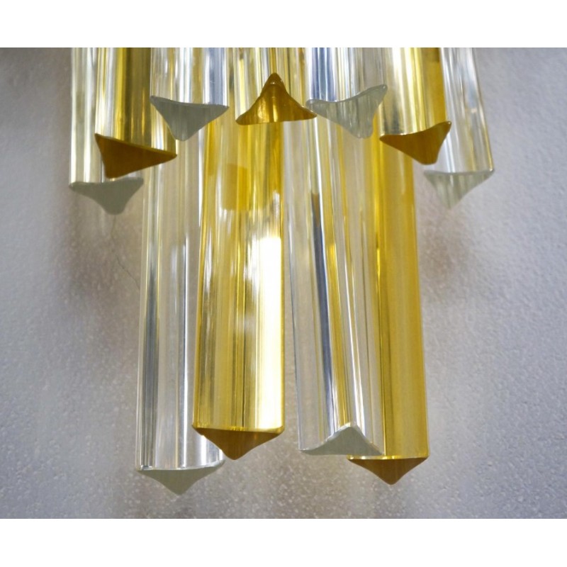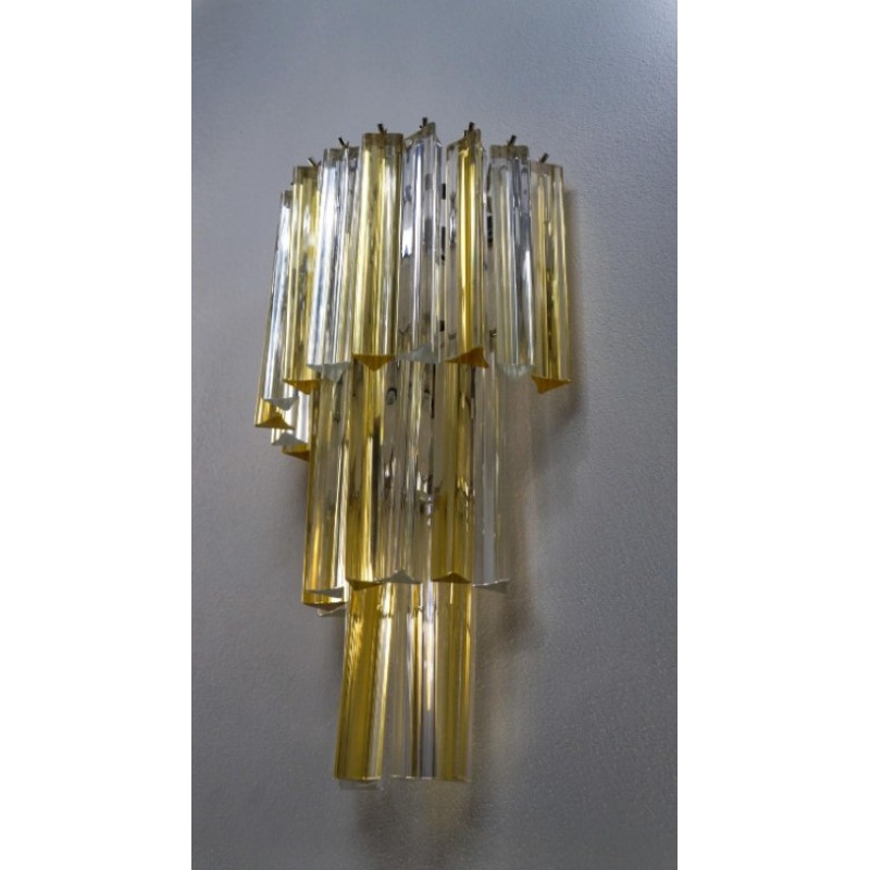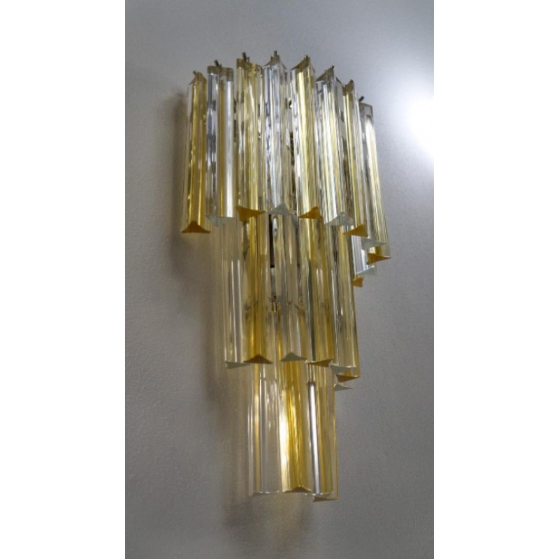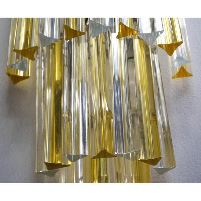 This applique was designed in 1981 and was later attributed to Venini. Composed of three levels of glass elements called "Triedri", the applique has 22 elements, which alternate with shades of amber and crystal, illuminated by three light bulbs.
