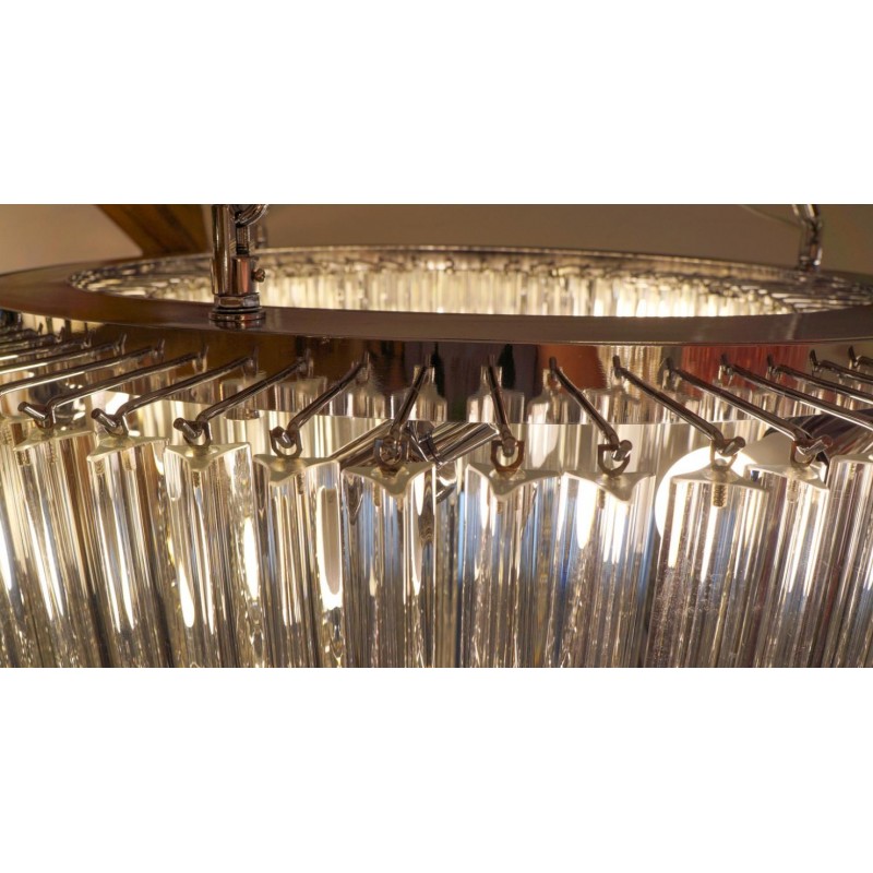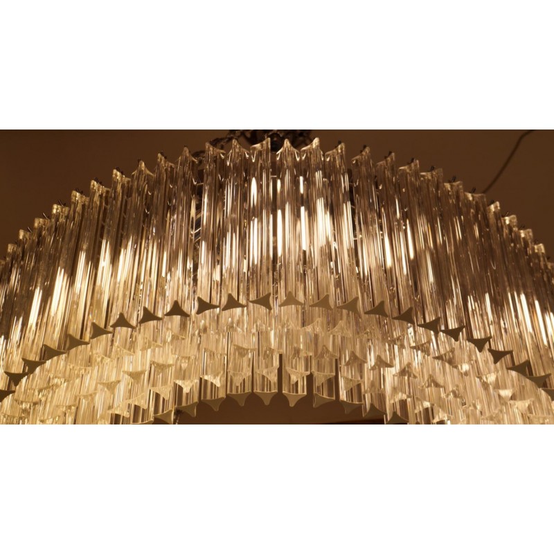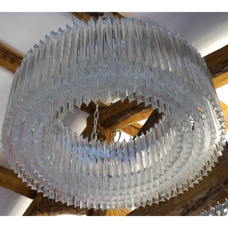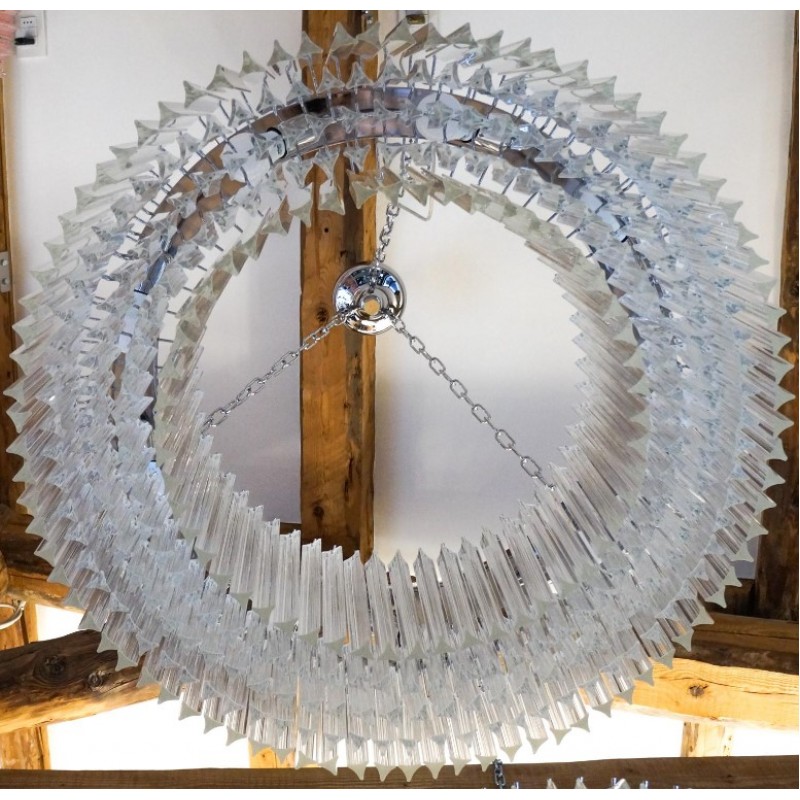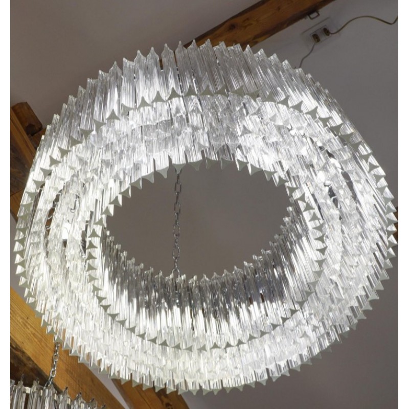 Murano glass chandelier with 370 elements in crystal, nickel finish structure and nine E26 / E27 bulbs. The elements of this typical chandelier are called Triedri, for its triangular shape. The assistants take a small quantity of glass from the oven. Being its consistence like honey it gives the possibility to stretch and shape it. The whole sophisticated design based on the repetition of the glass elements called "Triedri".Attributed to Venini in 1996.This magnificent work will give light to any environment, spreading elegance and warmth. The original design can create fascinating lighting.